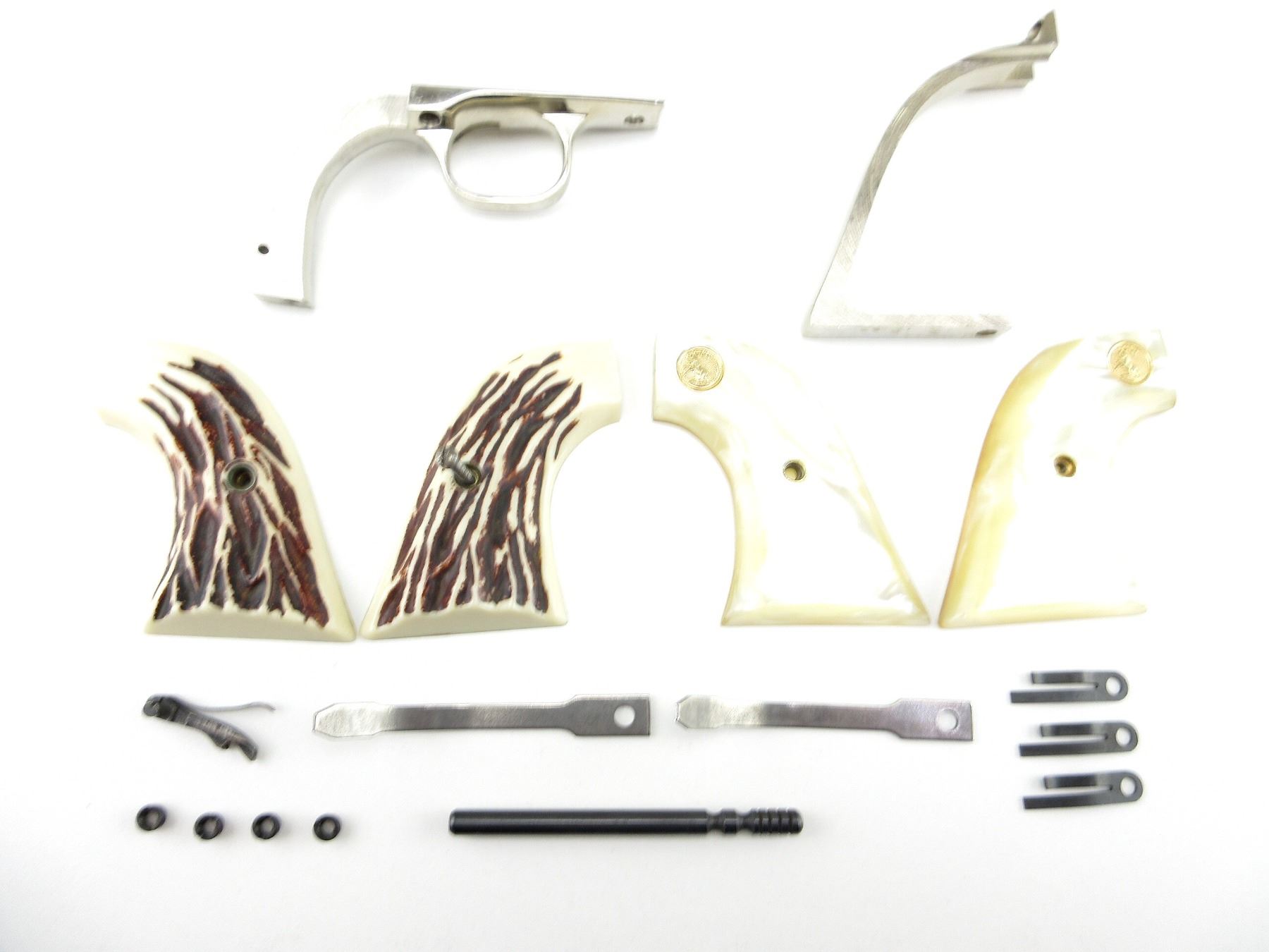 LOT INCLUDES; (1) SET OF COLT SMOOTH GRIPS, NO SCREW, (1) SET OF GROOVED POLYMER GRIPS, WITH SCREW, SEAR / HAND SPRINGS, MAIN SPRINGS, TRIGGER GRAD & BACK STRAP, ETC. MAY REQUIRE FITTING. SEE PHOTOS.