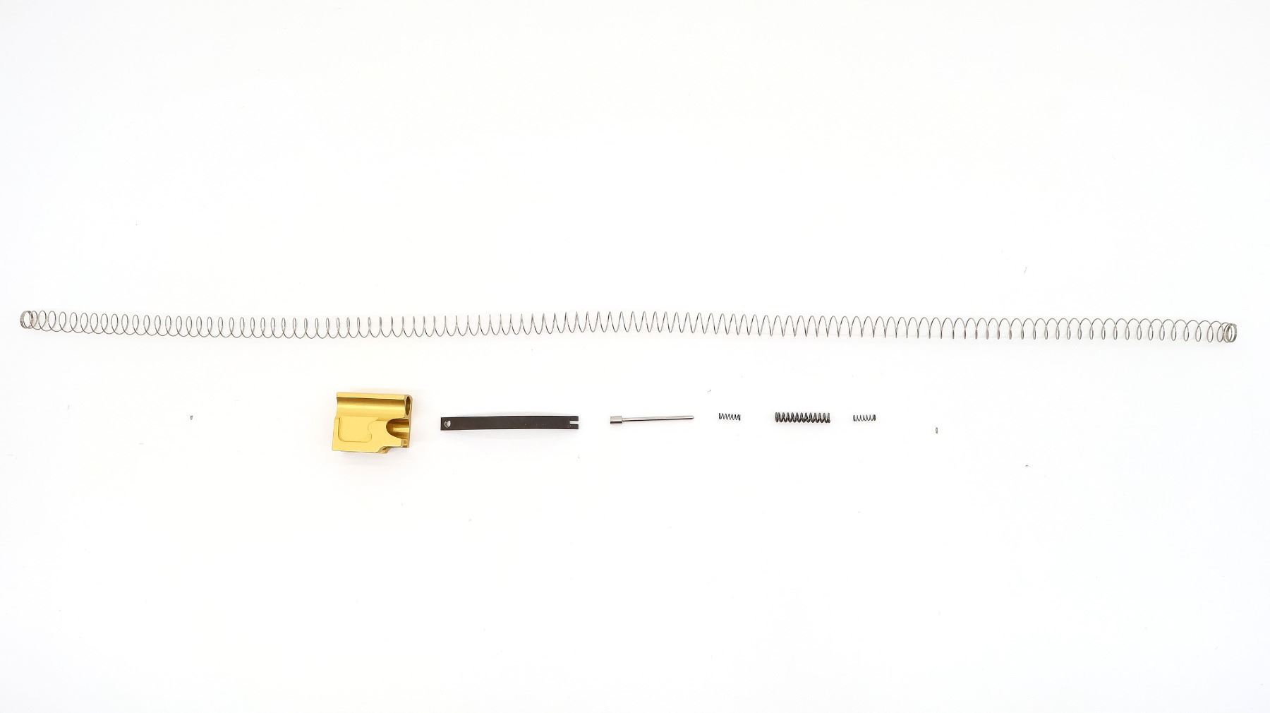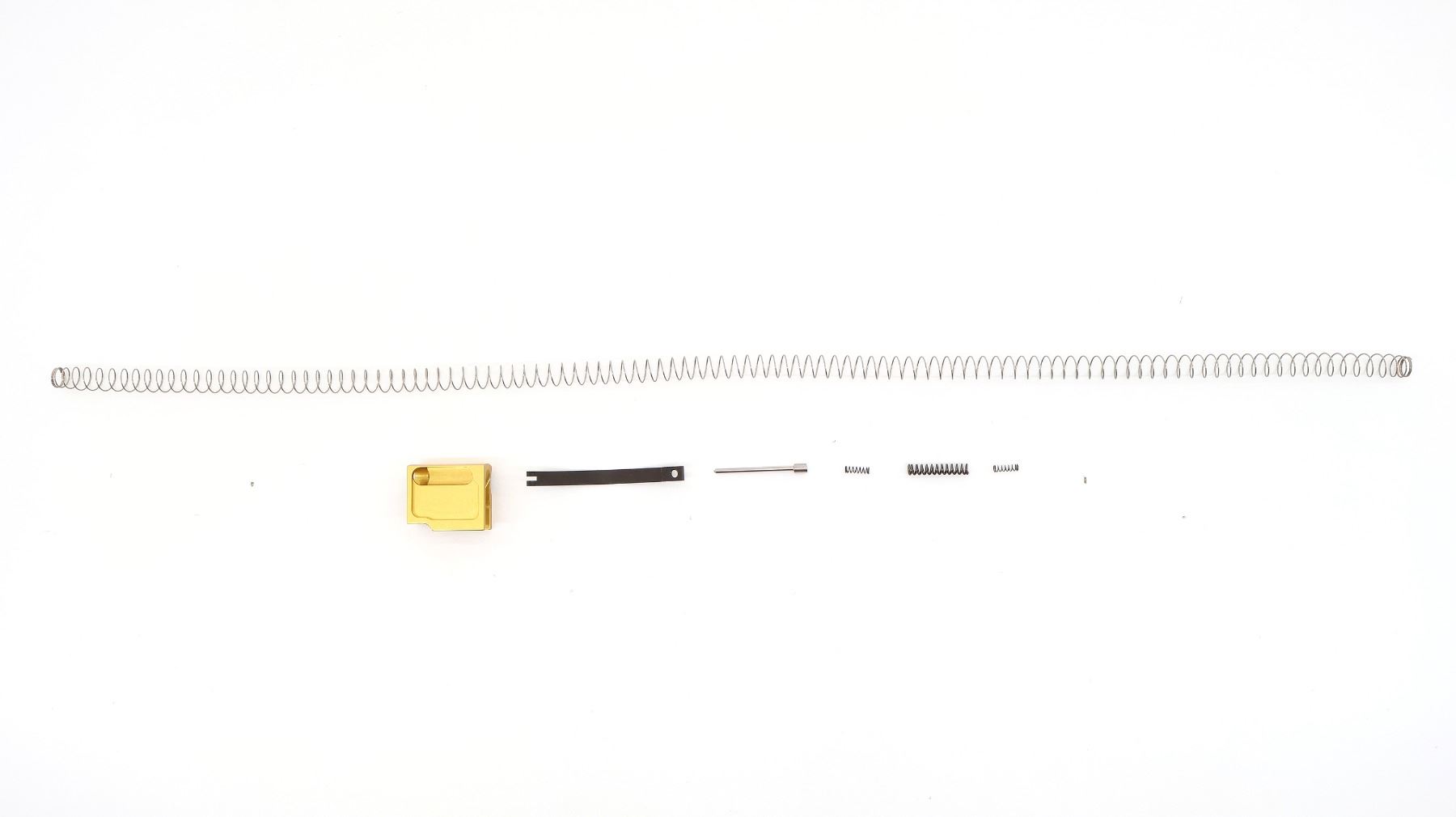 LOT INCLUDES; MAGAZINE TUBE SPRING, OVERALL LENGTH APPROX. 28", HAMMER SPRING, TOOL STEEL FIRING PIN, LIGHT WEIGHT ALUMINIUM SMALL CALIBER CARRIER, ETC. MAY REQUIRE FITTING. SEE PHOTOS.