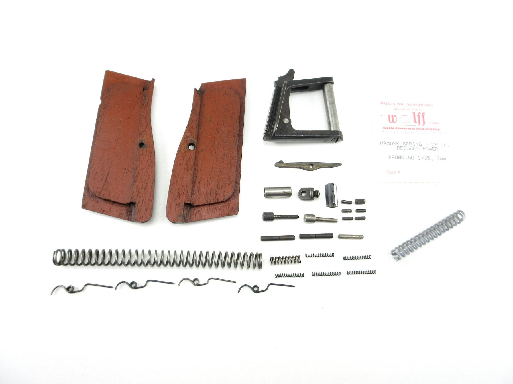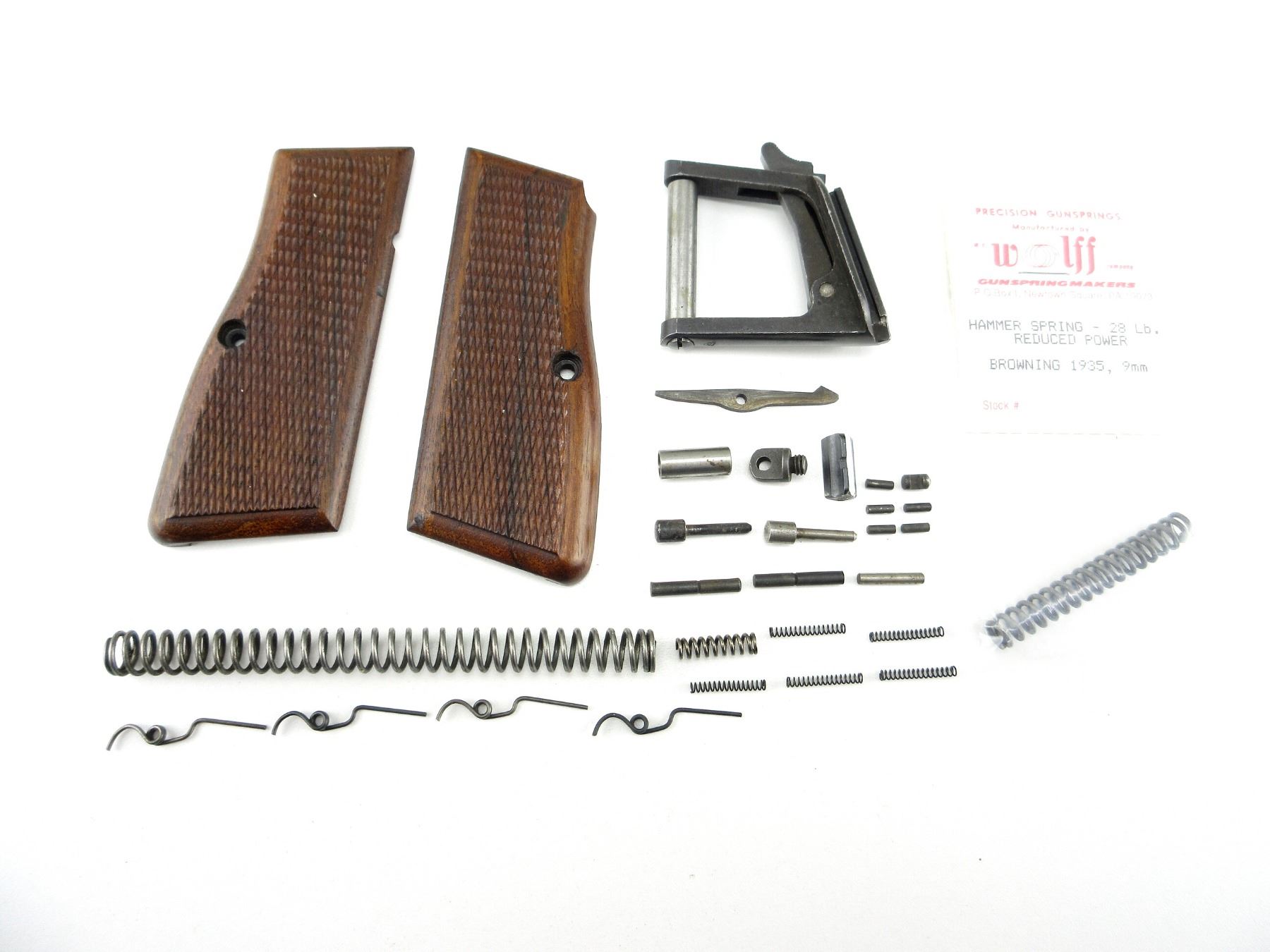 LOT INCLUDES; SEAR BAR, SEAR PIN, TRIGGER SPRINGS & PIN, SAFETY PLUNGER, MAG CUT-OFF SPRING & PIN, RETURN SPRING, CHECKERED WOOD GRIPS, REDUCE POWER HAMMER SPRING, SHOULDER STOCK BRACKET, ETC. MAY REQUIRE FITTING. SEE PHOTOS.