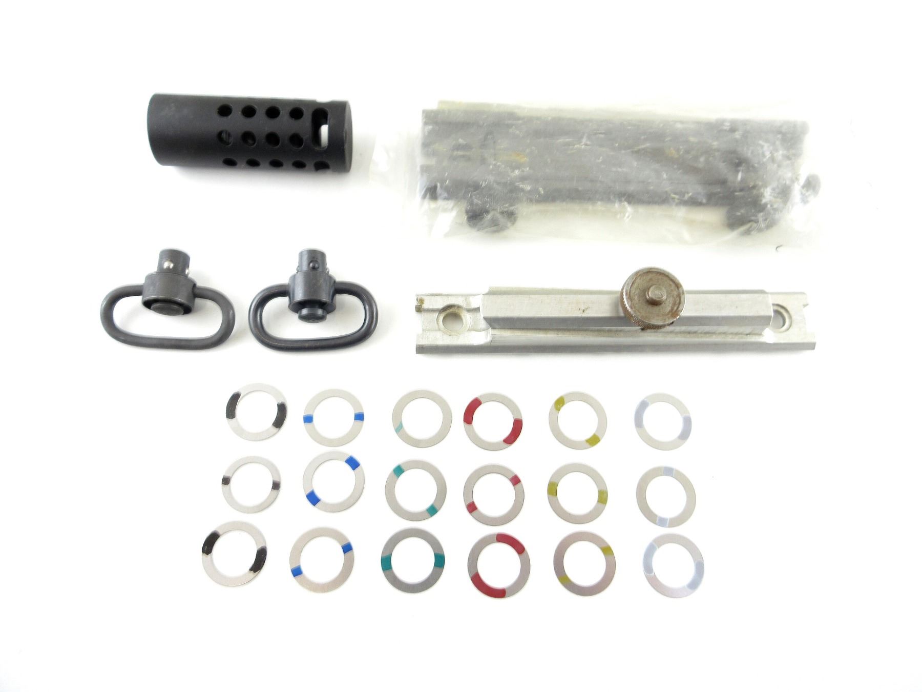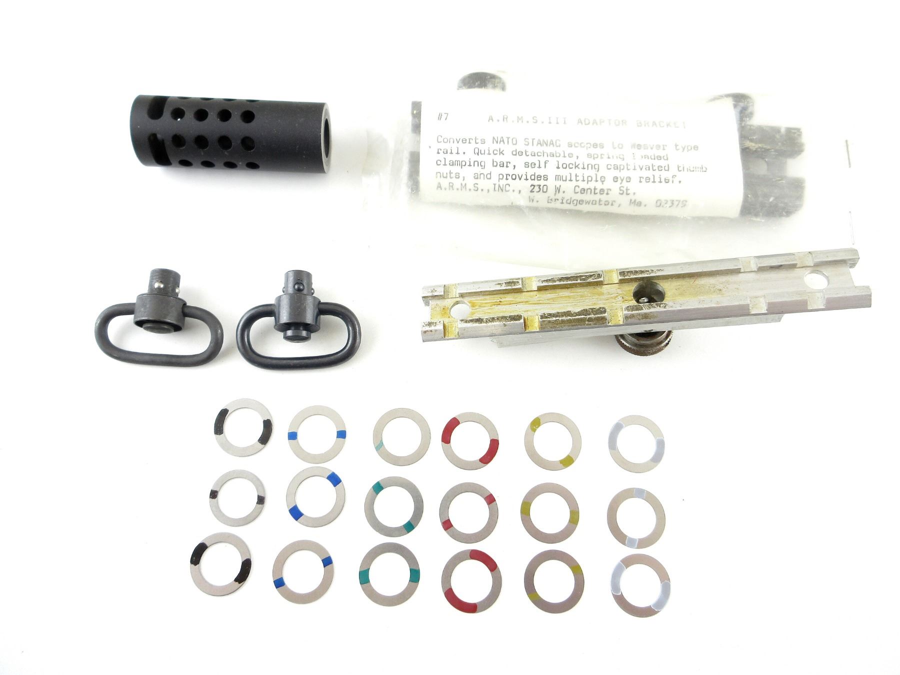 LOT INCLUDES; FLASH HIDER, A2 SCOPE MOUNT, A.R.M.S. III ADAPTOR BRACKET, CRUSH WASHERS, QD SLING SWIVELS, ETC. MAY REQUIRE FITTING. SEE PHOTOS.