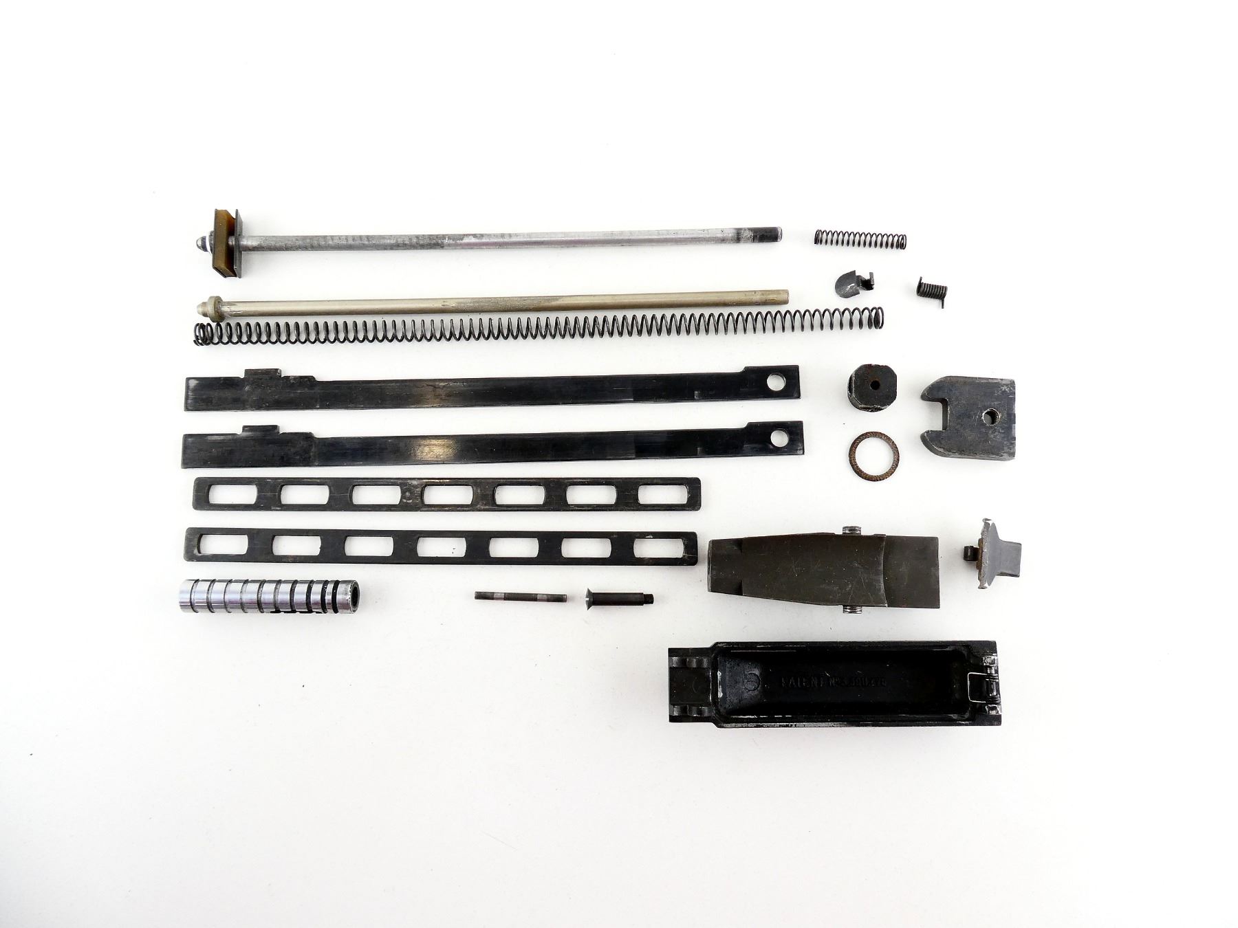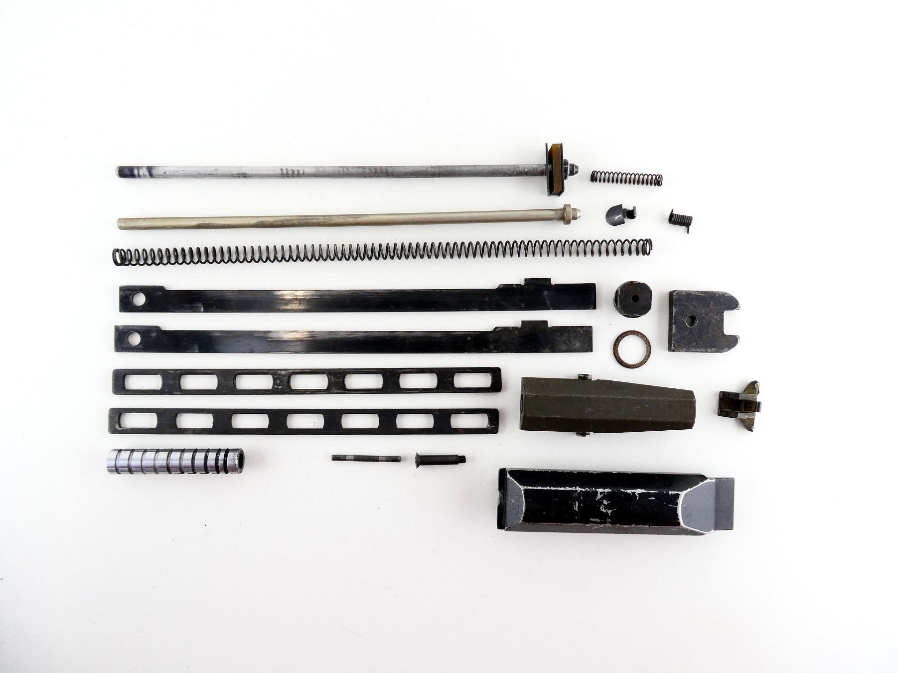 LOT INCLUDES; BOLT GUIDES, RETURN SPRING & RODS, STOCK PLATE, HINGED FLOOR PLATE, PISTON WITH RETAINER, MAG CLIP, VARIOUS SCREWS / PINS / SPRINGS, ETC. MAY REQUIRE FITTING. SEE PHOTOS.