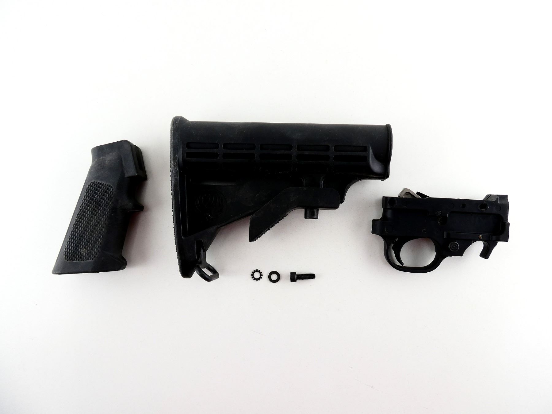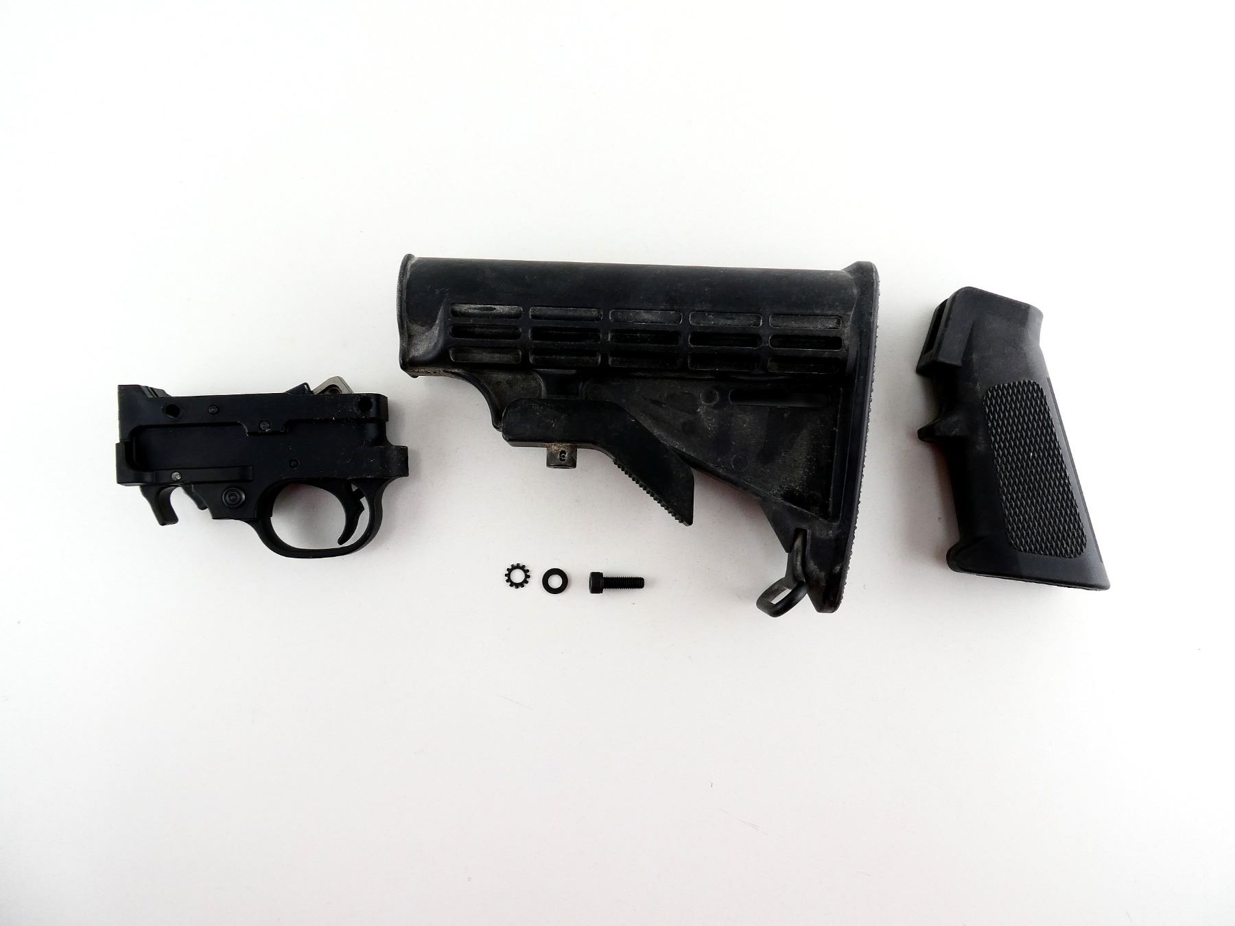 LOT INCLUDES; COMPLETE TRIGGER MECH. WITH EXTENDED MAG CATCH, CHECKERED BLACK POLYMER PISTOL GRIP, RUGER M4 BLACK POLYMER BUTT STOCK, ETC. MAY REQUIRE FITTING. SEE PHOTOS.
