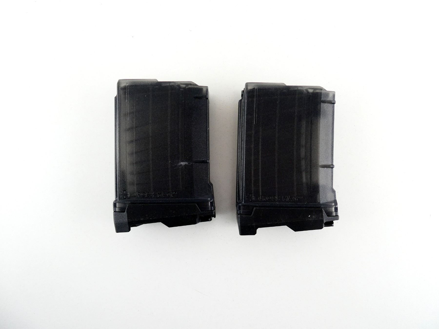 LOT INCLUDES; (2) 5.56MM / .223 REM MAGS, 10 RNDS, SMOKE GREY POLYMER CONSTRUCTION, MARKED: "CROSS INDUSTRIES, AR-15 PISTOL MAGAZINE, 5.56X45 - 10 ROUNDS", ETC. SEE PHOTOS. PAL REQUIRED.