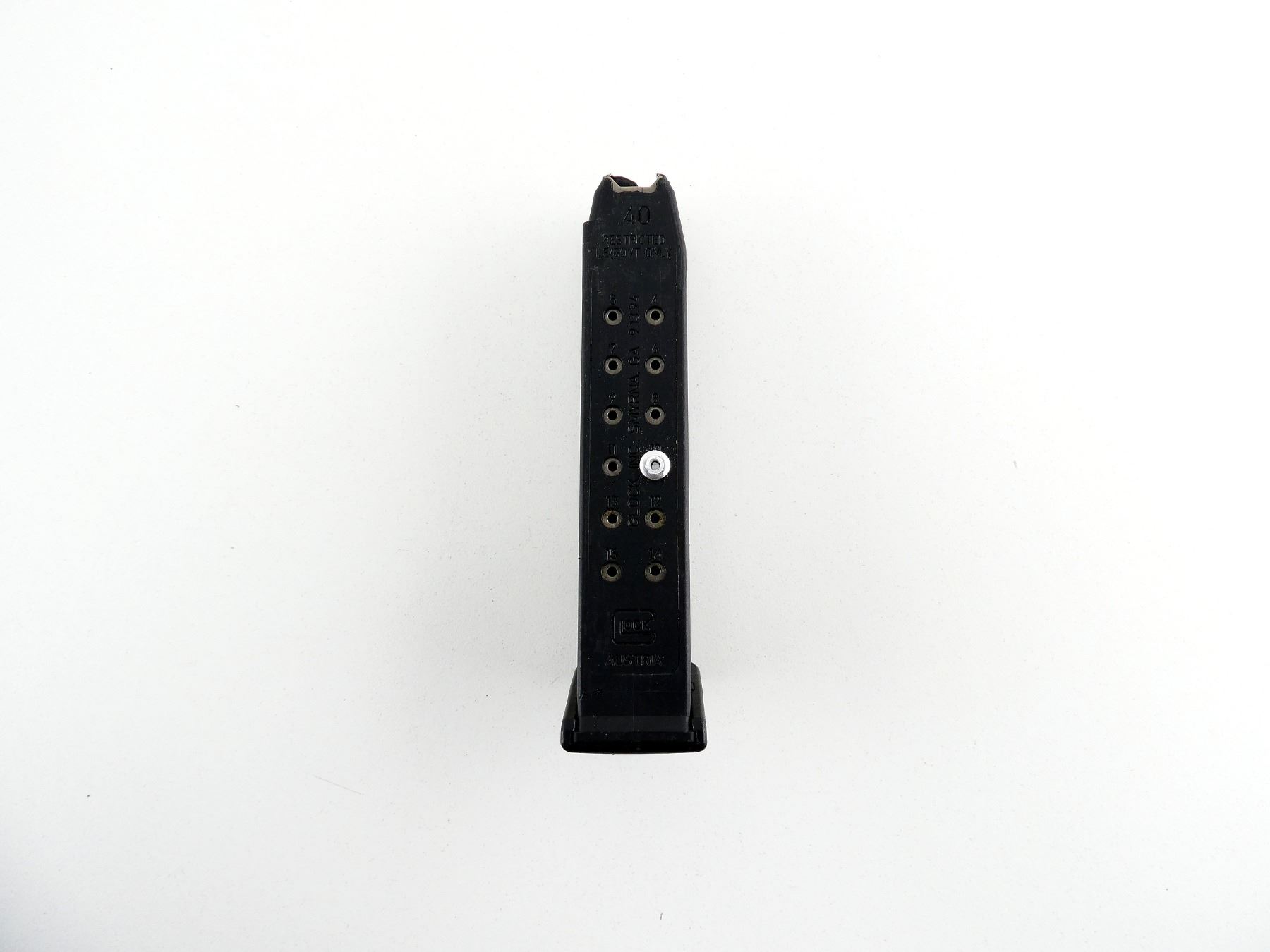 (1) .40 S&W, 10/15 ROUND PINNED MAG, BLACK POLYMER CONSTRUCTION, MARKED: "GLOCK", ".40, RESTRICTED LE/GOVT ONLY", ETC. SEE PHOTOS. PAL REQUIRED.