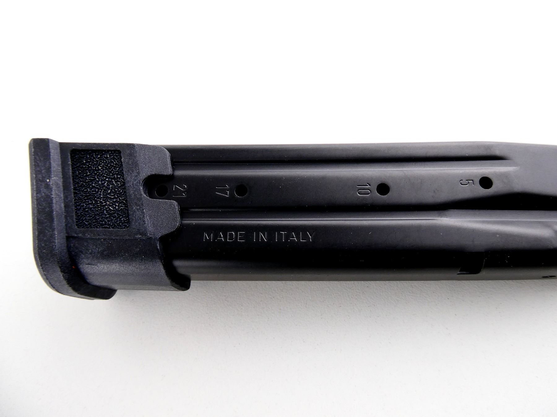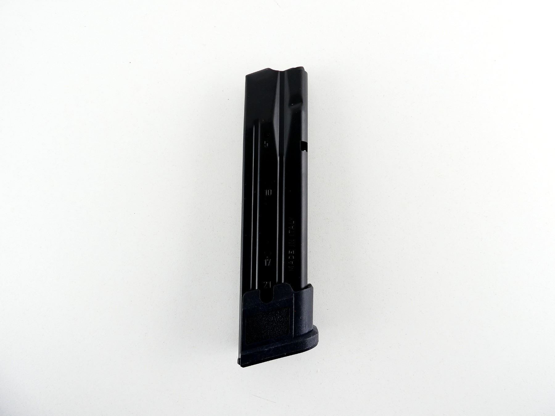 (1) 9MM, 10/21 ROUND PINNED MAG, BLUED STEEL, WITH EXTENDED BASEPLATE ATTACHED, MARKED: "SIG SAUER", "9MM", "MADE IN ITALY", ETC. SEE PHOTOS. PAL REQUIRED.