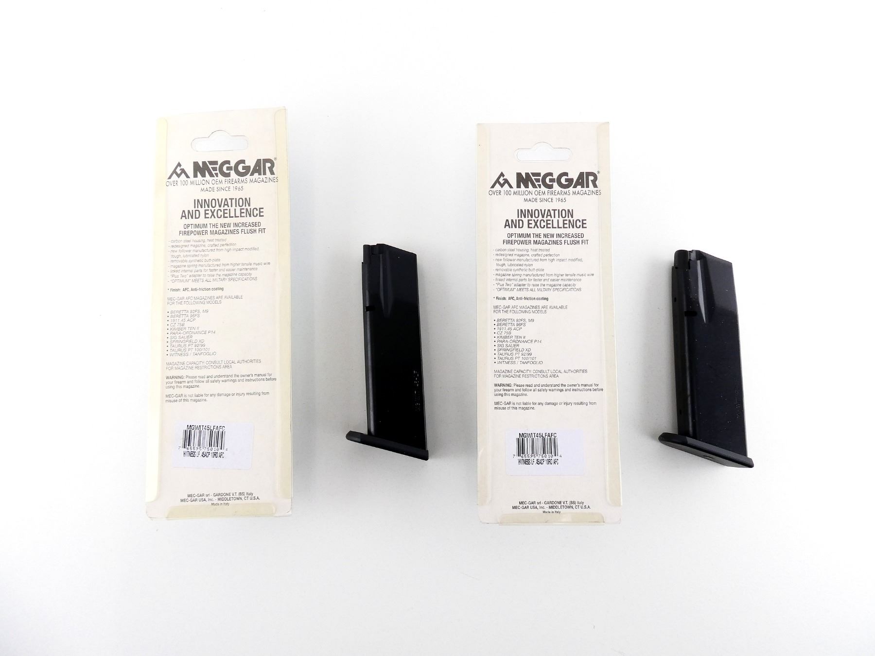 LOT INCLUDES; (2) .45 ACP MAG, 10 RNDS, BLACK STEEL CONSTRUCTION, MARKED: "MG WIT 45-LF", ETC., APPEARS NEW OLD STOCK IN ORIGINAL PACKAGING. SEE PHOTOS. PAL REQUIRED.