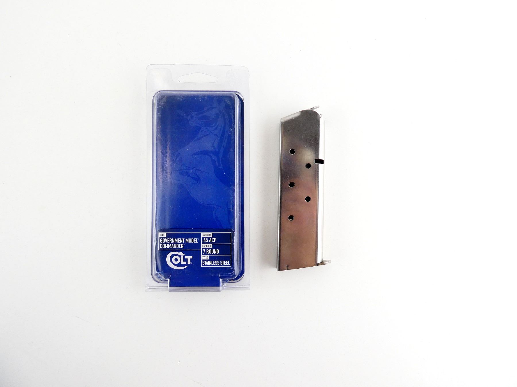 (1) .45 ACP MAG, 7 RNDS, STEEL CONSTRUCTION, BASE MARKED: "COLT, 45 AUTO", APPEARS NEW OLD STOCK IN ORIGINAL PACKAGING. SEE PHOTOS. PAL REQUIRED.