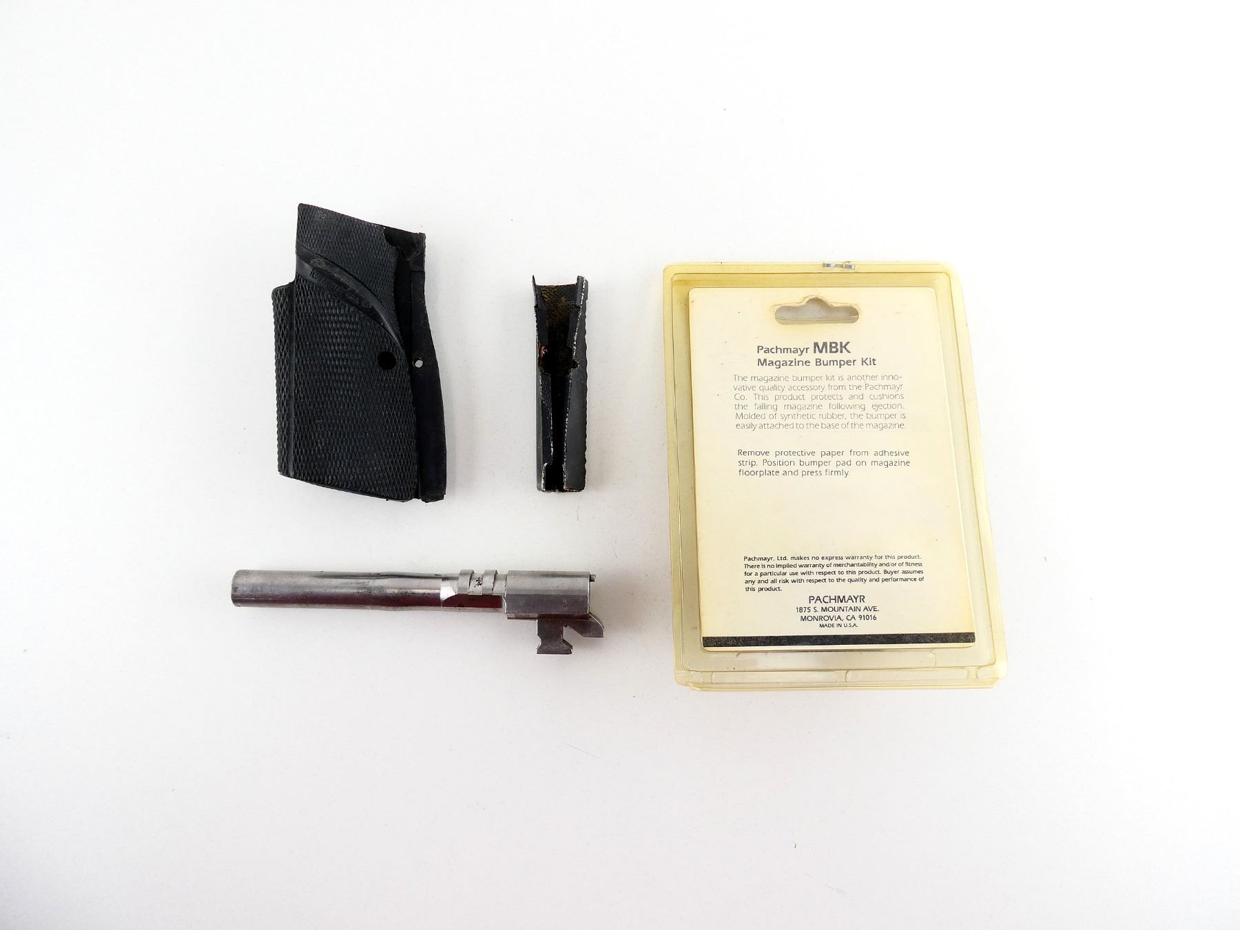 LOT INCLUDES; (1) 9MM LUGER BARREL, BORE IS POOR / BULGED, IN THE WHITE STEEL CONSTRUCTION, MARKED: "2CH3925", OVERALL LENGTH APPROX. 5", (1) SET OF PACHMAYR CHECKERED RUBBER GRIPS, NO SCREW, (1) PKG OF PACHMAYR MAG BUMPERS, APPEARS NEW OLD STOCK IN ORIGINAL PACKAGING. MAY REQUIRE FITTING. SEE PHOTOS. PAL REQUIRED.