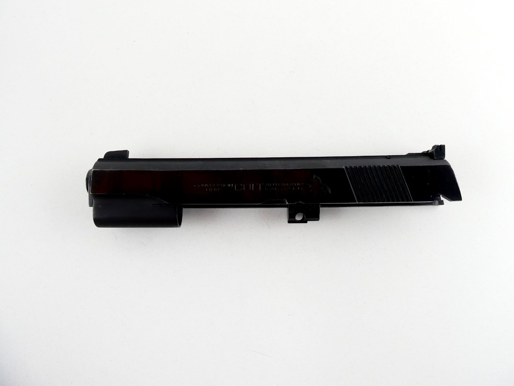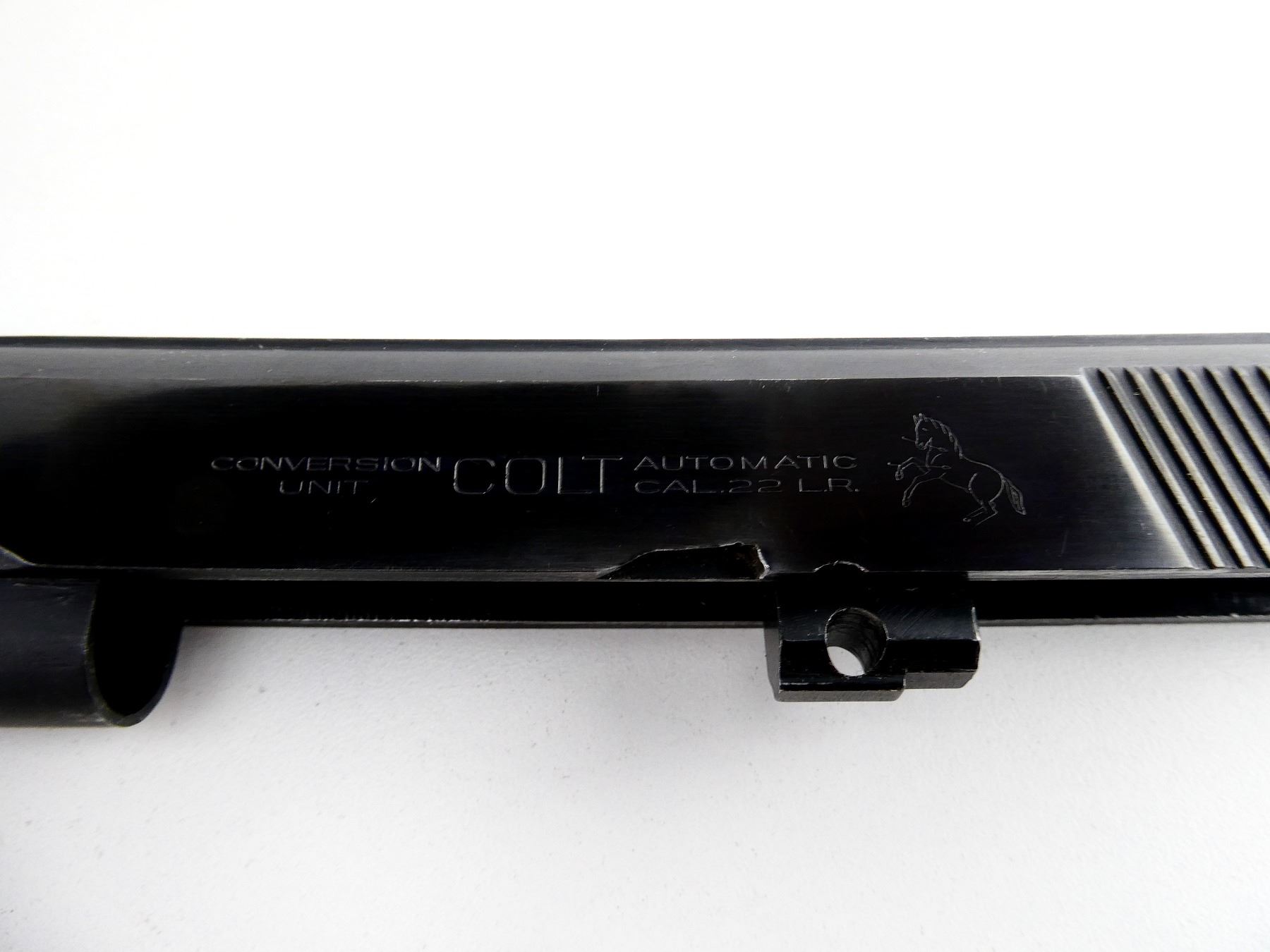 (1) .22 LR CONVERSION UNIT INCLUDES; BARREL, BORE IS VERY GOOD, BLUED STEEL CONSTRUCTION, MARKED: "COLT CAL .22 LR" & SLIDE, BLUED STEEL CONSTRUCTION, MARKED: "COLT AUTOMATIC .22 LR CONVERSION UNIT", OVERALL LENGTH APPROX. 7.75". MAY REQUIRE FITTING. SEE PHOTOS. PAL REQUIRED.