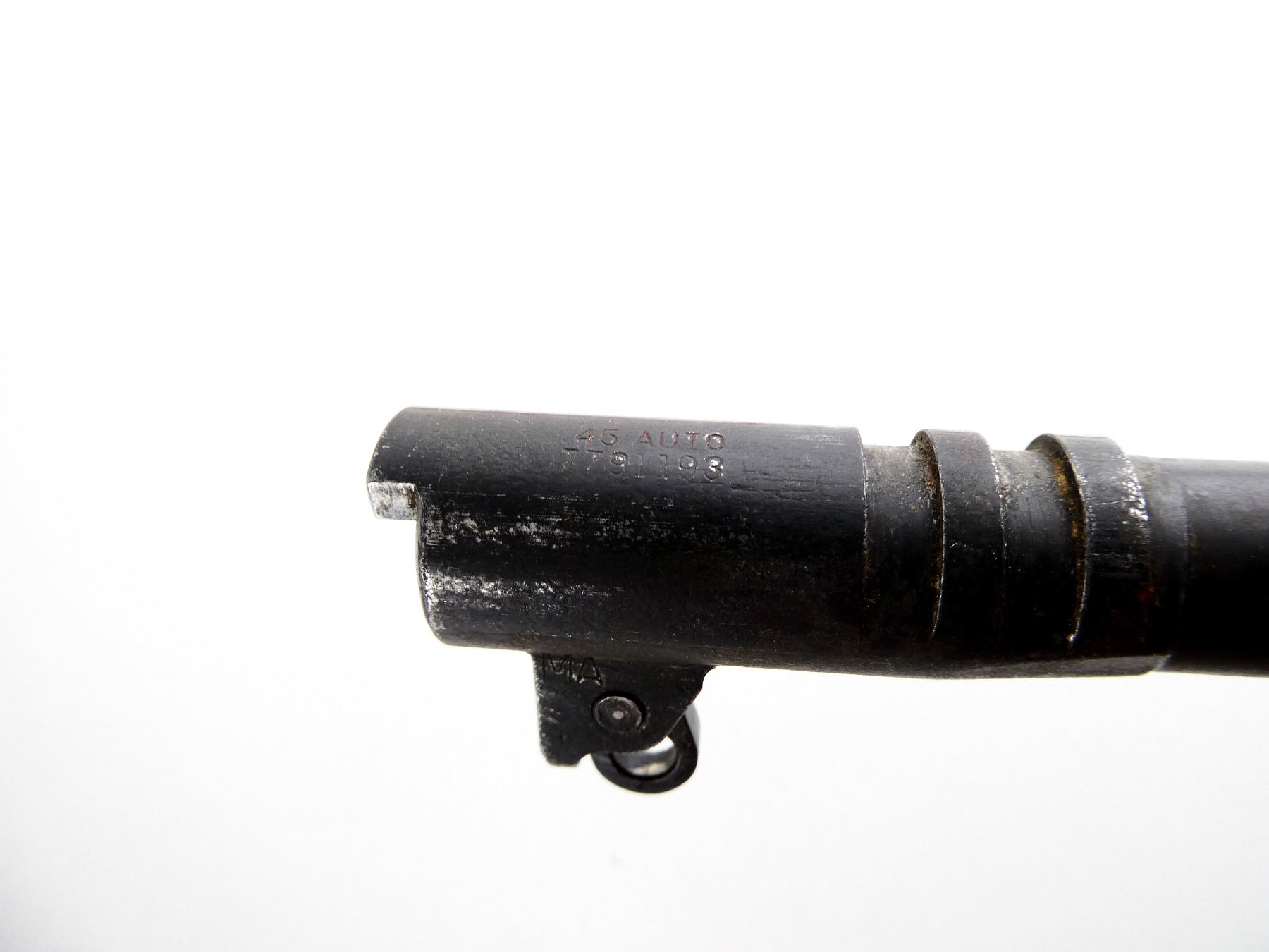 (1) .45 ACP BARREL, BORE IS VERY GOOD, BLUED STEEL CONSTRUCTION, MARKED: "45 AUTO", "7791193", ETC., WITH LINK & PIN, OVERALL LENGTH APPROX. 5". MAY REQUIRE FITTING. SEE PHOTOS. PAL REQUIRED.