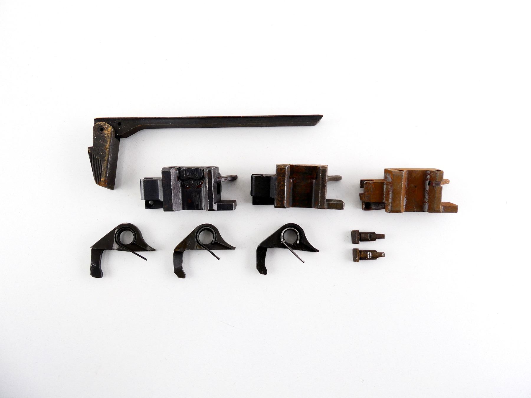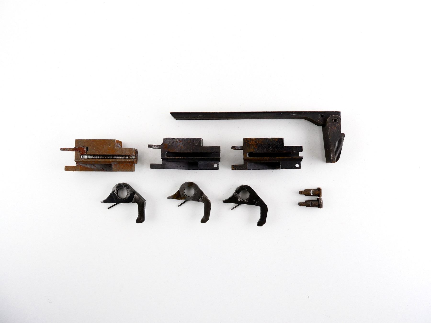 LOT INCLUDES; (3) EJECTOR BLOCKS, DAMAGED, (3) SAFETY SEARS, (1) COCKING HANDLE, ETC. MAY REQUIRE FITTING. SEE PHOTOS.