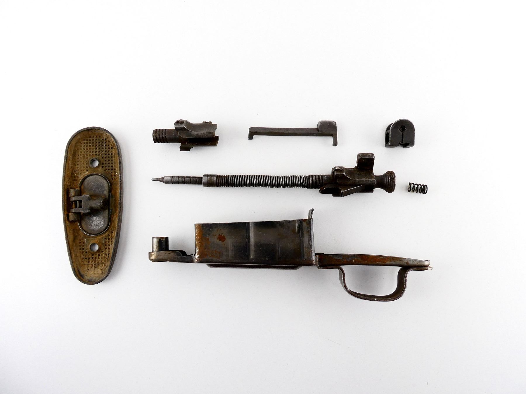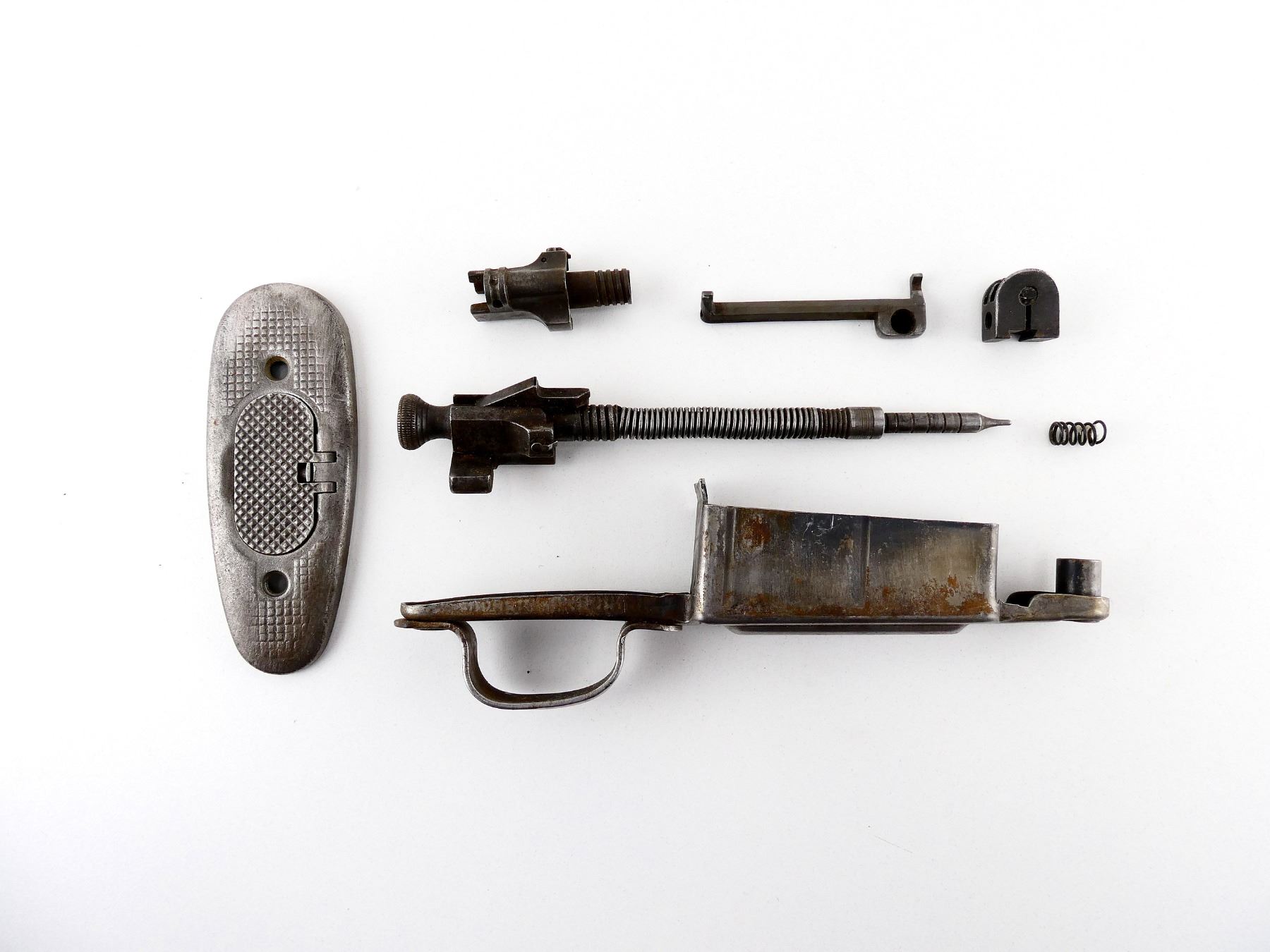LOT INCLUDES; 1903 SPRINGFIELD FIRING PIN ASSEMBLY, 1903 SPRINGFIELD BOLT SLEEVE, 1903 SPRINGFIELD TRIGGER GUARD, M1 GARAND BUTT PLATE, M1 GARAND FRONT SIGHT, M1 GARAND CLIP LATCH WITH SPRING, ETC. MAY REQUIRE FITTING. SEE PHOTOS.