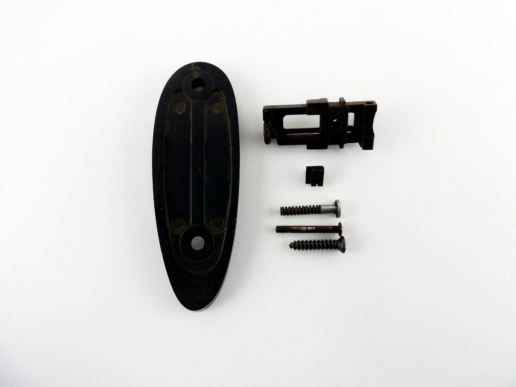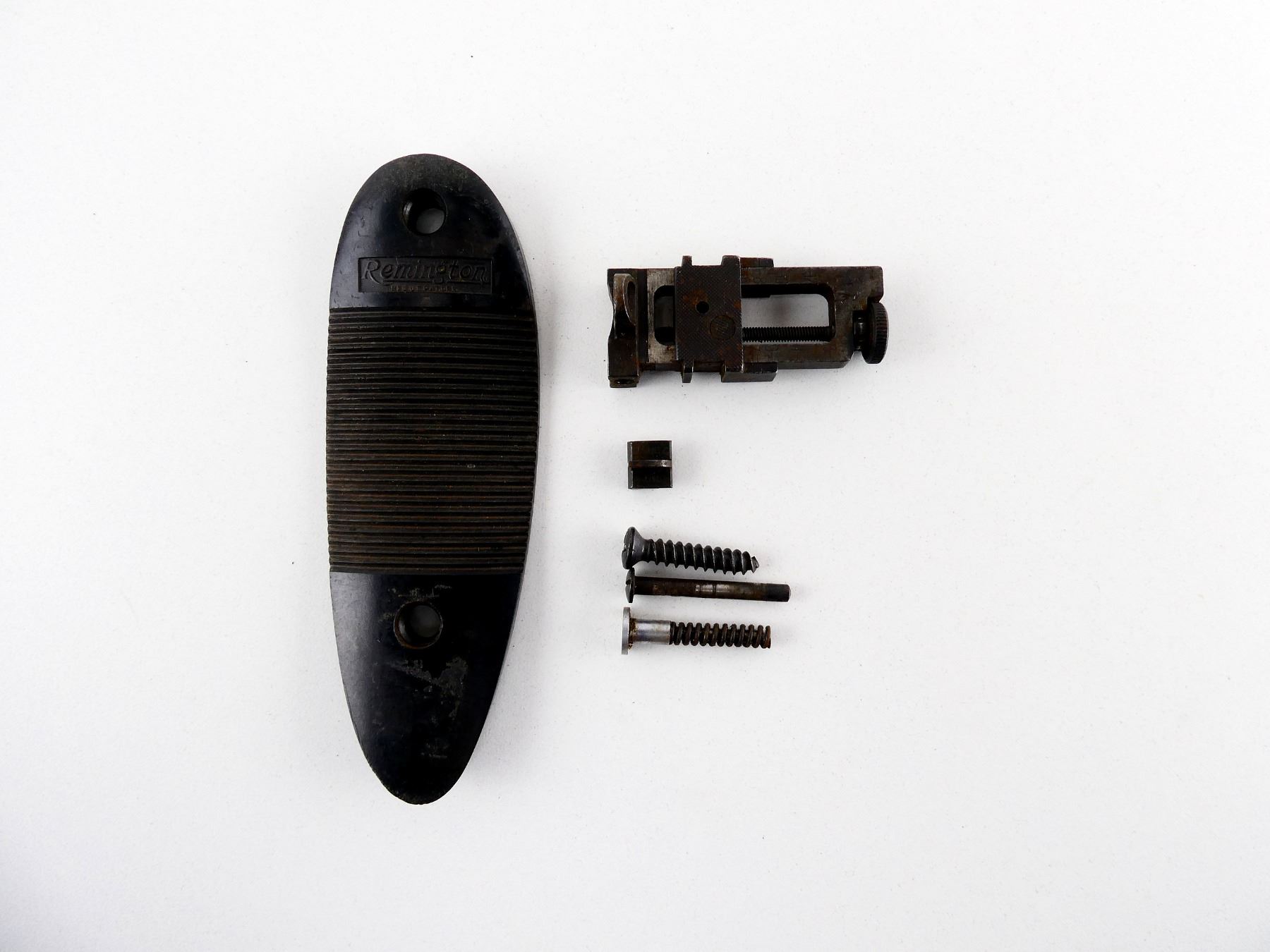 LOT INCLUDES; (1) MILLED PEEP SIGHT, ADJUSTABLE, BLUED STEEL CONSTRUCTION, MARKED: "F" & BROAD ARROW & (1) REMINGTON BLACK POLYMER BUTT PLATE WITH SCREWS, FITS VARIOUS MODELS. MAY REQUIRE FITTING. SEE PHOTOS.