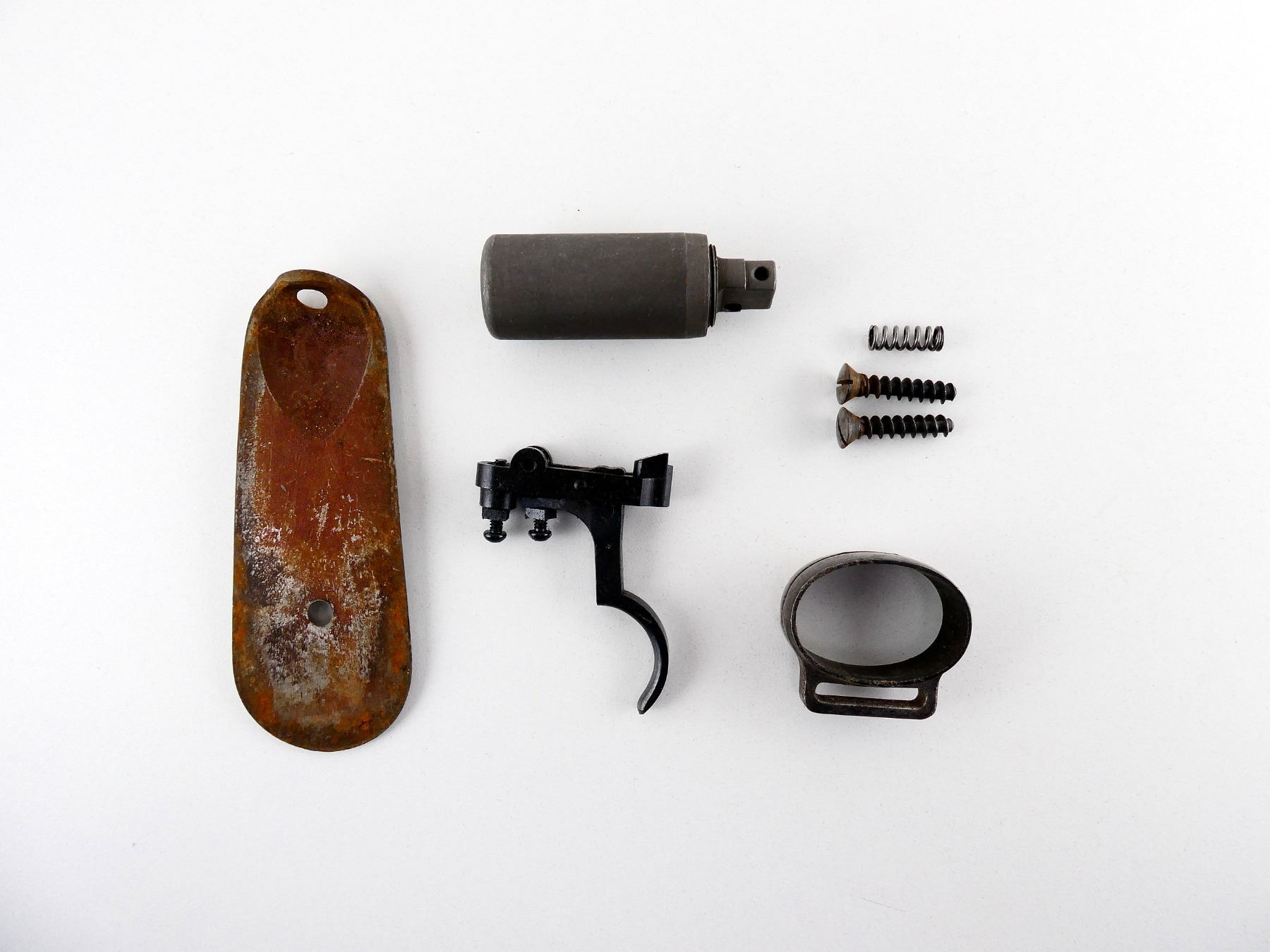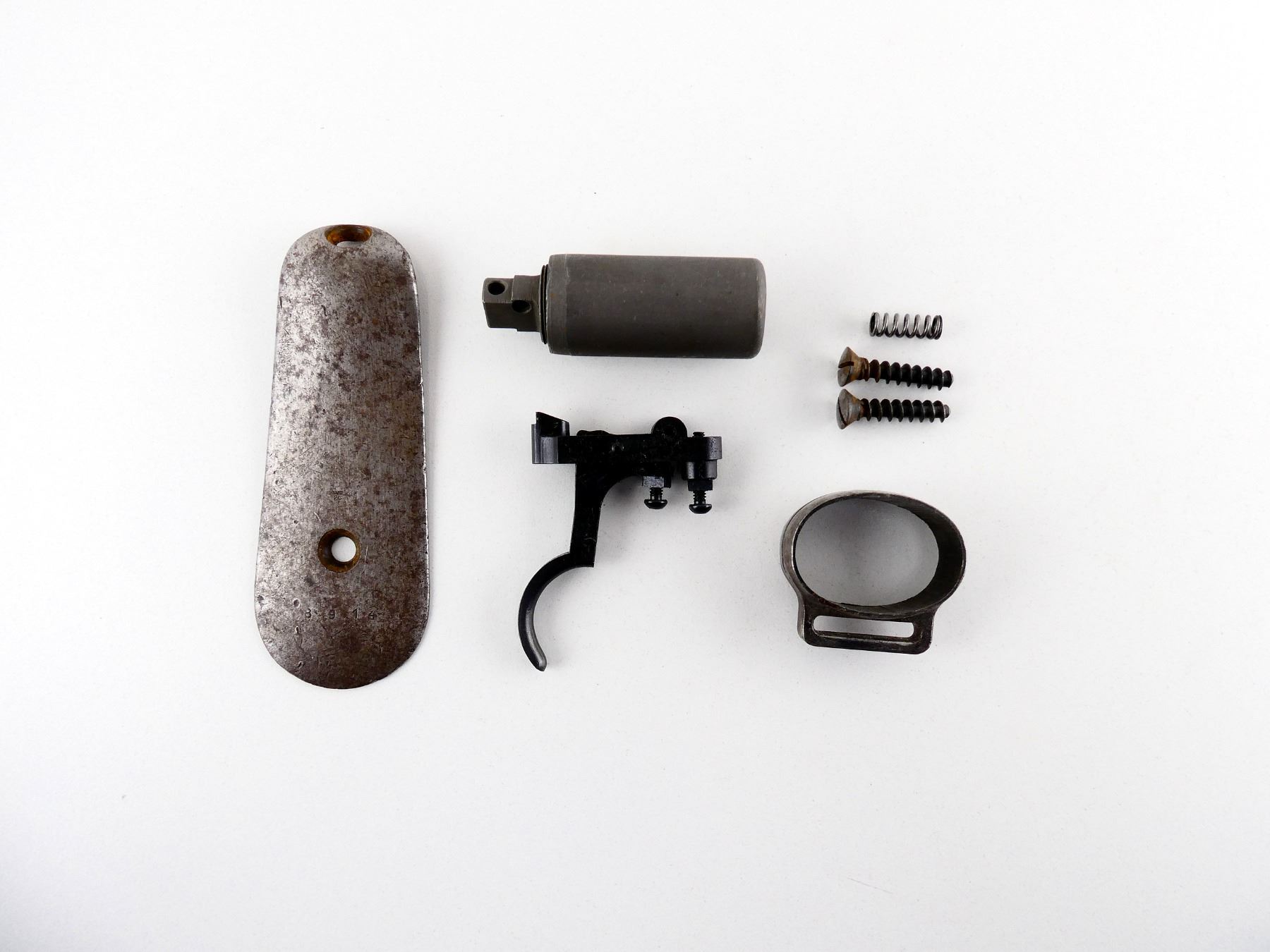 LOT INCLUDES; MIDDLE BAND WITH SWIVEL, FLAT BUTT PLATE WITH SCREWS, UNKNOWN ADJUSTABLE TRIGGER WITH SPRING, CLEANING ROD HANDLE (ONLY), ETC. MAY REQUIRE FITTING. SEE PHOTOS.
