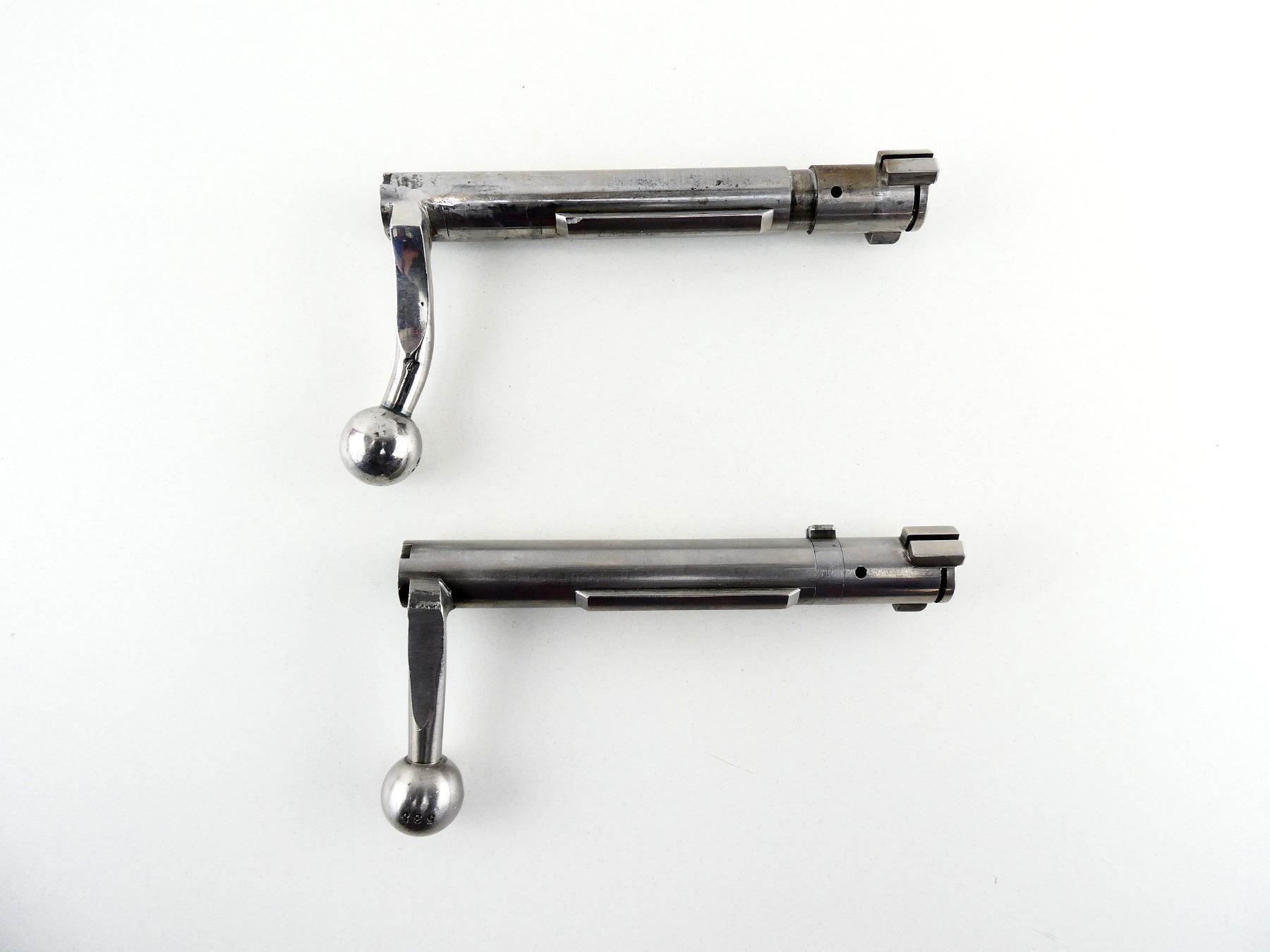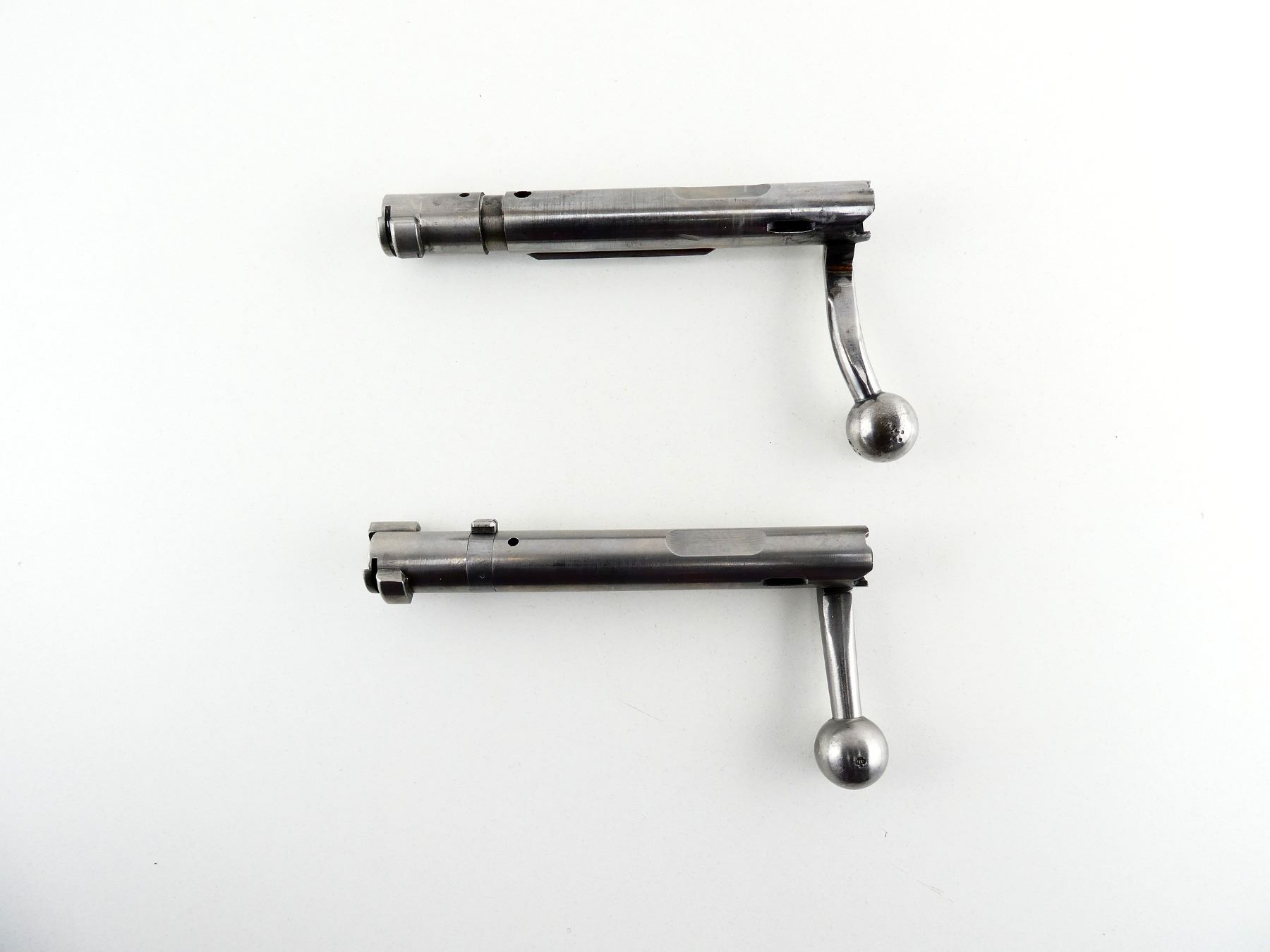 LOT INCLUDES; (2) BOLT BODIES, INCOMPLETE, IN THE WHITE STEEL CONSTRUCTION, ONE WITH AN EXTRACTOR COLLAR, MODIFIED HANDLES, ONE MARKED: "858" / ONE MARKED: "535 / BOTH WITH VARIOUS PROOF MARKS, OVERALL LENGTH APPROX. 5.5". MAY REQUIRE FITTING. SEE PHOTOS.
