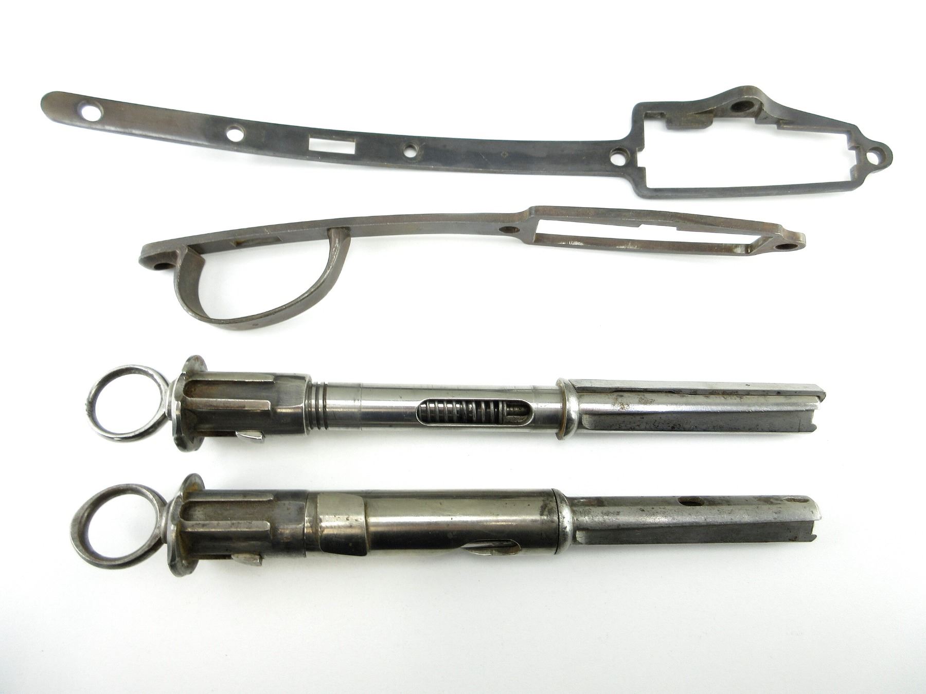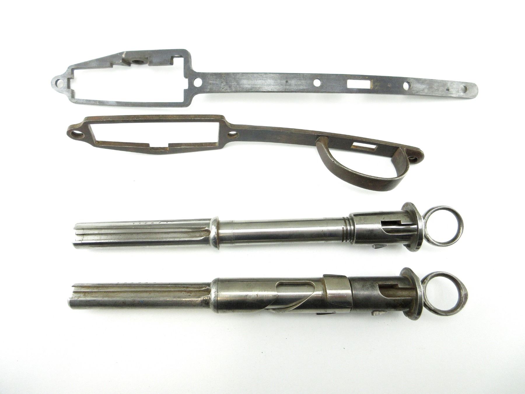 LOT INCLUDES; (2) TRIGGER GUARDS, (2) INCOMPLETE BOLTS, IN THE WHITE STEEL CONSTRUCTION, WITH COCKING PIECE, SPRING, BOLT SHROUDS, ONE WITH EXTRACTOR / ONE WITH LOCKING LUG, ETC. MAY REQUIRE FITTING. SEE PHOTOS.