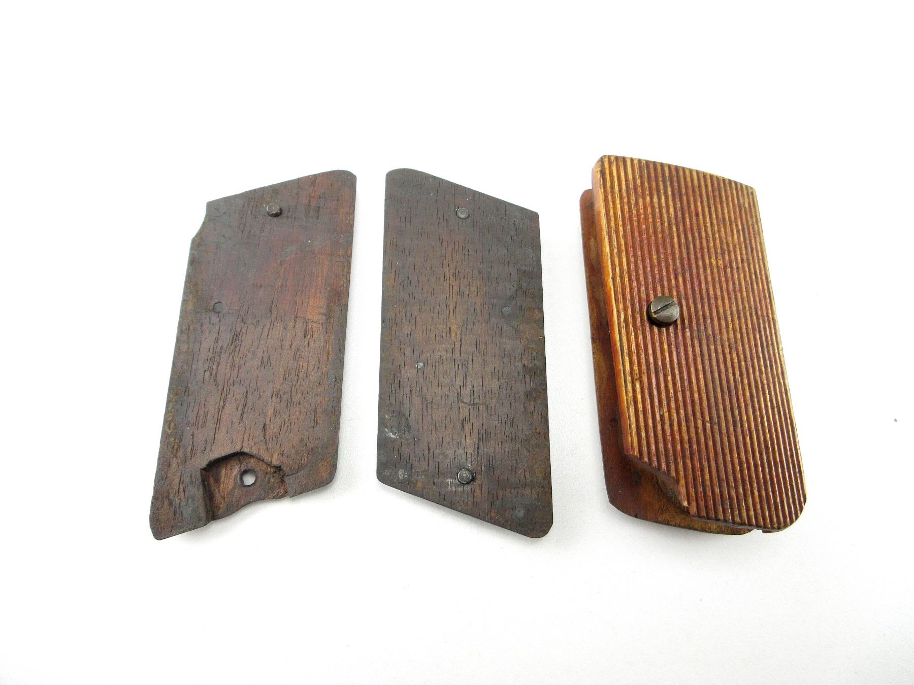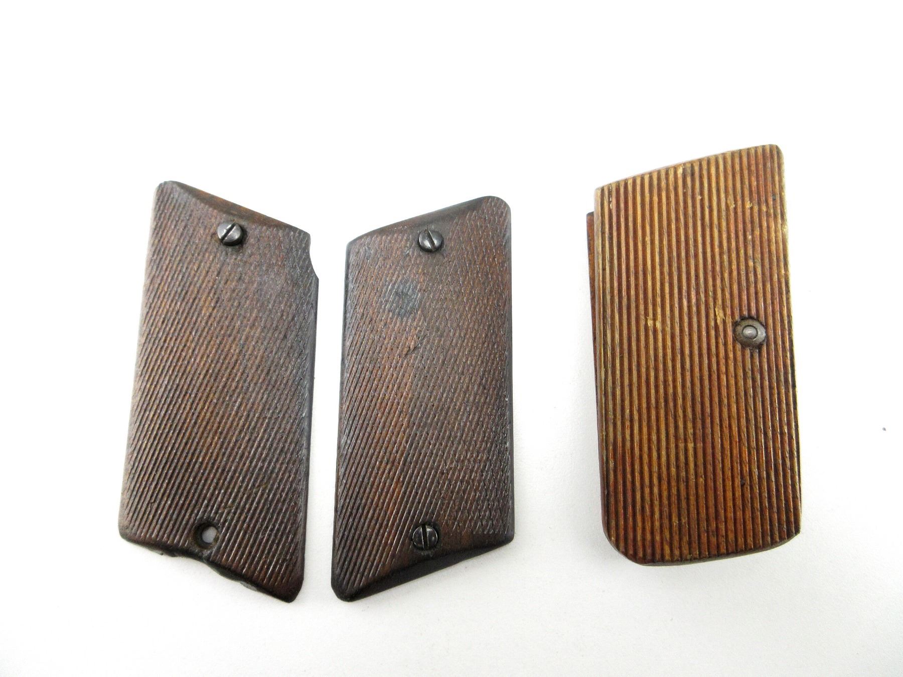 LOT INCLUDES; (2) SETS OF WOOD GRIPS, ONE CHECKERED / ONE GROOVED, WITH SCREWS, UNMARKED. MAY REQUIRE FITTING. SEE PHOTOS.