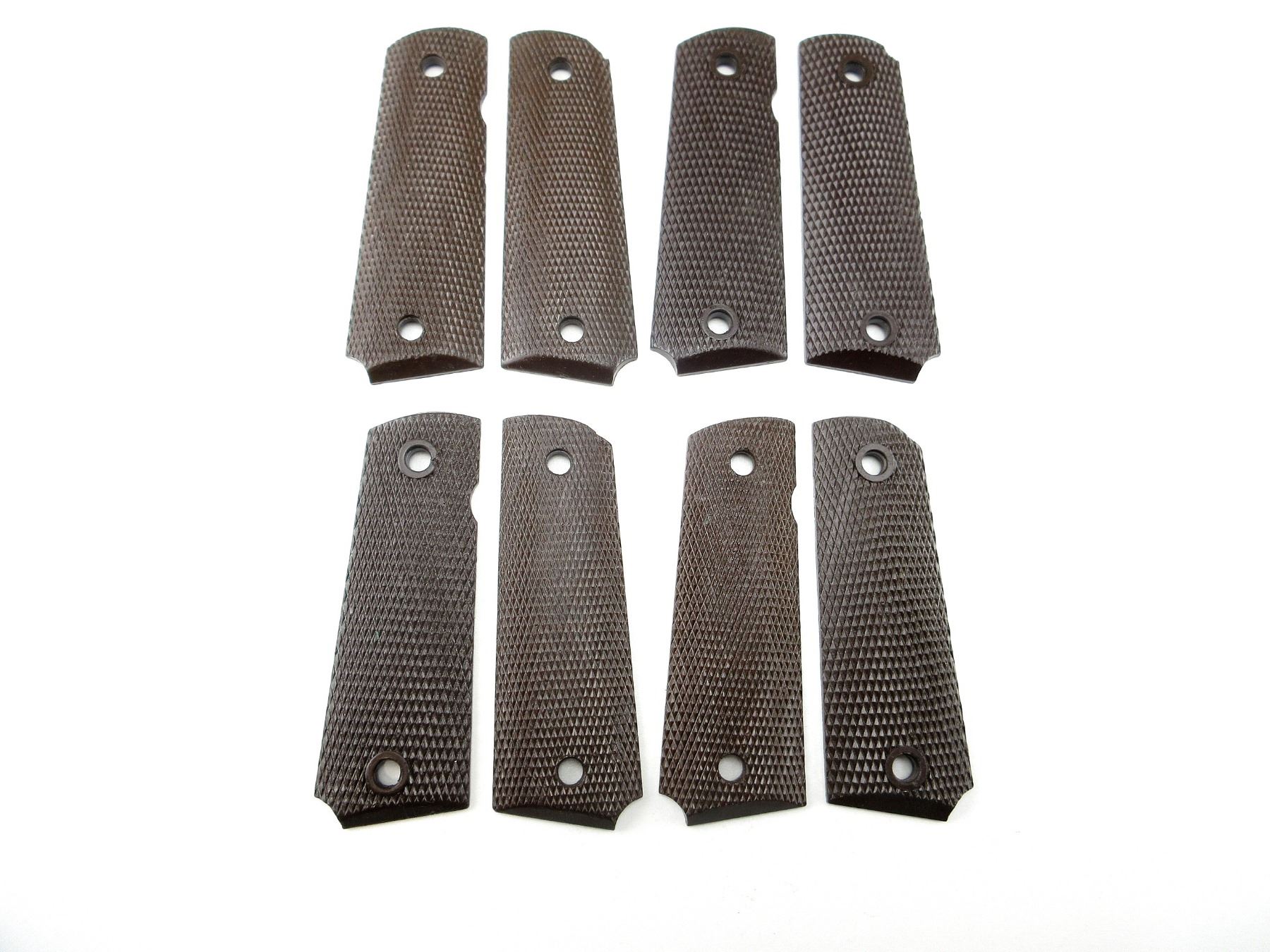 LOT INCLUDES; (4) SETS OF CHECKERED BROWN POLYMER GRIPS, NO SCREWS, VARIOUS MARKINGS. MAY REQUIRE FITTING. SEE PHOTOS.
