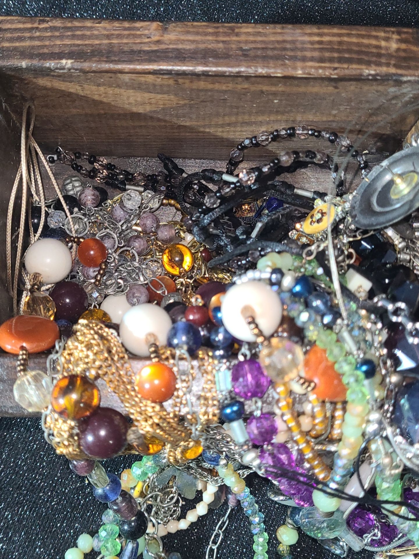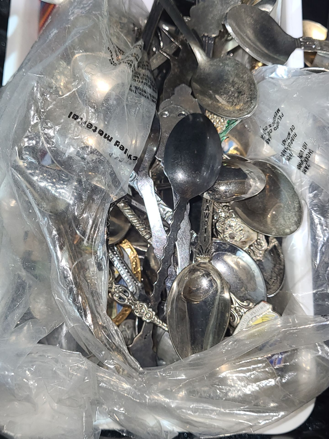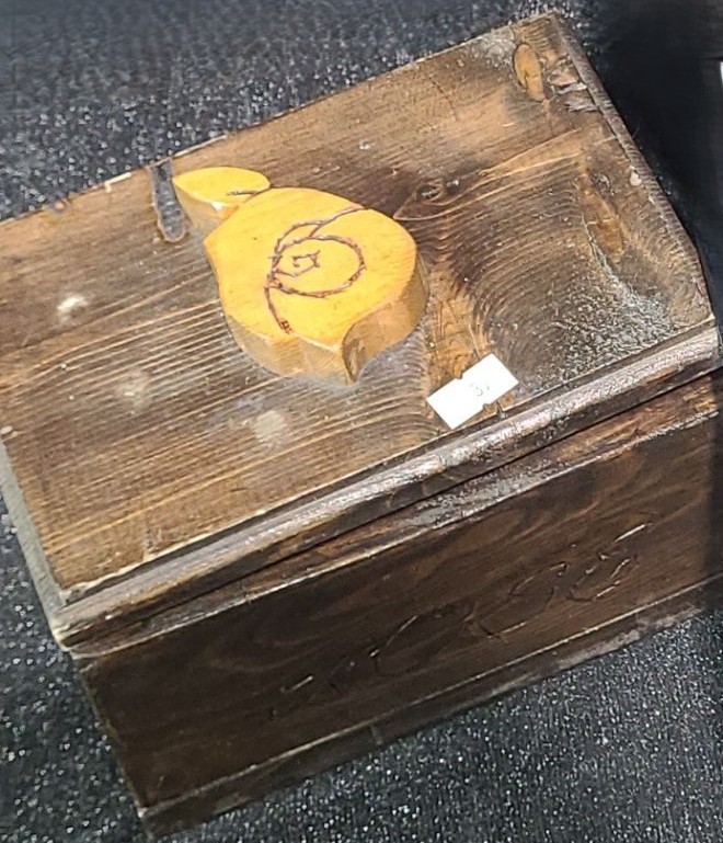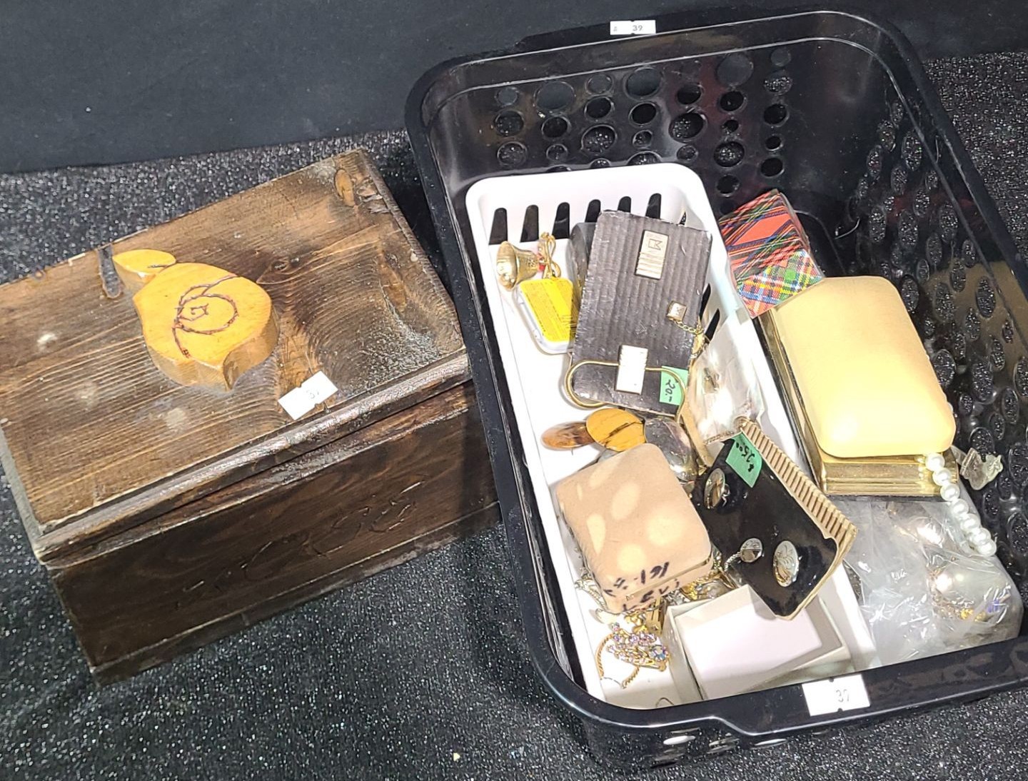 Lot 39 Small Wooden Box w/ Rose Motif, Costume Jewelry and Souvenir Spoons