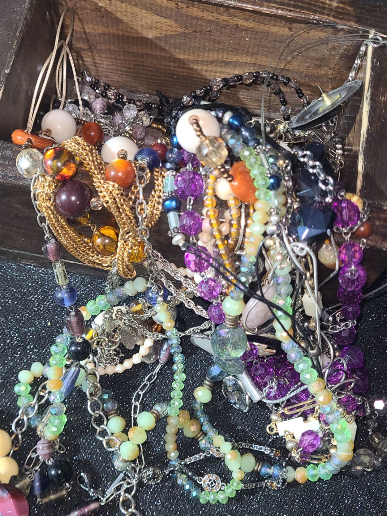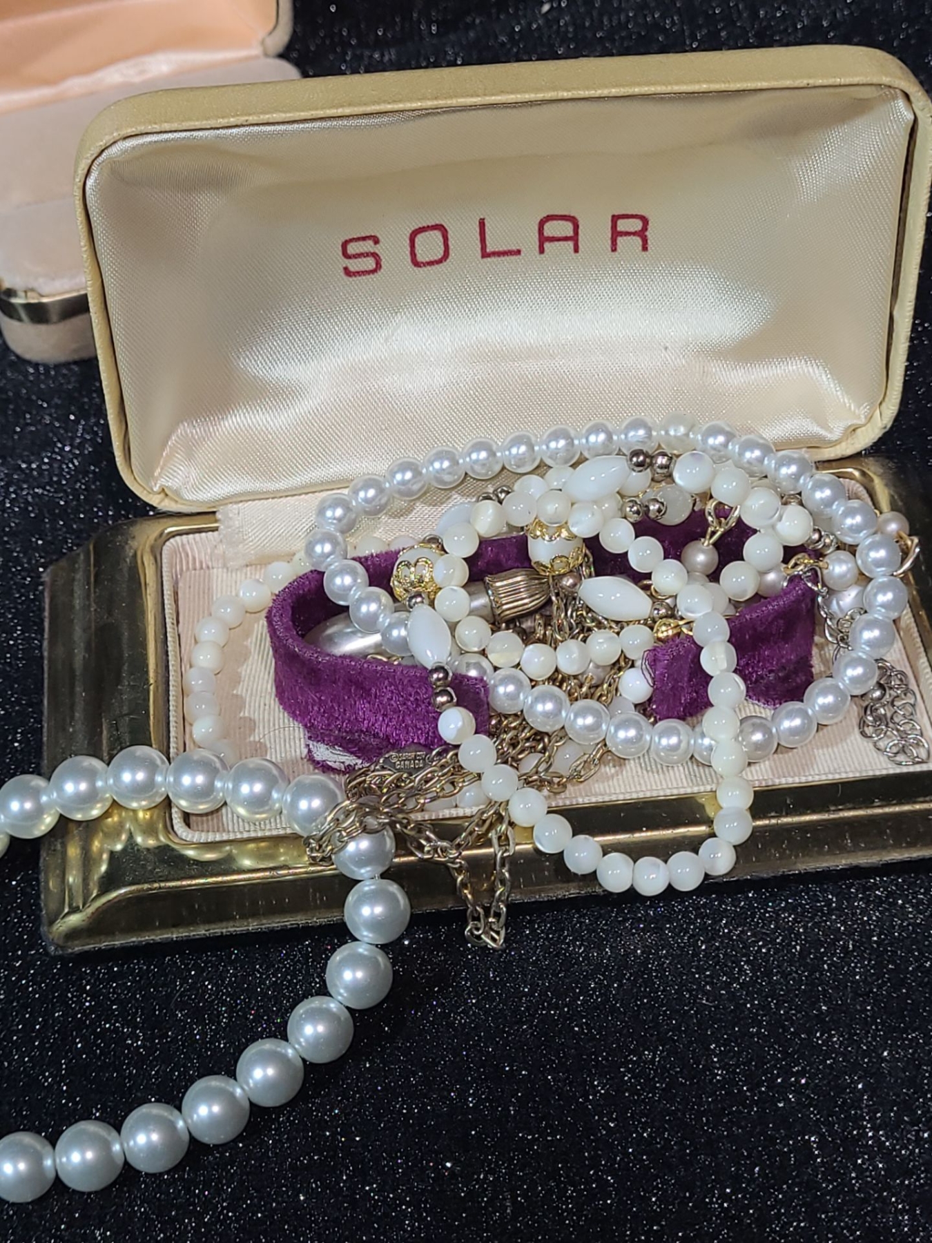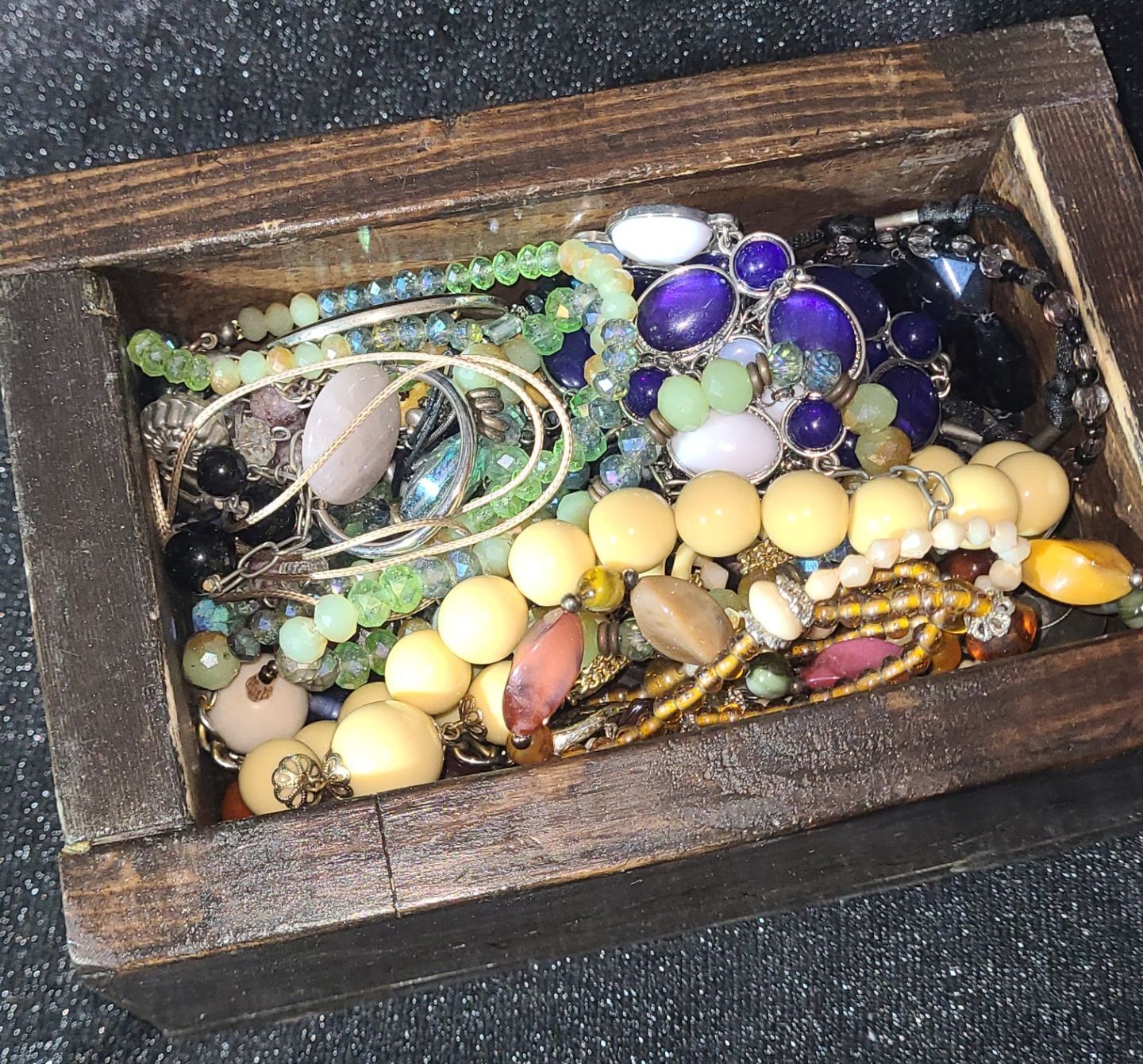 Lot 39 Small Wooden Box w/ Rose Motif, Costume Jewelry and Souvenir Spoons