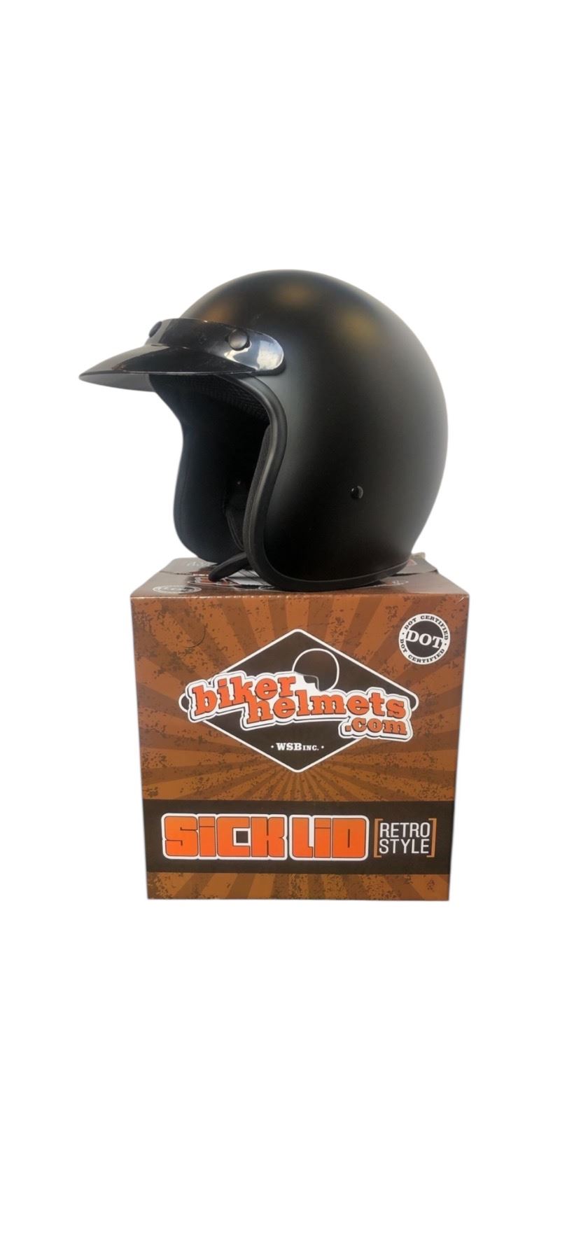 Lot 356 Lot of 6 New WSB Sick Lid Retro Style Open Faced Helmet w/ Snap on Visor (Matte Black) - Size XS - R