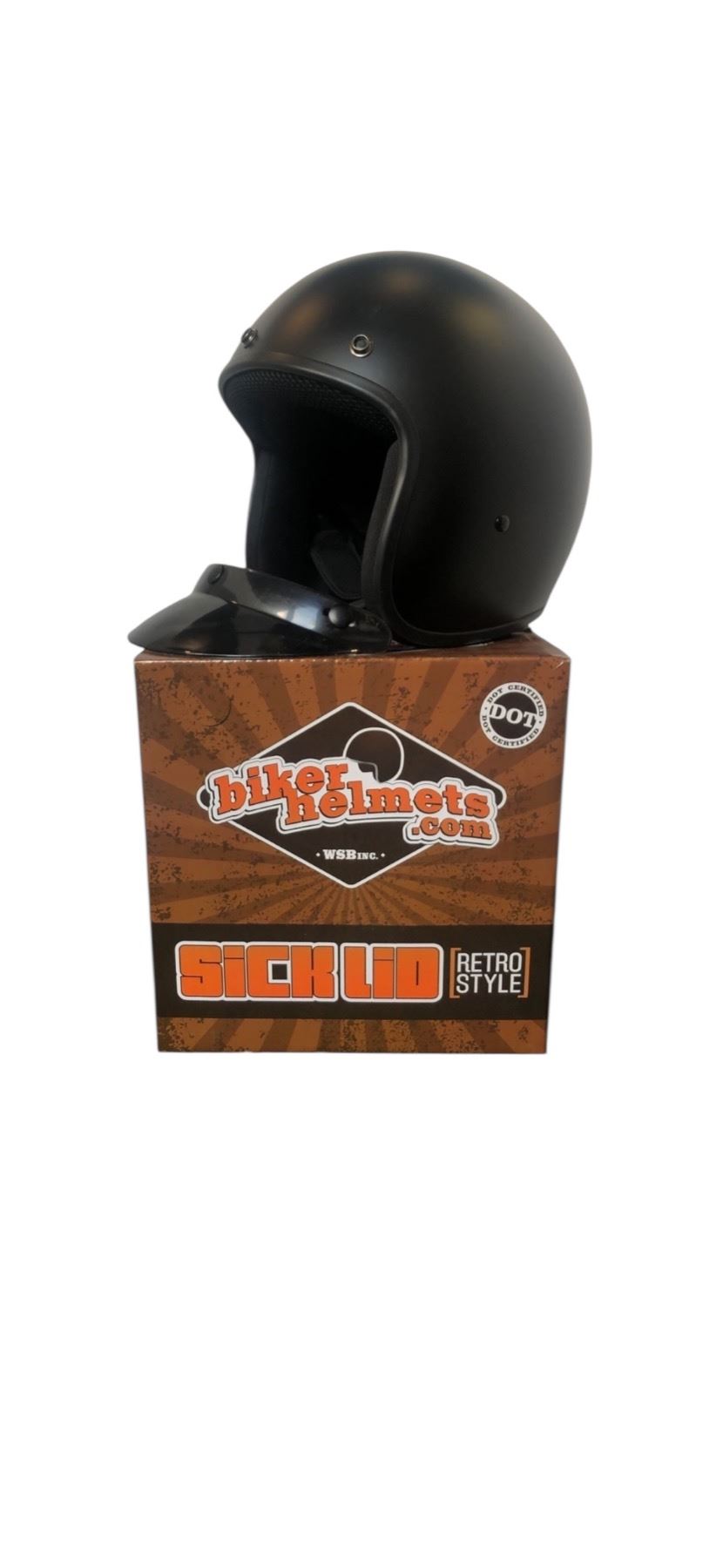 Lot 357 Lot of 6 New WSB Sick Lid Retro Style Open Faced Helmet w/ Snap on Visor (Matte Black) - Size XS - R