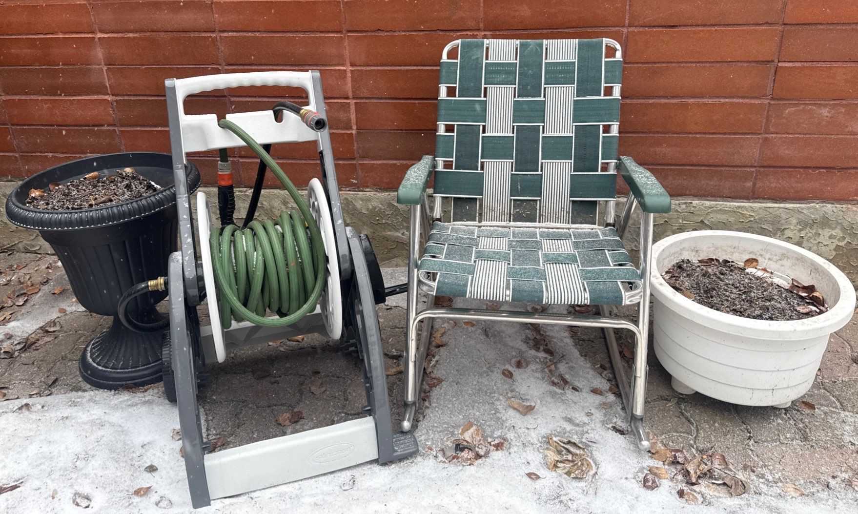 Lot 22 Rocking Lawn Chair Hose Reel Pedestal Garden Planter & More
