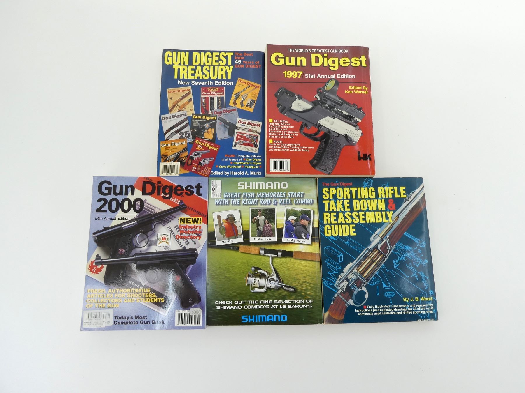 LOT INCLUDES; (1) "THE GUN DIGEST SPORTING RIFLE TAKE DOWN & REASSEMBLY GUIDE", BY J. B. WOOD, SOFT COVER, ISBN: 0-910676-36-4, (1) "GUN DIGEST TREASURY", SEVENTH EDITION, EDITED BY HAROLD A. MURTZ, SOFT COVER, ISBN: 0-87349-156-4, (1) "GUN DIGEST 1997", 51ST ANNUAL EDITION, EDITED BY KEN WARNER, SOFT COVER, ISBN: 0-87349-181-5, (1) "GUN DIGEST 2000", 54TH ANNUAL EDITION, EDITED BY KEN WARNER, SOFT COVER, ISBN: 0-87341-752-6 & (1) "LE BARON 2006 ANNUAL CATALOGUE", BY LE BARON OUTDOOR PRODUCTS LTD., SOFT COVER. SEE PHOTOS.