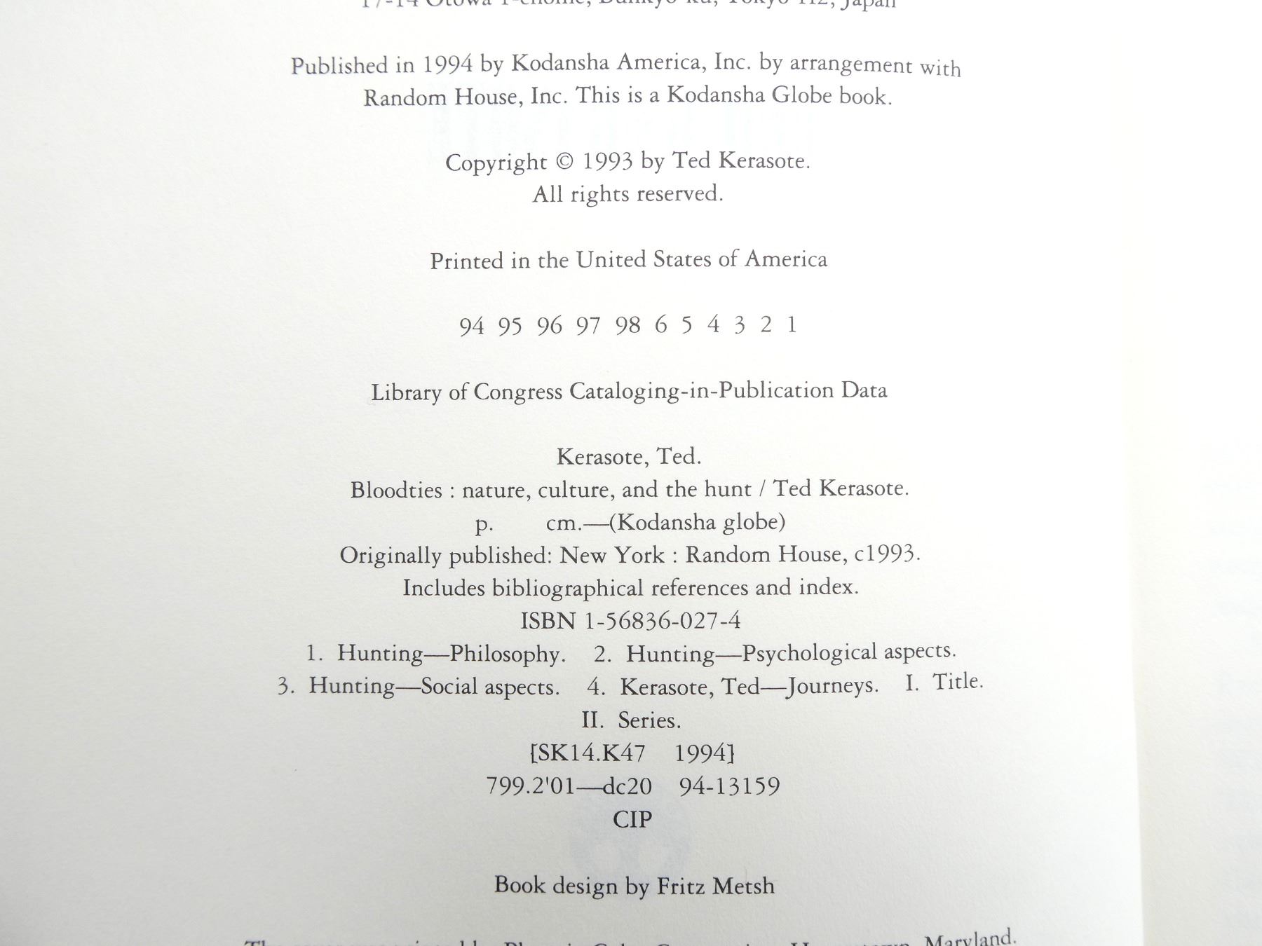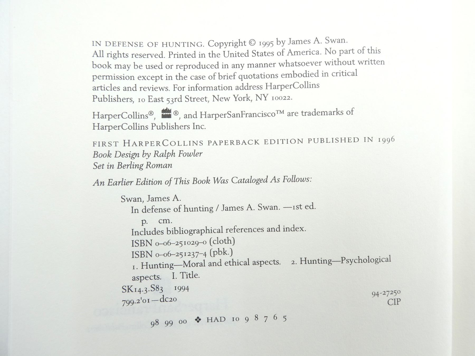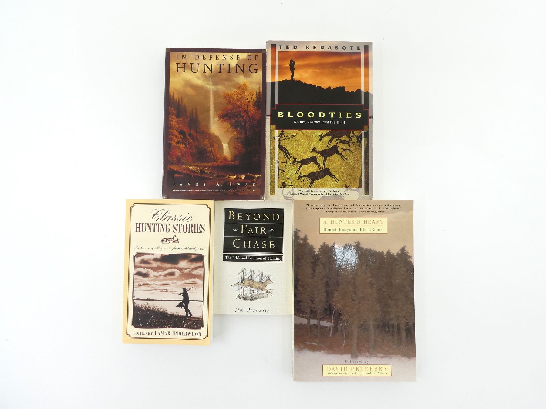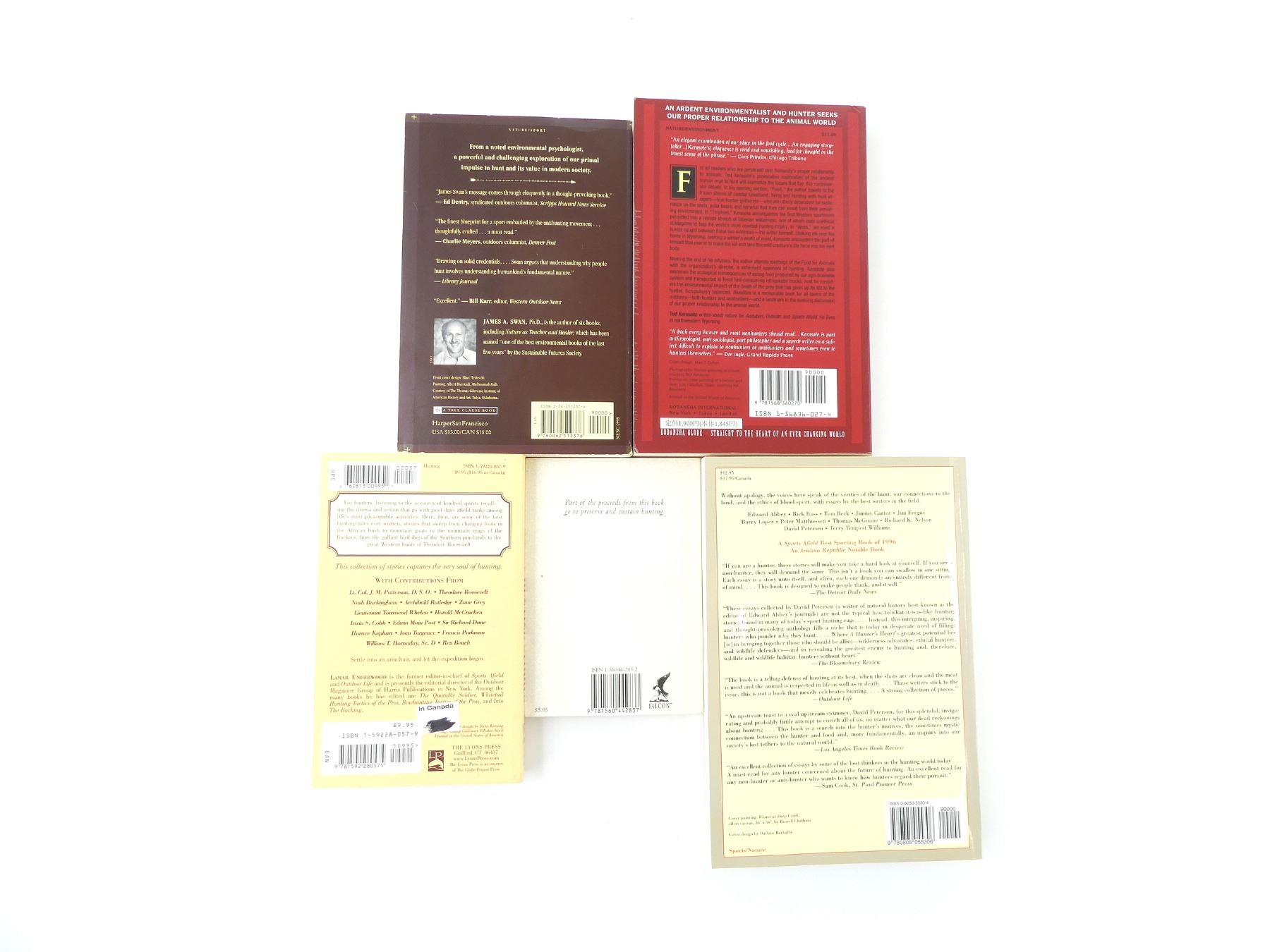 LOT INCLUDES; (1) "A HUNTER'S HEART" BOOK COLLECTED BY DAVID PETERSEN, SOFT COVER, ISBN: 0-8050-5530-4, (1) "IN DEFENSE OF HUNTING" BOOK BY JAMES A. SWAN, SOFT COVER, ISBN: 0-06-251237-4, (1) "BLOODTIES" BOOK BY TED KERASOTE, SOFT COVER, ISBN: 1-56836-027-4, (1) "BEYOND FAIR CHASE" BOOK BY JIM POSEWITZ, SOFT COVER, ISBN: 1-56044-283-2 & (1) "CLASSIC HUNTING STORIES" BOOK EDITED BY LAMAR UNDERWOOD, SOFT COVER, ISBN: 1-59228-057-9. SEE PHOTOS.
