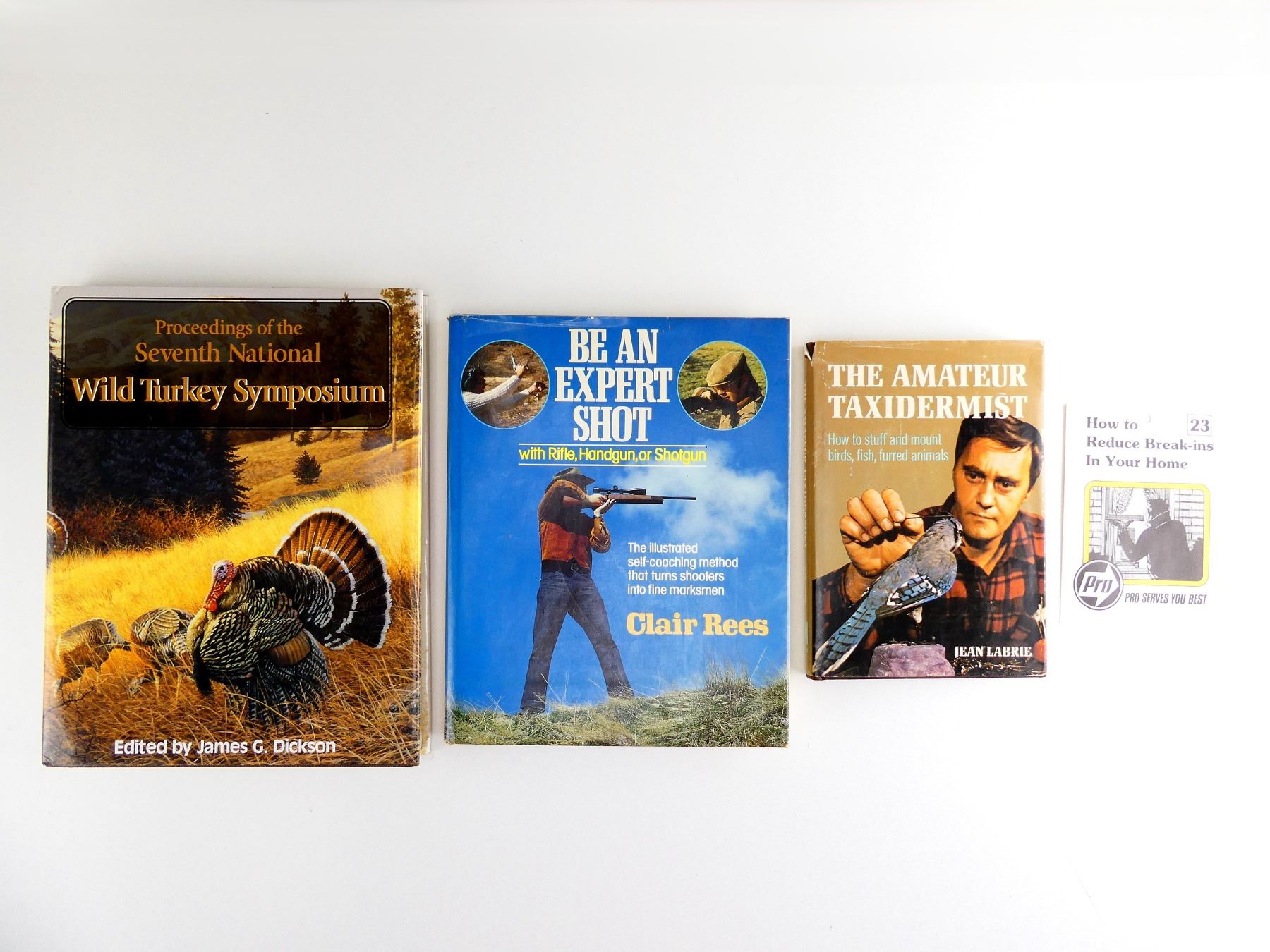 LOT INCLUDES; "BE AN EXPERT SHOT WITH RIFLE, HANDGUN, OR SHOTGUN" BOOK BY CLAIR REES, HARD COVER WITH DUST COVER, ISBN: 0-8329-0358-2, (1) "THE AMATEUR TAXIDERMIST" BOOK BY JEAN LABRIE, HARD COVER WITH DUST COVER, ISBN: 8055-1035-4, (1) "PROCEEDINGS OF THE SEVENTH NATIONAL WILD TURKEY SYMPOSIUM" BOOK, HARD COVER WITH DUST COVER, ISBN: 0-8117-1105-6 & (1) "HOW TO REDUCE BREAK-INS IN YOUR HOME" PAMPHLET. SEE PHOTOS.