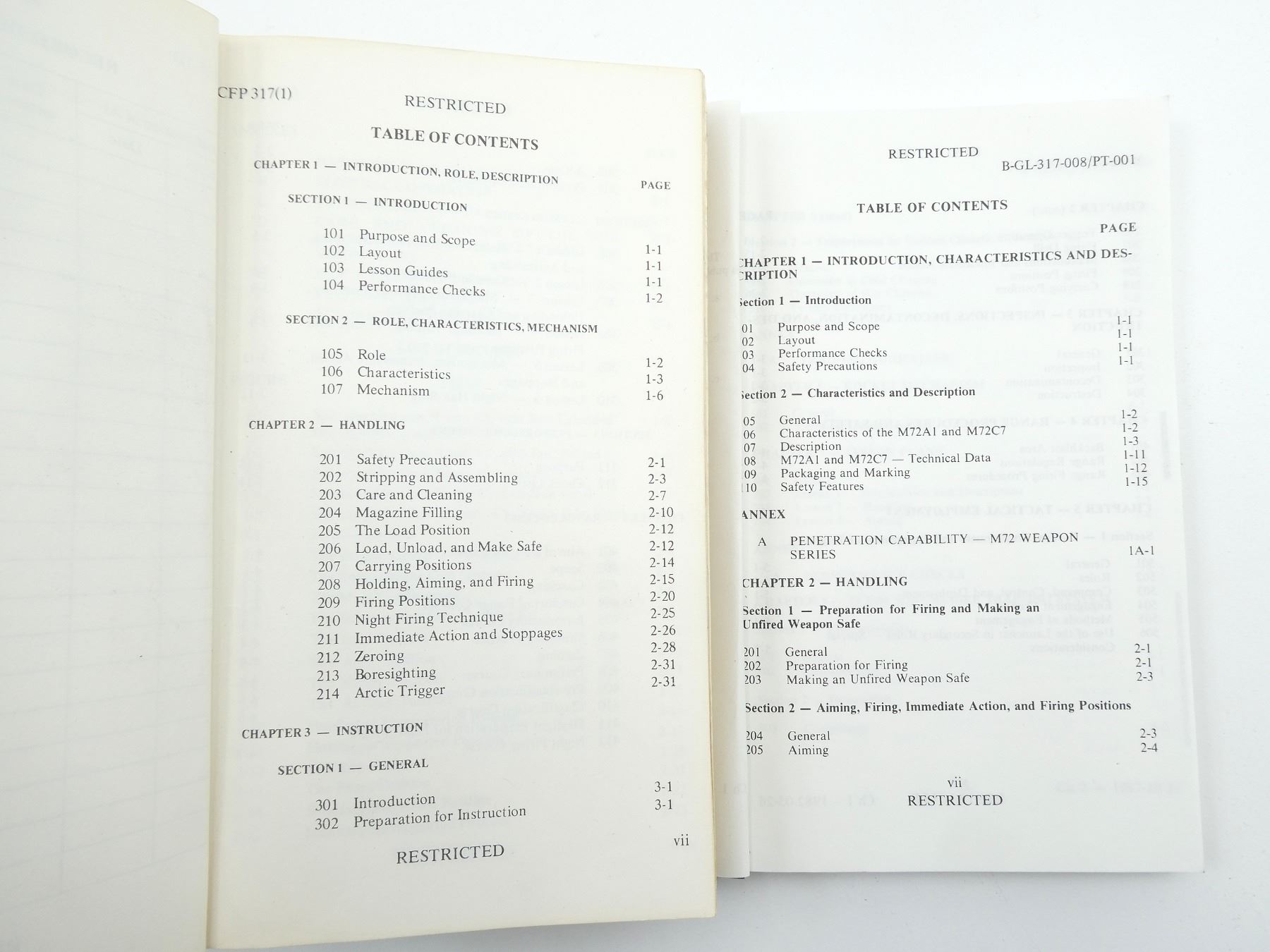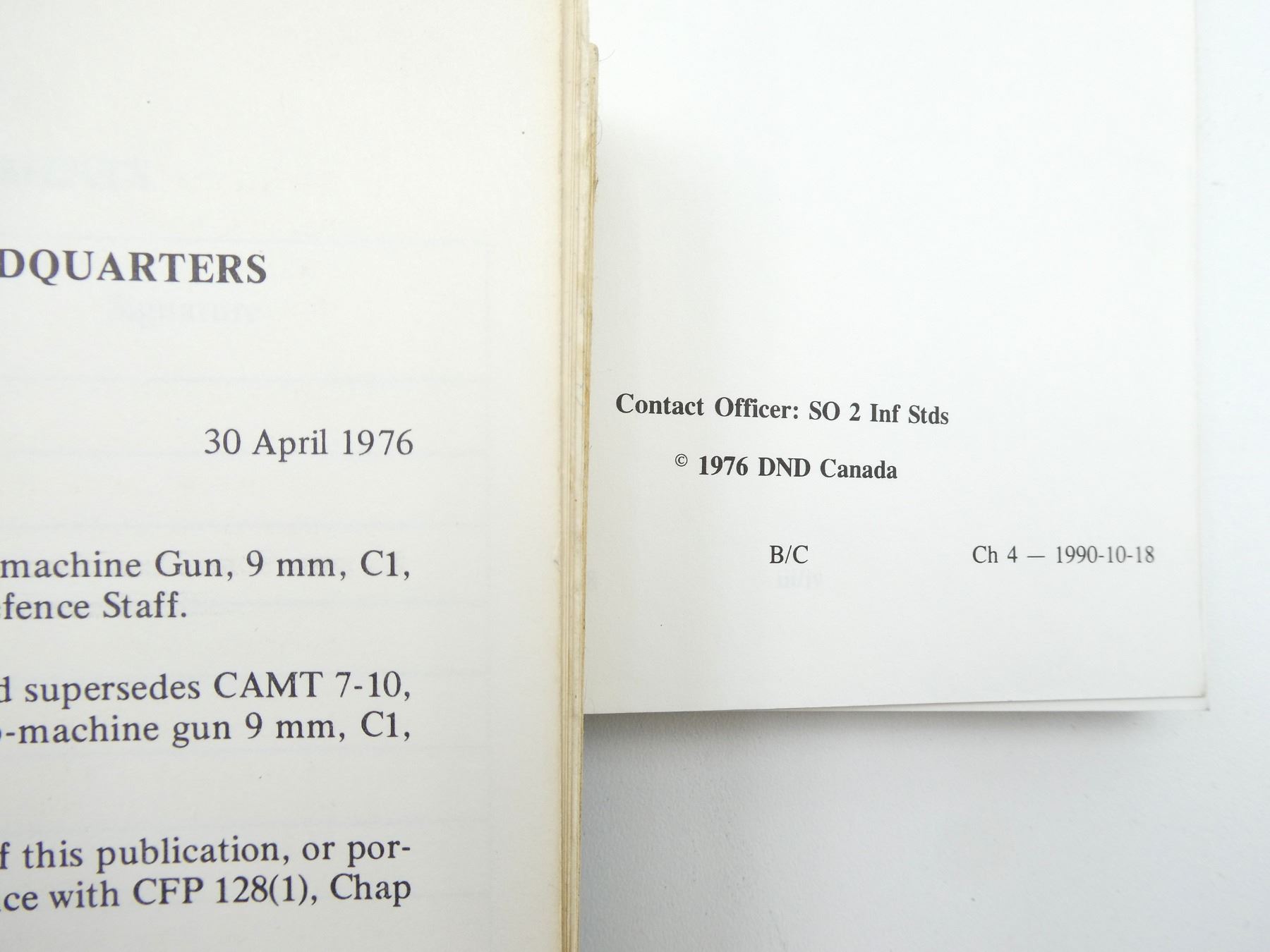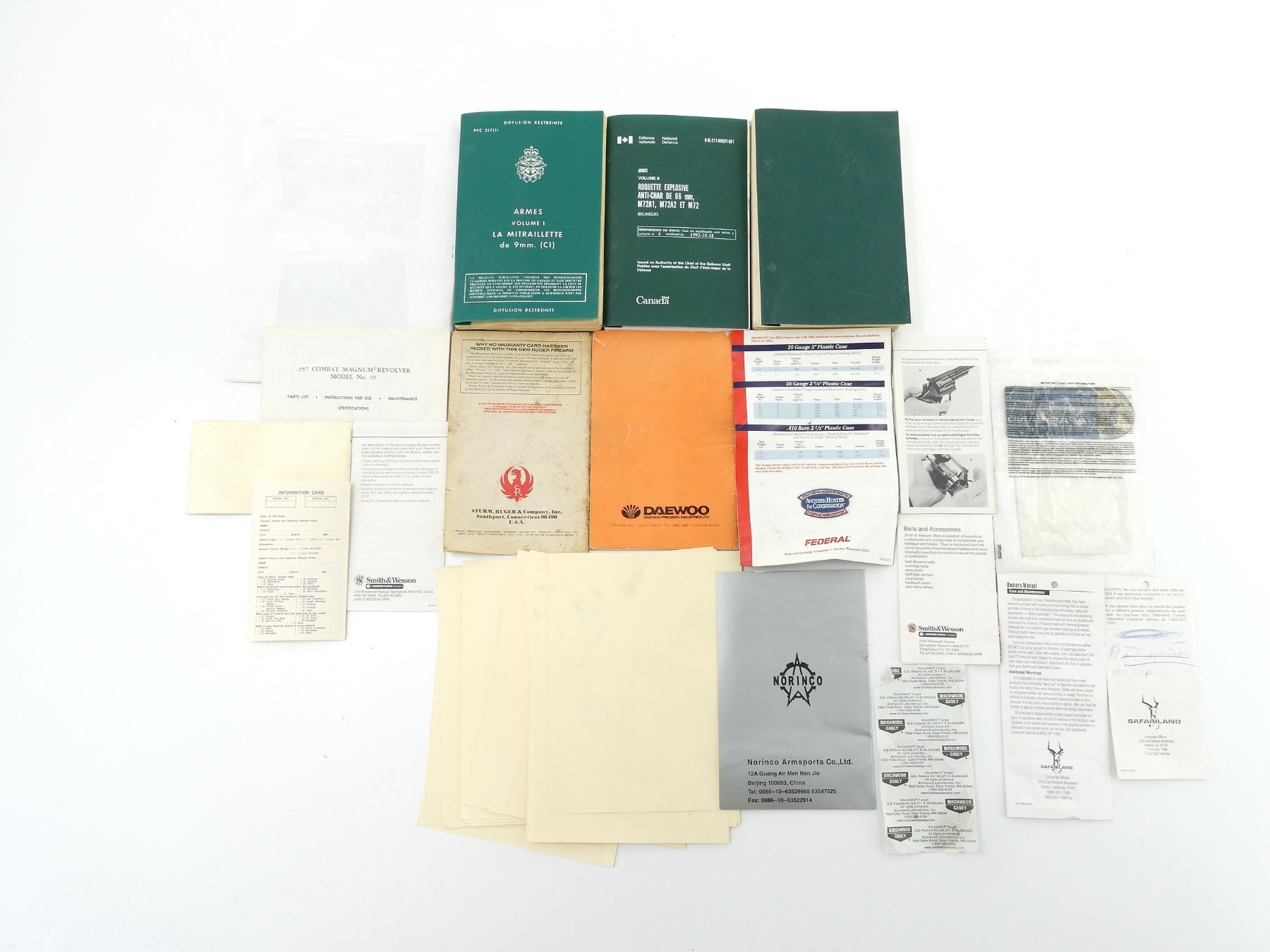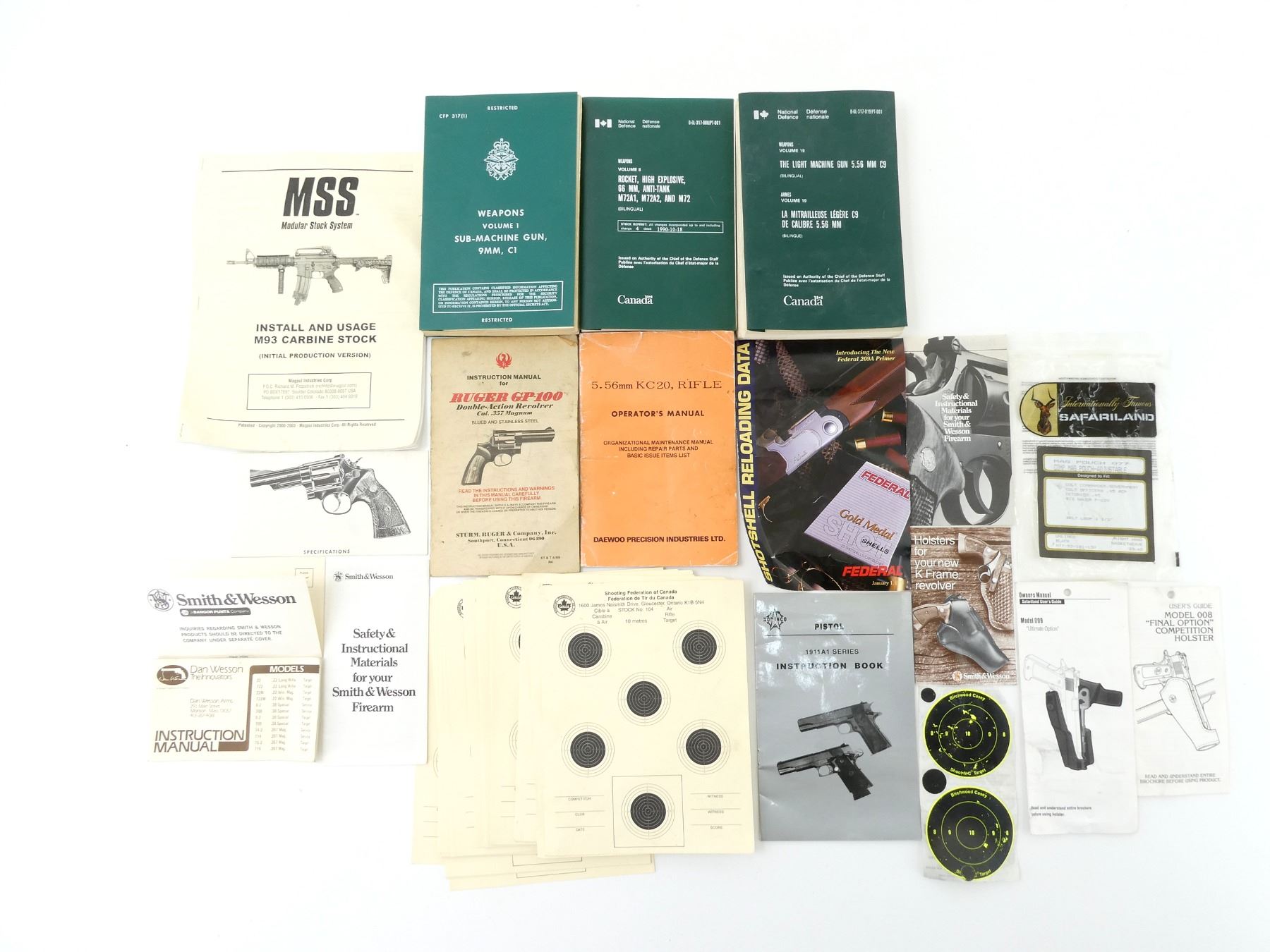 LOT INCLUDES; (1) "WEAPONS VOLUME 1 SUB-MACHINE GUN, 9MM, C1" BOOK BY NATIONAL DEFENCE, ENGLISH & FRENCH, BOUND SOFT COVER, DATED 1976, (1) "WEAPONS VOLUME 8 ROCKET, HIGH EXPLOSIVE, 66 MM, ANTI-TANK M72A1, M72A2 AND M72" BOOK BY NATIONAL DEFENCE, ENGLISH & FRENCH, BOUND SOFT COVER, DATED 1976, (1) "WEAPONS VOLUME 19 THE LIGHT MACHINE GUN 5.56 MM C9" BOOK BY NATIONAL DEFENCE, ENGLISH & FRENCH, BOUND SOFT COVER, DATED 1987, (2) "SAFETY AND INSTRUCTION MATERIALS FOR YOUR SMITH & WESSON FIREARM", BY SMITH & WESSON, SOFT COVER, (1) "PISTOL 1911A1 SERIES INSTRUCTION BOOK", BY NORINCO, SOFT COVER, (1) "5.56MM KC 20, RIFLE OPERATOR'S MANUAL", BY DAEWOO PRECISION INDUSTRIES LTD., SOFT COVER, (1) "INSTALL AND USAGE M93 CARBINE STOCK", BY MODULAR STOCK SYSTEM, SOFT COVER & (31) SHOOTING FEDERATION OF CANADA AIR RIFLE TARGETS, OVERALL LENGTH APPROX. 9" X 7", ETC. SEE PHOTOS.