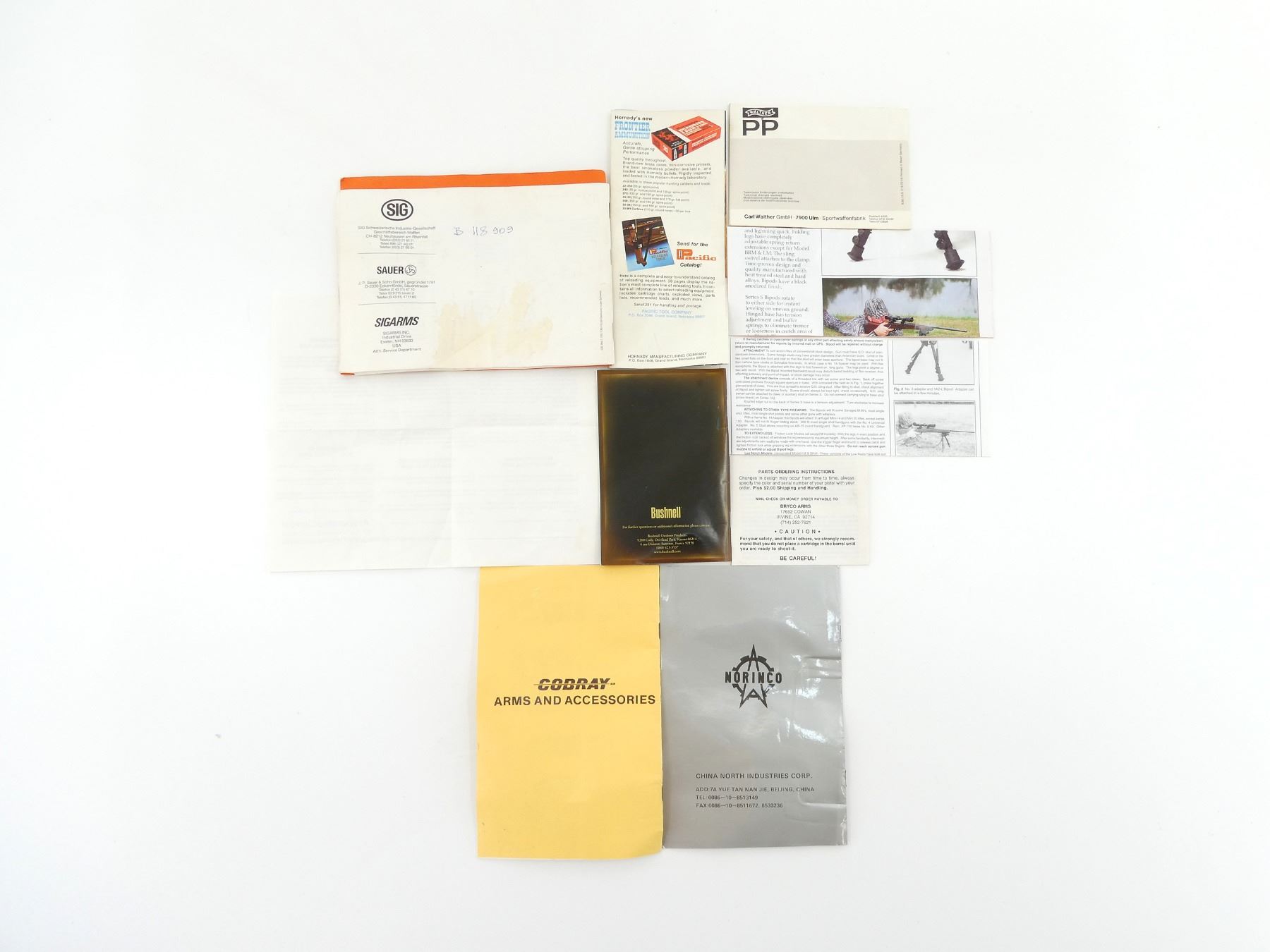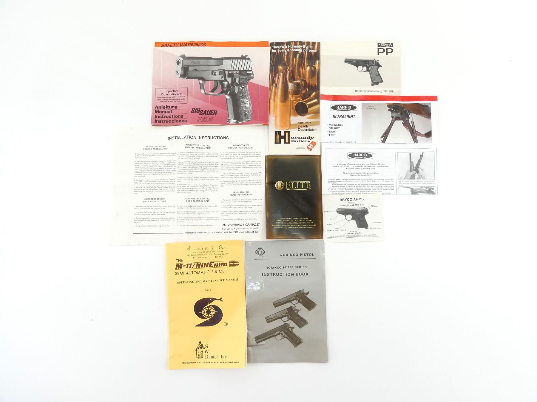 LOT INCLUDES; (1) "MODEL JENNINGS J-22 AND J-25" INSTRUCTIONS, BY BRYCO ARMS, (1) "THE M-11/NINE MM SEMI-AUTOMATIC PISTOL OPERATING AND MAINTENANCE MANUAL NO. 2", BY S W DANIEL INC., (1) "SIG SAUER P228" INSTRUCTION MANUAL, (1) "NORINCO PISTOL INSTRUCTION BOOK", (1) "BEDIENUNGSANLEITUNG PP/PPK" INSTRUCTION MANUAL, BY WALTHER & (1) "ELITE" INSTRUCTION MANUAL, BY BUSHNELL, ETC. SEE PHOTOS.