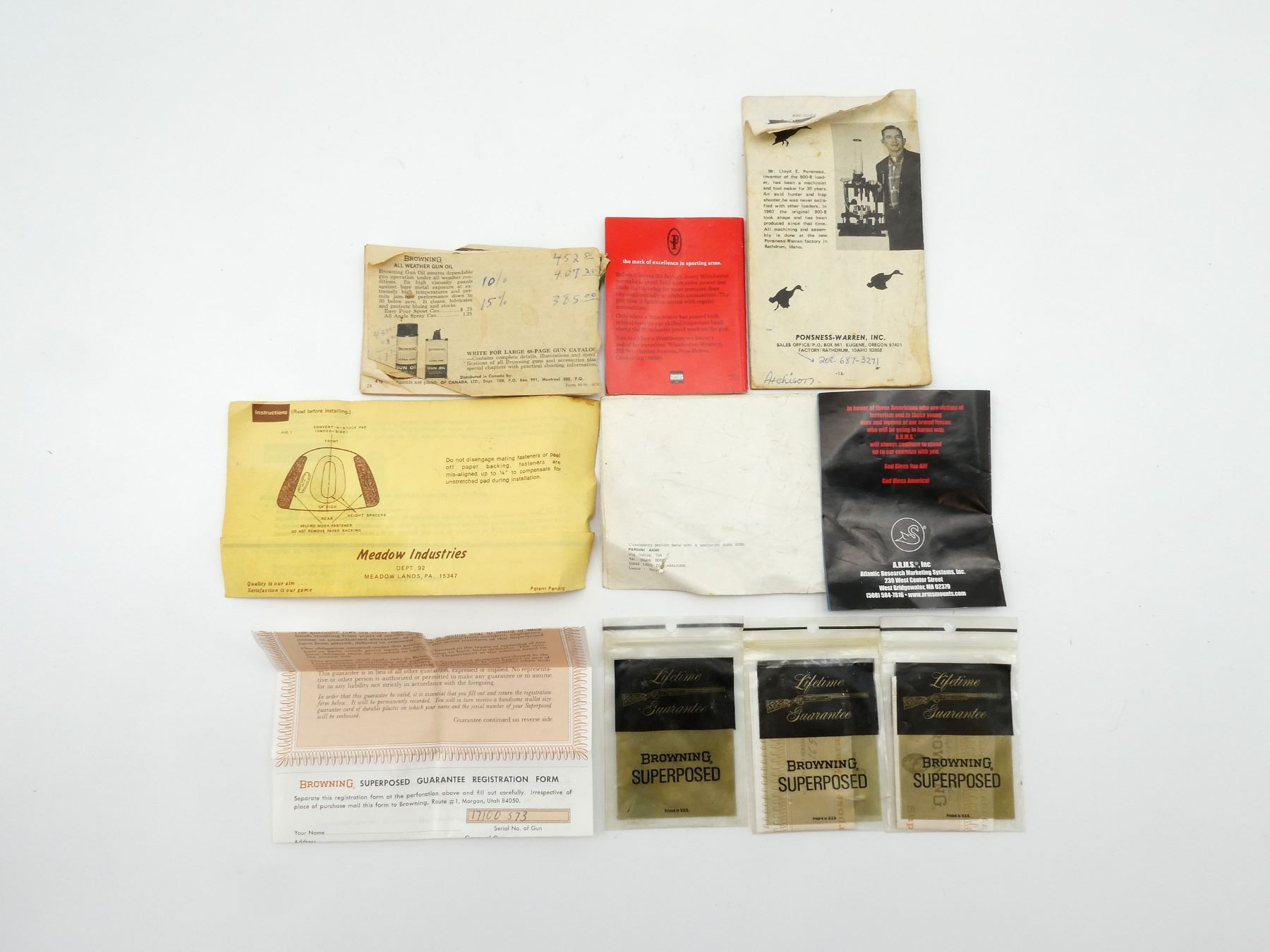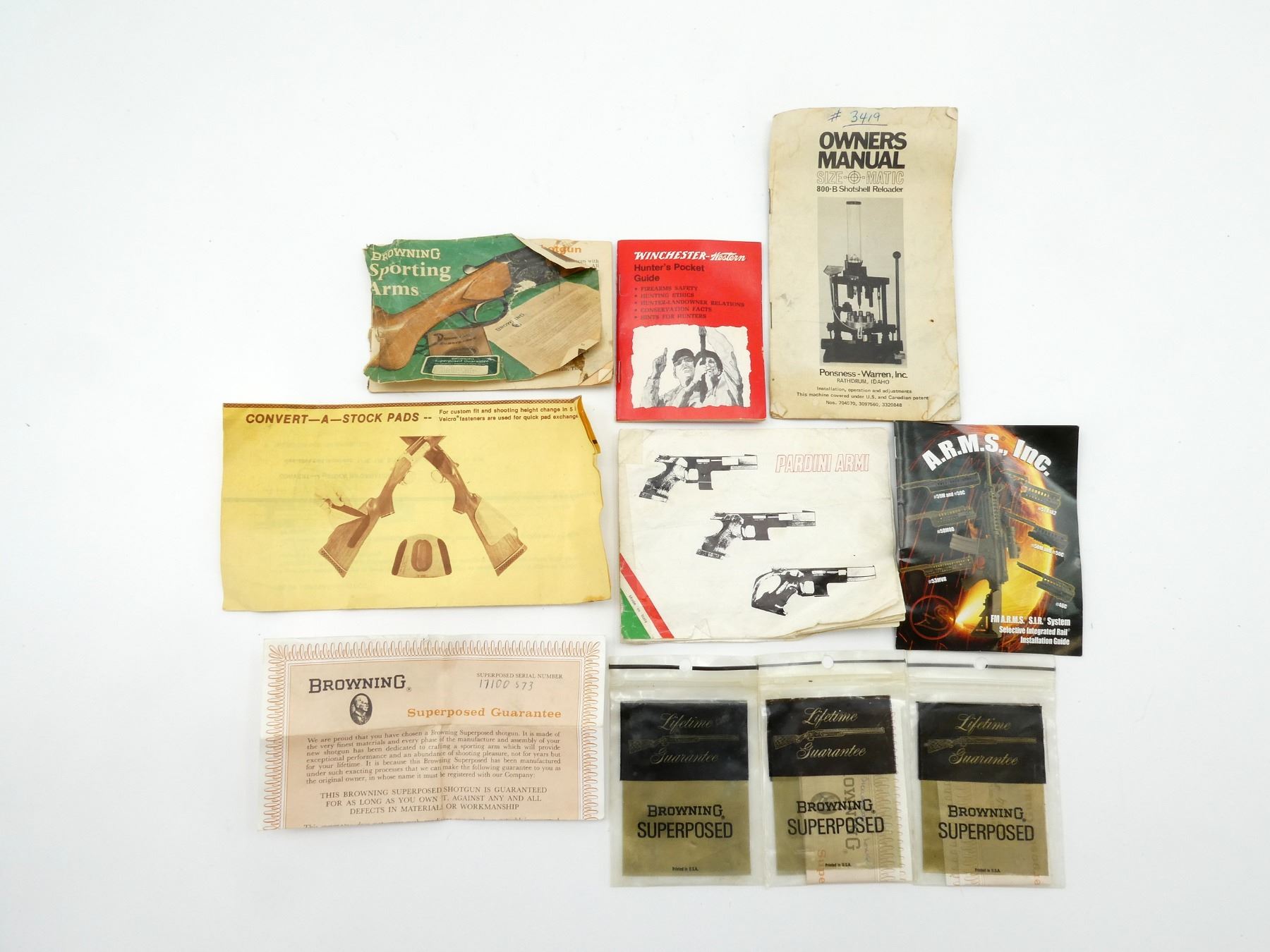 LOT INCLUDES; (1) "WINCHESTER HUNTER'S POCKET GUIDE" BOOK, BY WINCHESTER, SOFT COVER, (1) "BROWNING SPORTING ARMS" BOOK, BY BROWNING, SOFT COVER, (1) "FM A.R.M.S. S.I.R. SYSTEM SELECTIVE INTEGRATED RAIL INSTALLATION GUIDE", BY A.R.M.S. INC., SOFT COVER & (1) "OWNERS MANUAL SIZE-O-MATIC 800-B SHOTSHELL RELOADER", BY PONSNESS-WARREN INC., SOFT COVER, DATED 1970, ETC. SEE PHOTOS.