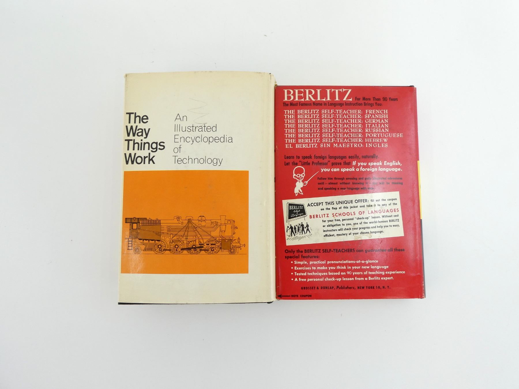 LOT INCLUDES; (1) "THE WAY THINGS WORK - AN ILLUSTRATED ENCYCLOPEDIA OF TECHNOLOGY" BOOK, BY SIMON & SCHUSTER, HARD COVER WITH DUST COVER, COPYRIGHT 1963 & "THE BERLITZ SELF-TEACHER: GERMAN" BOOK, BY GROSSET & DUNLAP, HARD COVER WITH DUST COVER, COPYRIGHT 1950. SEE PHOTOS.