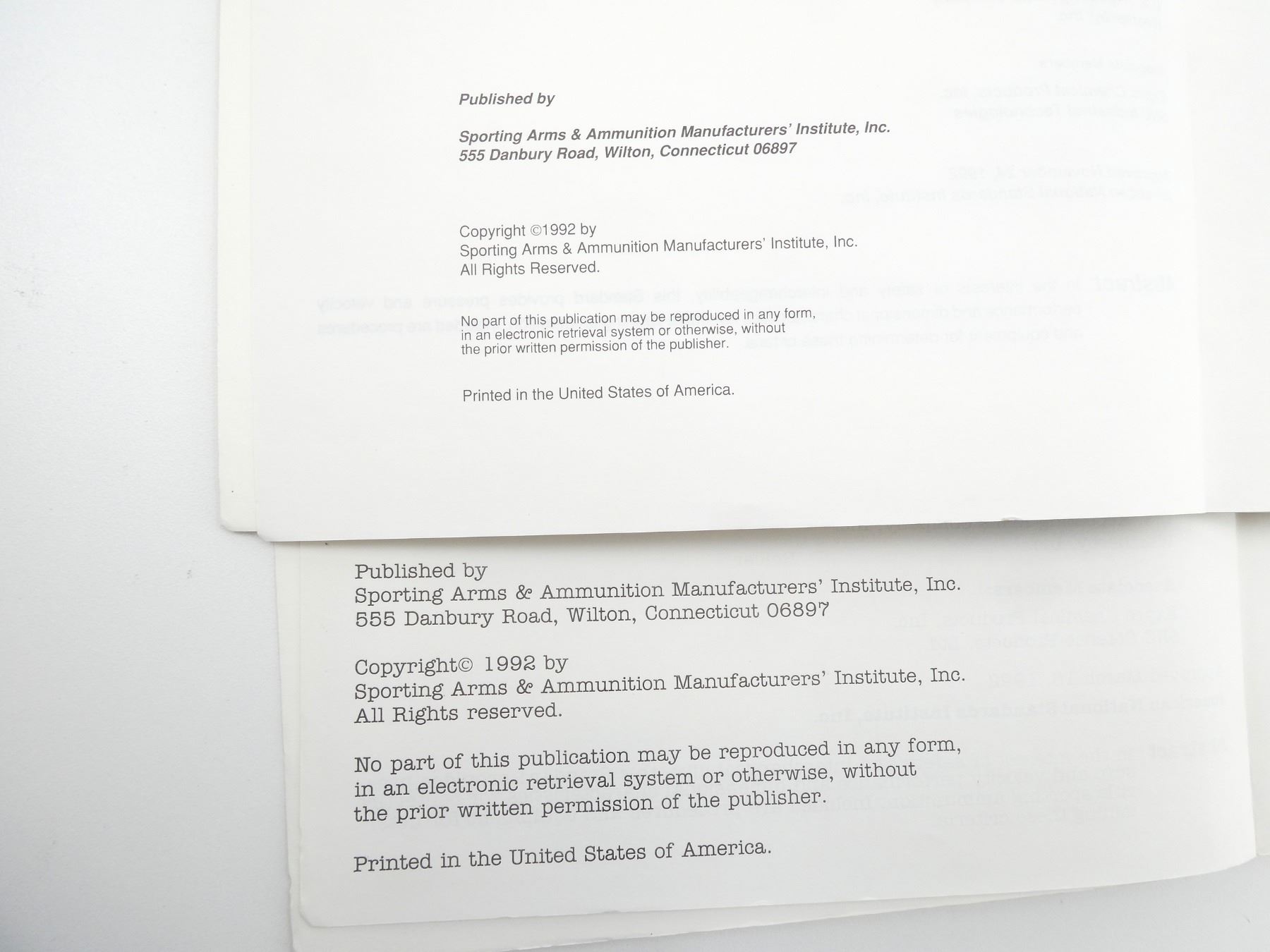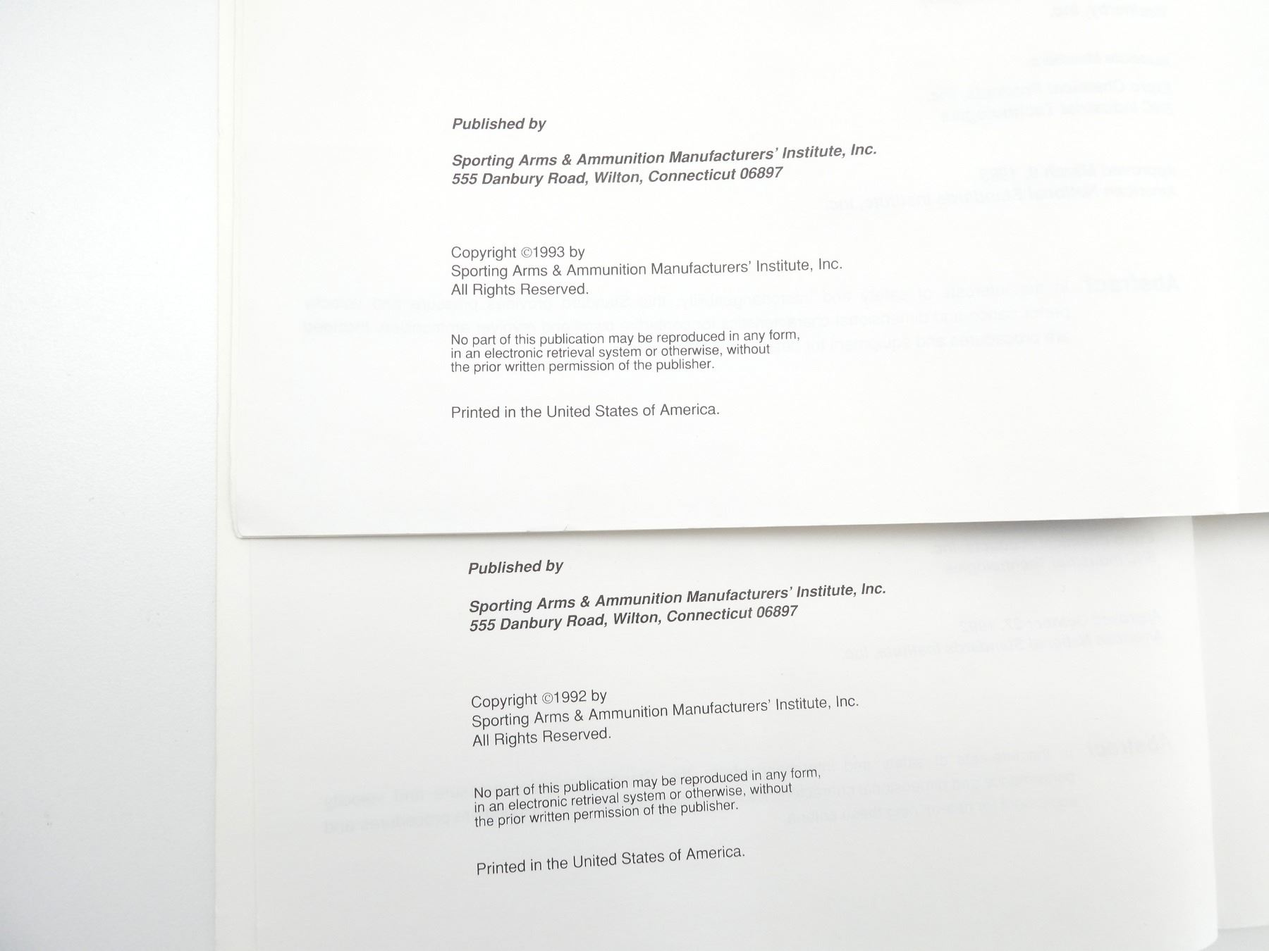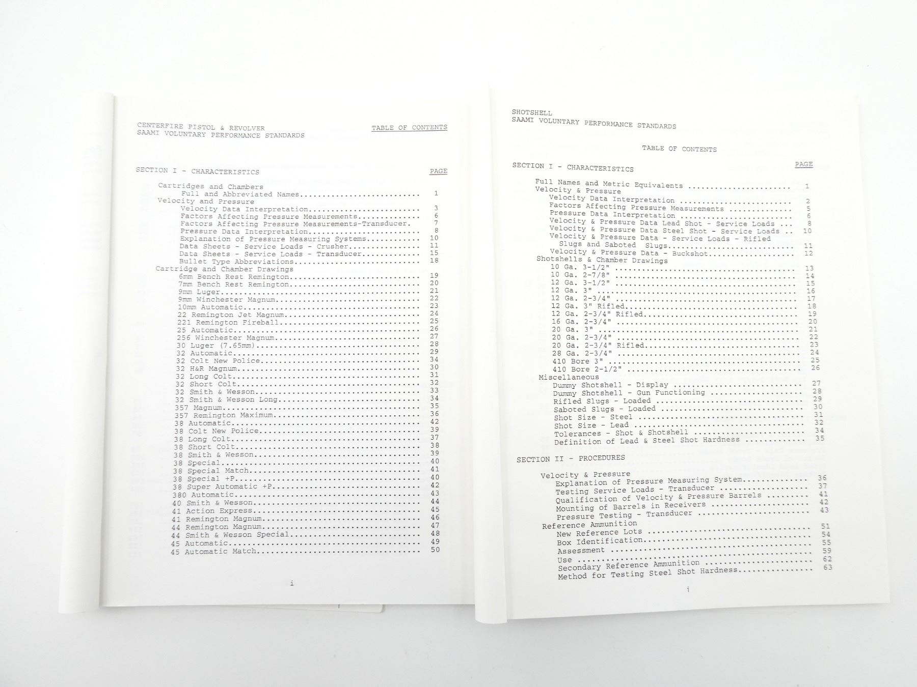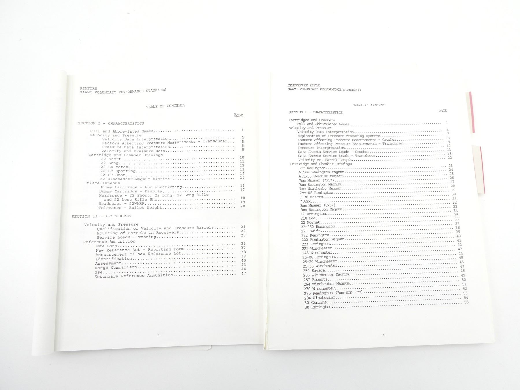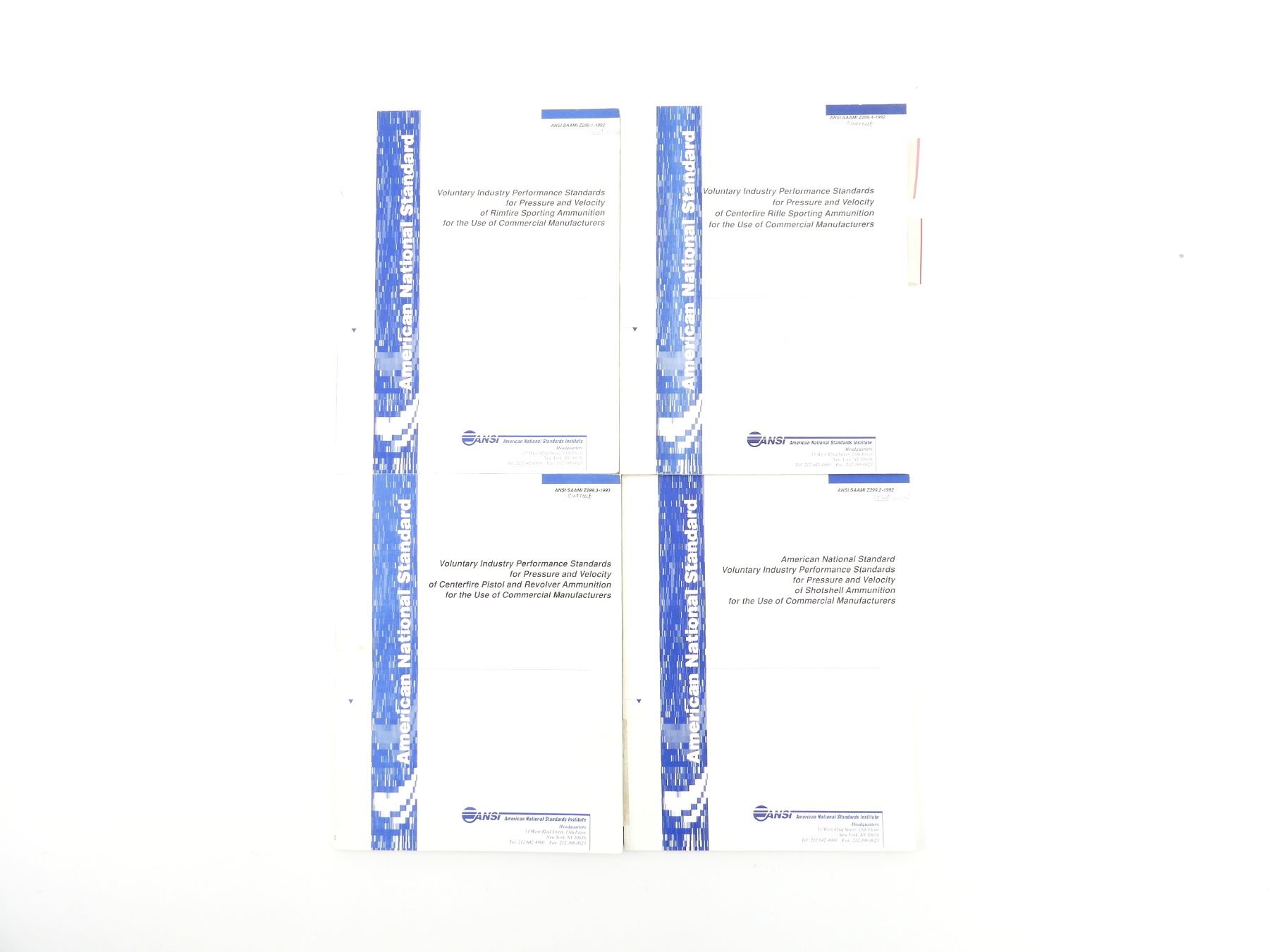 BY AMERICAN NATIONAL STANDARD INSTITUTE, SOFT COVERS, LOT INCLUDES; (1) "VOLUNTARY INDUSTRY PERFORMANCE STANDARDS FOR PRESSURE AND VELOCITY OF CENTERFIRE PISTOL AND REVOLVER AMMUNITION FOR THE USE OF COMMERCIAL MANUFACTURERS" BOOK, COPYRIGHT 1993, (1) "AMERICAN NATIONAL STANDARD VOLUNTARY INDUSTRY PERFORMANCE STANDARDS FOR PRESSURE AND VELOCITY OF SHOTSHELL AMMUNITION FOR THE USE OF COMMERCIAL MANUFACTURERS" BOOK, COPYRIGHT 1992, (1) "VOLUNTARY INDUSTRY PERFORMANCE STANDARDS FOR PRESSURE AND VELOCITY OF RIMFIRE SPORTING AMMUNITION FOR THE USE OF COMMERCIAL MANUFACTURERS" BOOK, COPYRIGHT 1992 & (1) "VOLUNTARY INDUSTRY PERFORMANCE STANDARDS FOR PRESSURE AND VELOCITY OF CENTERFIRE RIFLE SPORTING AMMUNITION FOR THE USE OF COMMERCIAL MANUFACTURERS" BOOK, COPYRIGHT 1992. SEE PHOTOS.