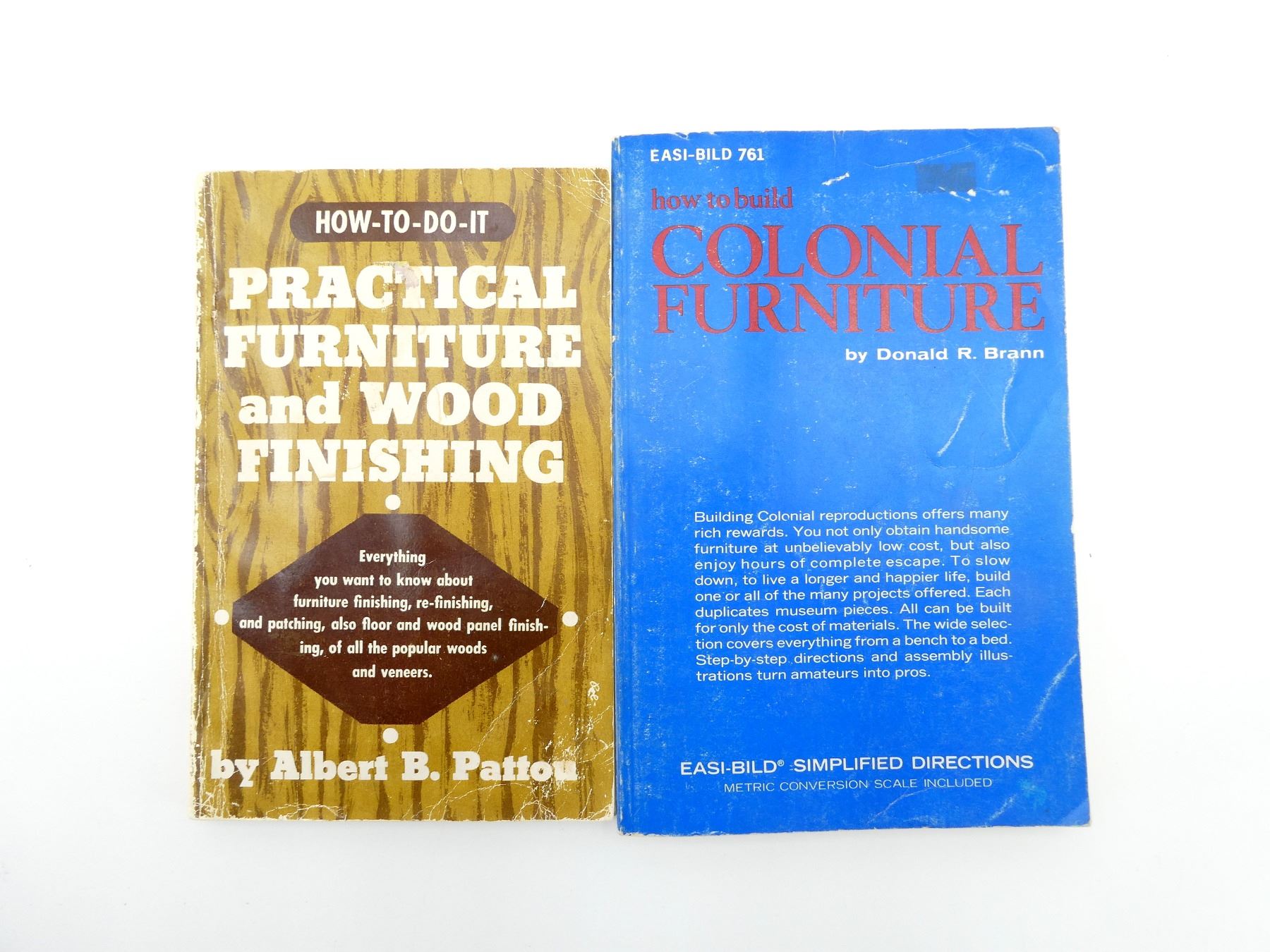 LOT INCLUDES; (1) "HOW TO BUILD COLONIAL FURNITURE" BOOK, BY DONALD R. BRANN, SOFT COVER, ISBN: 0-87733-761-6 & "HOW-TO-DO-IT PRACTICAL FURNITURE AND WOOD FINISHING" BOOK, BY ALBERT B. PATTOU, SOFT COVER, COPYRIGHT 1956. SEE PHOTOS.