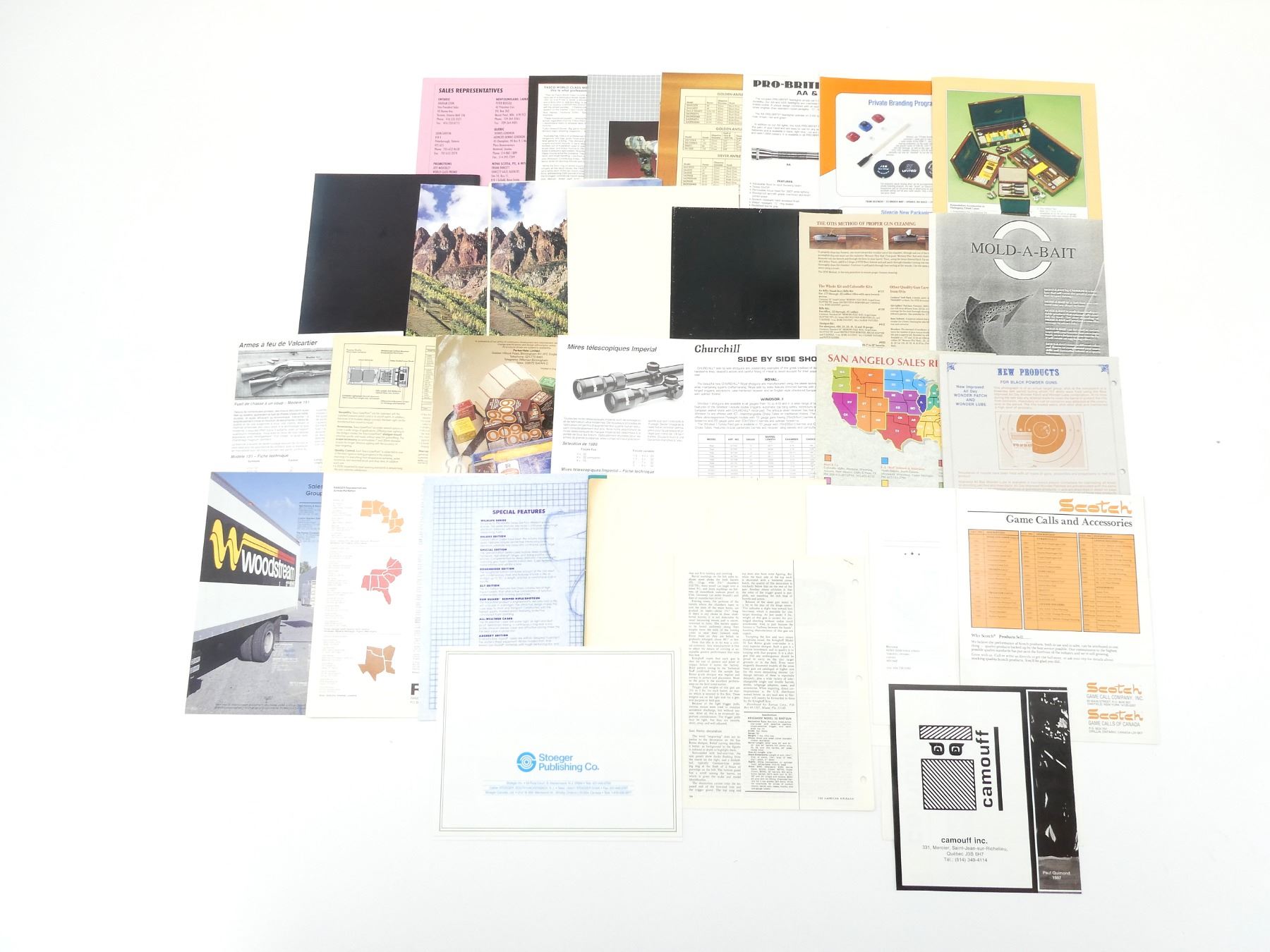 SOFT COVERS, LOT INCLUDES; (5) "TASCO SPORTS OPTICS" CATALOGUES, (1) "DAVLOCK" BROCHURE, (1) "PARKER-HALE QUALITY SHOOTING ACCESSORIES" BROCHURE, (1) "SPORTSMAN'S ACCESSORIES: AMERICA'S BEST SELLING OUTDOOR ACCESSORIES FOR OVER 30 YEARS" CATALOGUE, (1) "IMPERIAL TELESCOPIC SIGHTS" FLYER, (1) "GUN GUARD '93" CATALOGUE, (1) "OTIS FIELD CLEANING SYSTEM" FLYER, (1) "FIELD LOCKER QUALITY GUN AND BOW CASES" BROCHURE, (1) "A 'DOPE BAG' REPORT: KRIEGHOFF 32 SHOTGUN AN 'EYECATCHER'" ARTICLE, DATED AUGUST 15, 1969, (1) "MORGAN ADJUSTABLE RECOIL PAD FOR SHOTGUNS AND RIFLES" FLYER, (1) "CHURCHILL SIDE BY SIDE SHOTGUNS" FLYER, (1) "CAMOUFF" BROCHURE & PRICE LIST, (1) "RANGER '81" CATALOGUE, (1) "PRO-BRITE AA & AAA FLASHLIGHTS" FLYER, (1) "GAME CALLS DOUBLE REED DUCK CALL 1477" BROCHURE, (1) "TRAP 'EM ALIVE" FLYER, (1) "FIREARMS FROM VALCARTIER" FLYER, (1) "STOEGER #1 IN GREAT OUTDOOR BOOKS...#1 IN SALES AND PROFITS!" CATALOGUE, (1) "INTRODUCING THE TS SHELL CATCHERS" FLYER, (1) "TRIUS TRAP MASTER" FLYER, (1) "OX-YOKE ORIGINALS: ORIGINAL SHOOTING & GUN CLEANING PRODUCTS FOR EVERY TYPE OF GUN" CATALOGUE, & (1) "TEAM SILENCIO" CATALOGUE & PRICE LIST, ETC. SEE PHOTOS.
