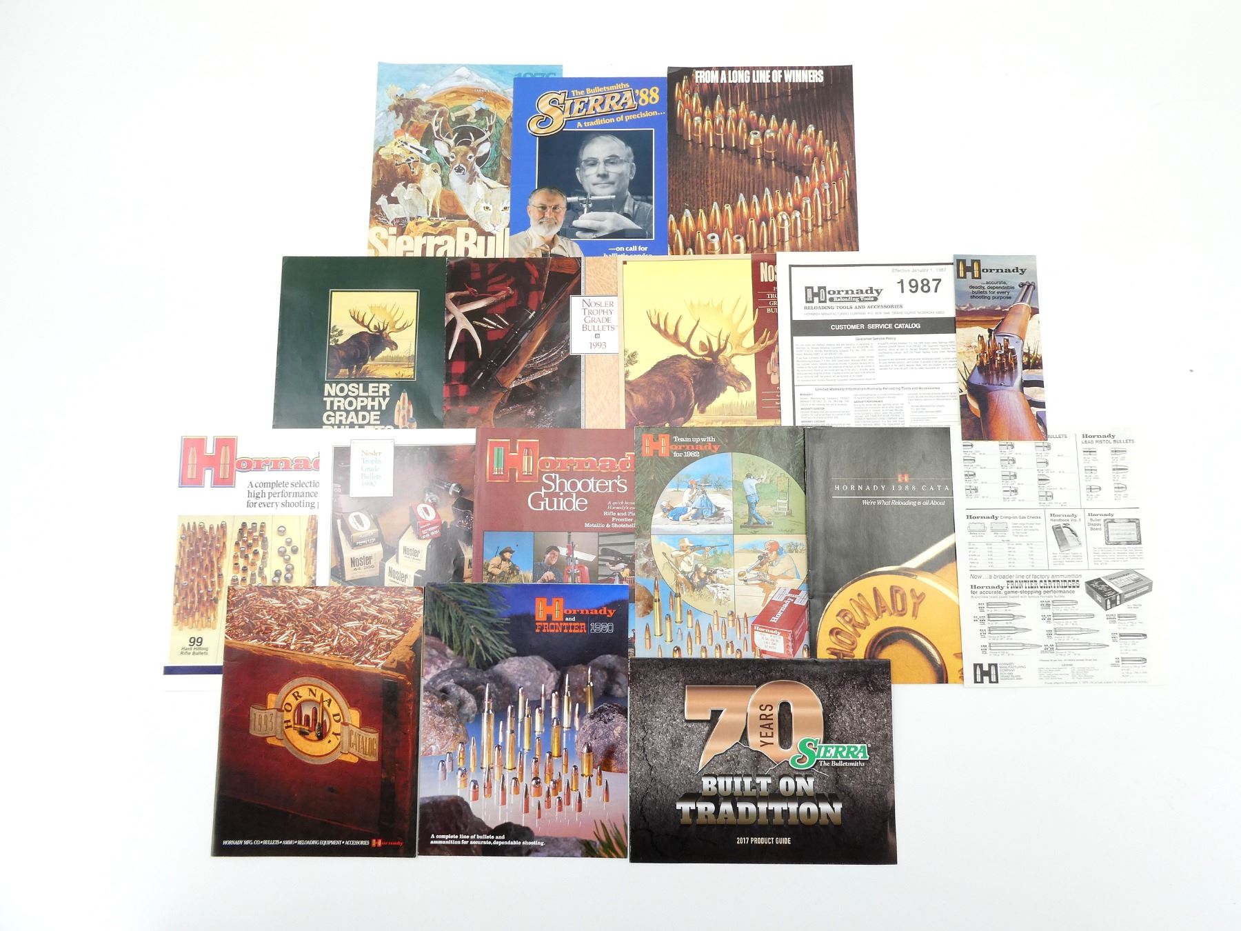 SOFT COVERS, LOT INCLUDES; (1) "HORNADY…ACCURATE, DEADLY, DEPENDABLE BULLETS FOR EVERY SHOOTING PURPOSE" BROCHURE, (1) "HORNADY BULLETS - A COMPLETE SELECTION FOR HANDLOADING" FLYER, (1) "TEAM UP WITH HORNADY FOR 1982" POSTER, (1) "HORNADY RELOADING TOOLS AND ACCESSORIES 1987 CUSTOMER SERVICE CATALOG", (1) "HORNADY 1993 CATALOG", (1) "HORNADY 1988 CATALOG", (1) "HORNADY AND FRONTIER 1980" POSTER, (1) "HORNADY - A COMPLETE SELECTION OF HIGH PERFORMANCE BULLETS FOR EVERY SHOOTING PURPOSE" POSTER, (1) "HORNADY SHOOTER'S GUIDE", (1) "NOSLER 1988 TROPHY GRADE BULLETS" BROCHURE, (1) "NOSLER TROPHY GRADE BULLETS 1986" BROCHURE, (1) "NOSLER TROPHY GRADE BULLETS 1993" BROCHURE, (1) "NOSLER TROPHY GRADE BULLETS 1990", (1) "SIERRA '88" BROCHURE, (1) "SIERRA BULLETS" BROCHURE, (1) "SIERRA THE BULLETSMITHS 2017 PRODUCT GUIDE" & (1) "SIERRA BULLETS 1976" BROCHURE. SEE PHOTOS.