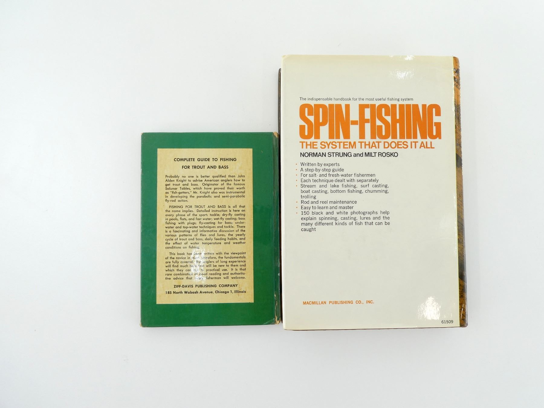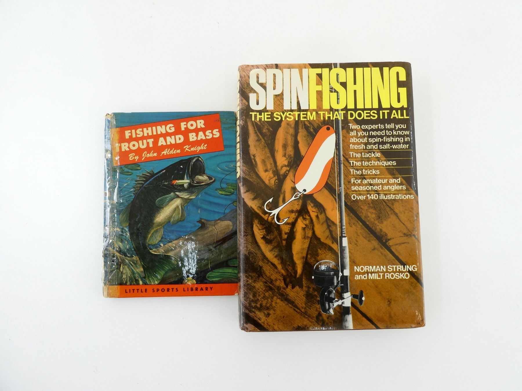 LOT INCLUDES; (1) "FISHING FOR TROUT AND BASS" BOOK, BY JOHN ALDEN KNIGHT, HARD COVER, COPYRIGHT 1949 & (1) "SPINFISHING: THE SYSTEM THAT DOES IT ALL" BOOK, BY NORMAN STRUNG & MILT ROSKO, HARD COVER WITH DUST COVER, COPYRIGHT 1973. SEE PHOTOS.