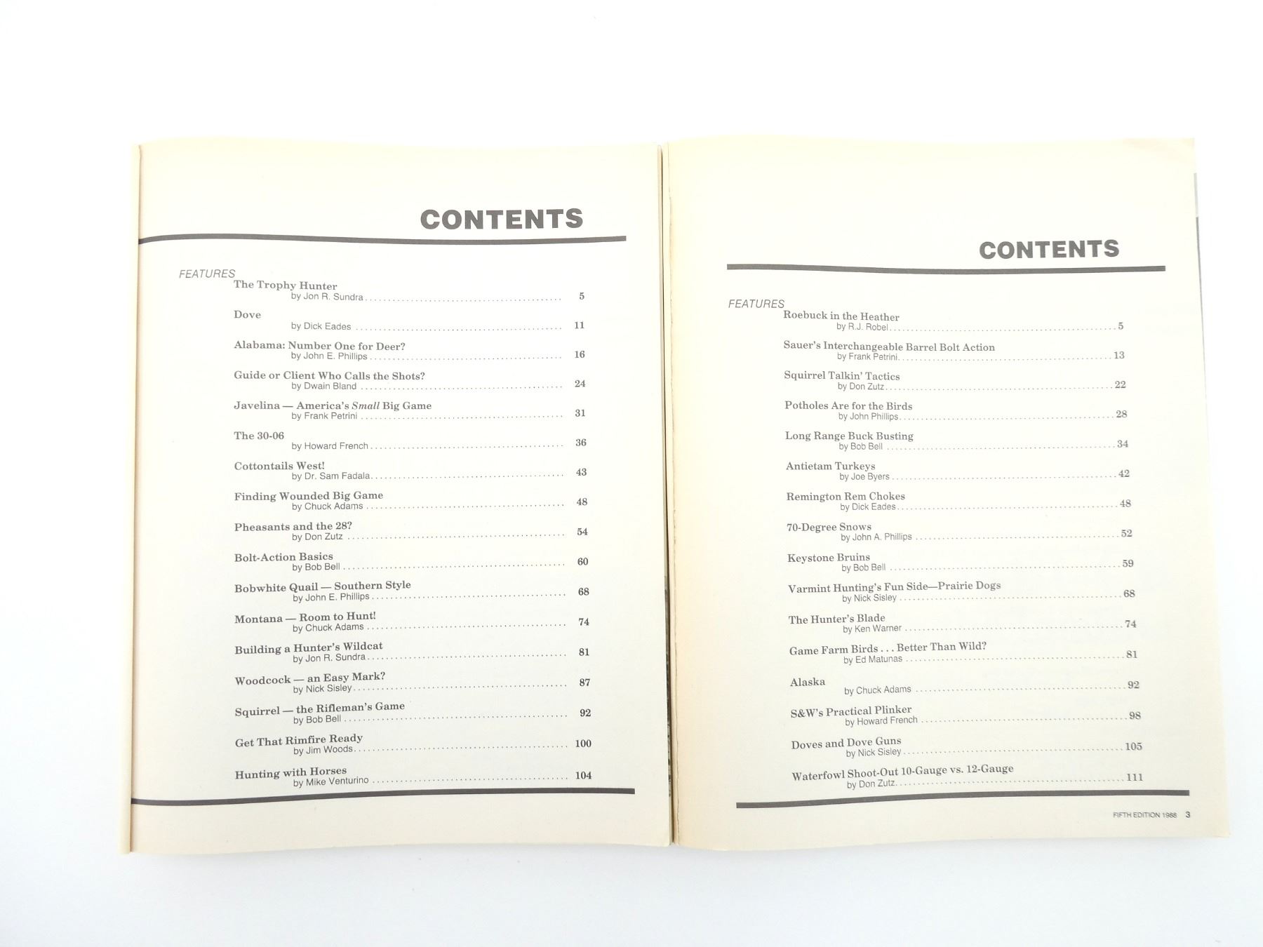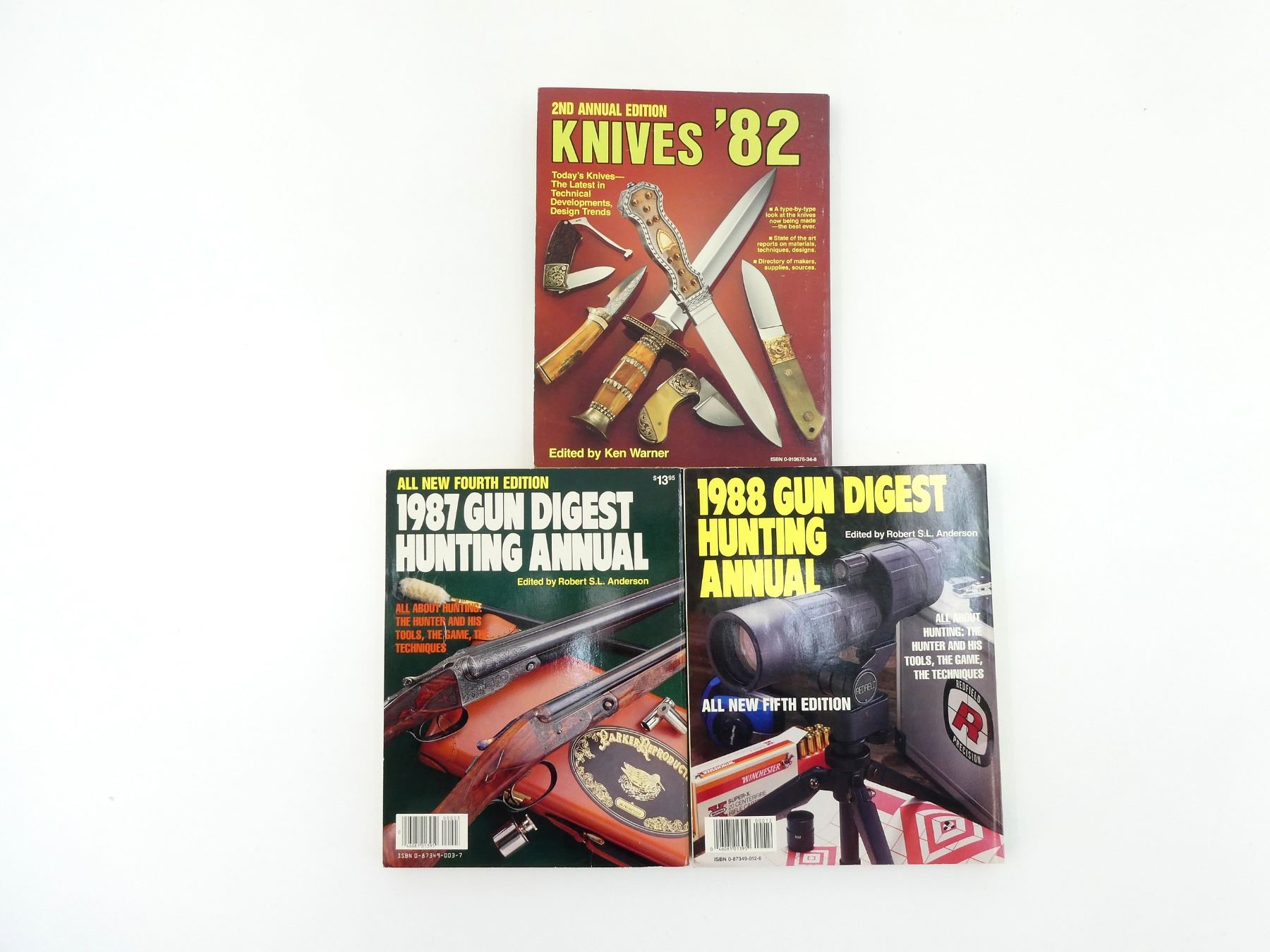 LOT INCLUDES; (1) "FOURTH EDITION 1987 GUN DIGEST HUNTING ANNUAL", EDITED BY ROBERT S.L. ANDERSON, SOFT COVER, ISBN: 0-87349-003-7, (1) "FIFTH EDITION 1988 GUN DIGEST HUNTING ANNUAL", EDITED BY ROBERT S.L. ANDERSON, SOFT COVER, ISBN: 0-87349-012-6 & (1) "2ND ANNUAL EDITION KNIVES '82", EDITED BY KEN WARNER, SOFT COVER, ISBN: 0-910676-34-8. SEE PHOTOS.
