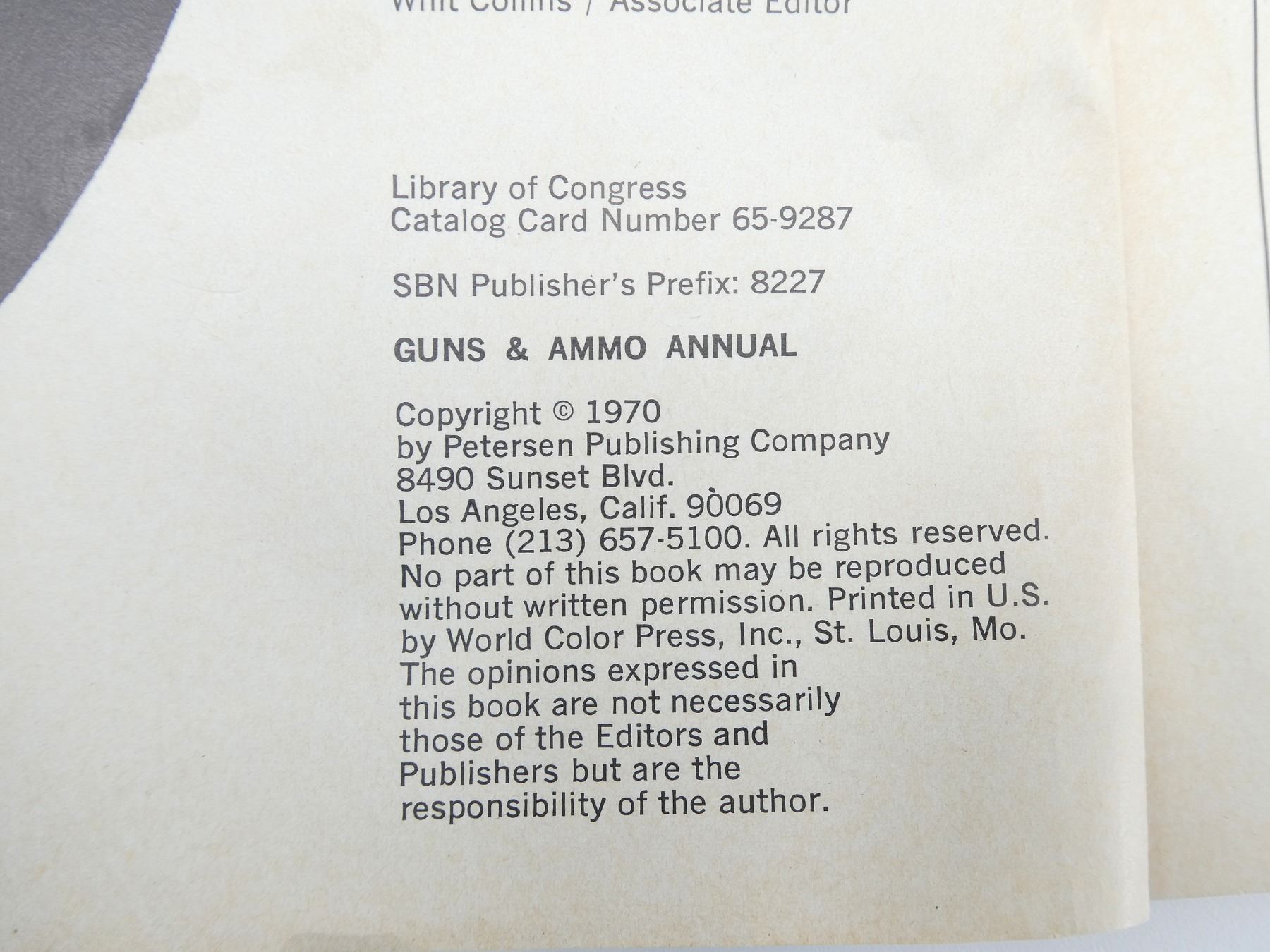 LOT INCLUDES; (1) "GUNS & AMMO 1971 ANNUAL" CATALOGUE, PUBLISHED BY PETERSEN PUBLISHING COMPANY, SOFT COVER, COPYRIGHT 1970, (1) "GUNS & AMMO 1972 ANNUAL" CATALOGUE, PUBLISHED BY PETERSEN PUBLISHING COMPANY, SOFT COVER, COPYRIGHT 1971 & (1) "GUNS & AMMO 1973 ANNUAL" CATALOGUE, PUBLISHED BY PETERSEN PUBLISHING COMPANY, SOFT COVER, COPYRIGHT 1972. SEE PHOTOS.