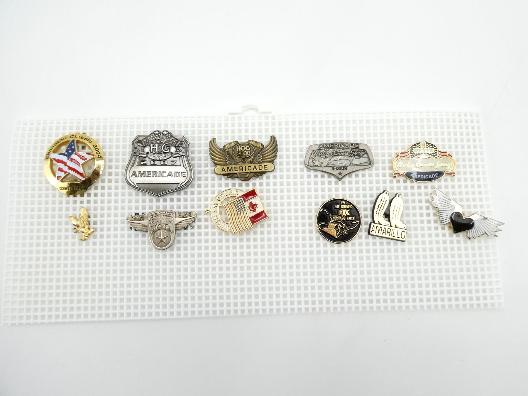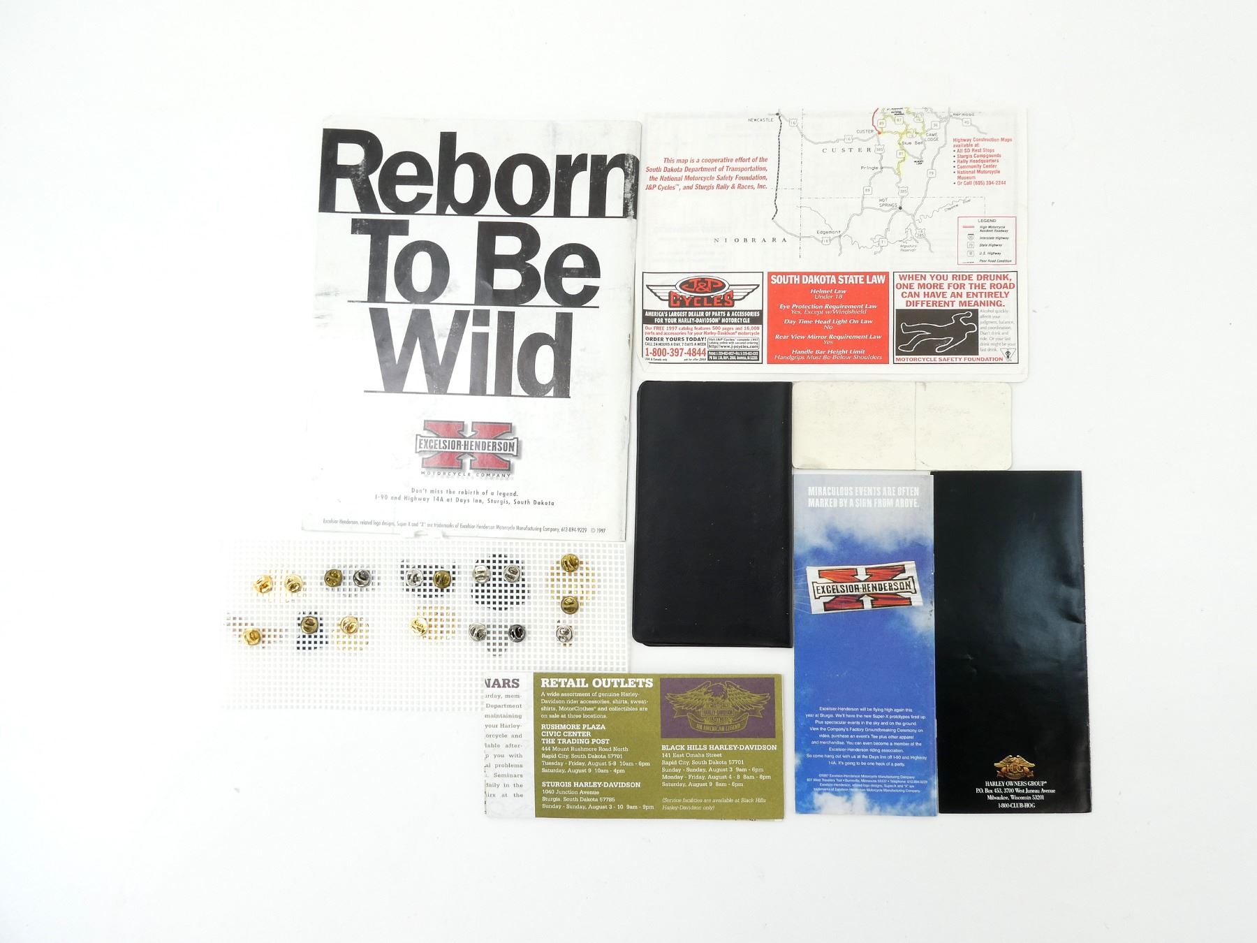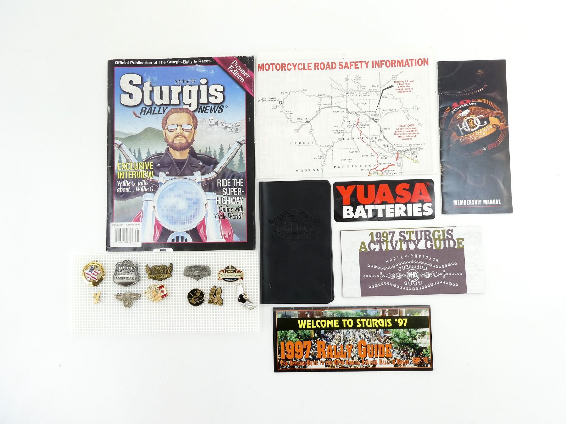 LOT INCLUDES; (2) ASSORTED STURGIS RALLY PAMPHLETS, 1997, (1) "STURGIS RALLY NEWS, SPRING '97" MAGAZINE, (1) "10TH ANNIVERSARY HARLEY OWNERS GROUP MEMBERSHIP MANUAL", (11) ASSORTED HARLEY OWNERS GROUP PINS, ETC. SEE PHOTOS.