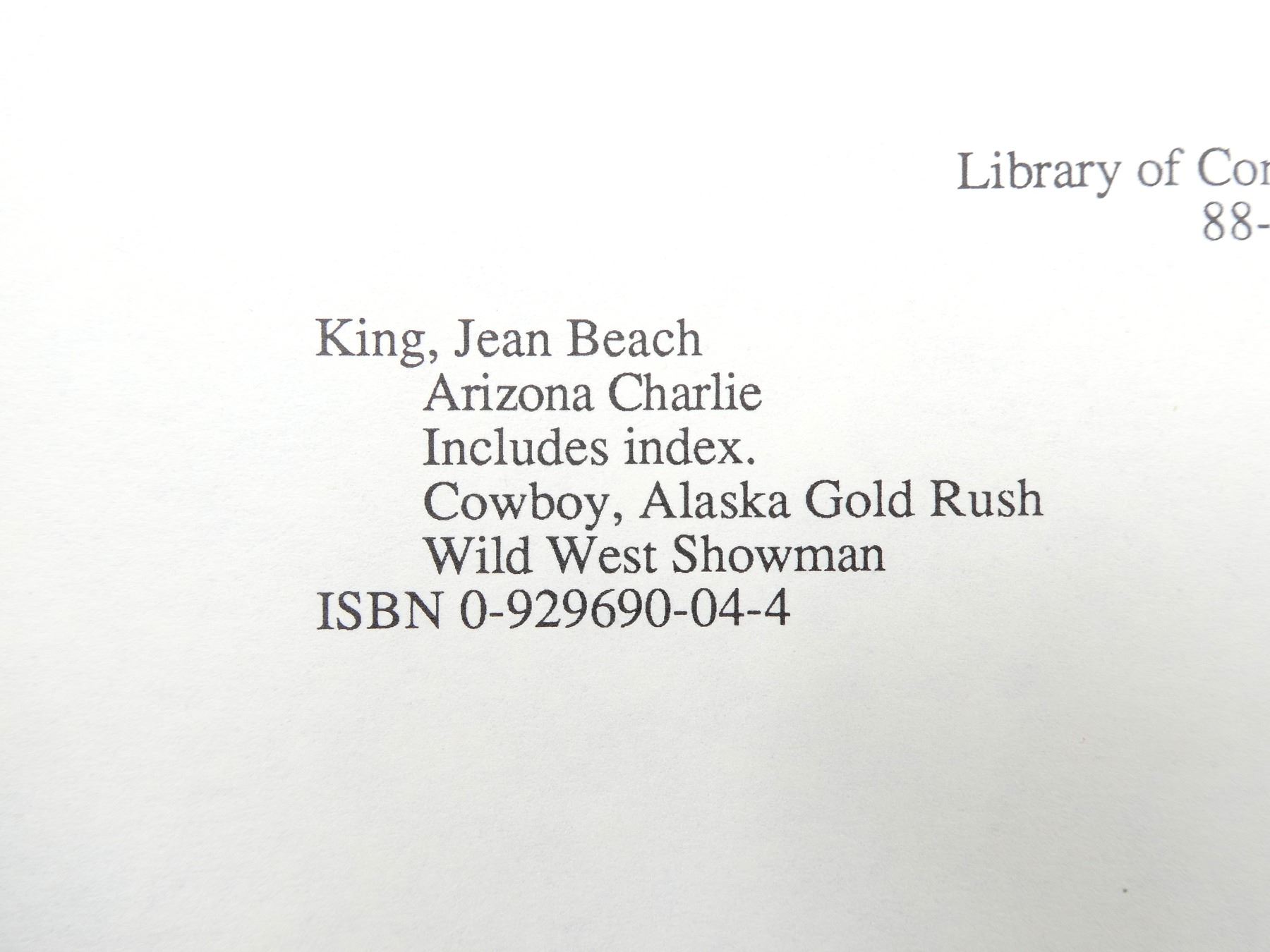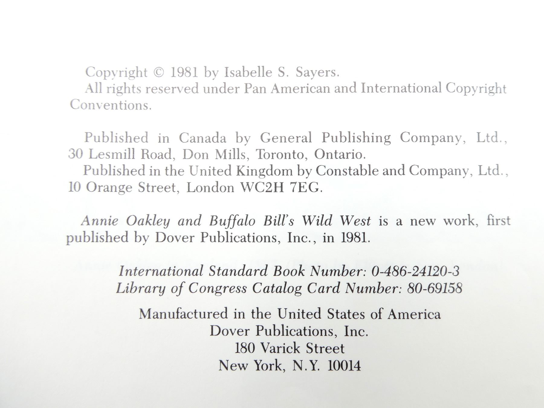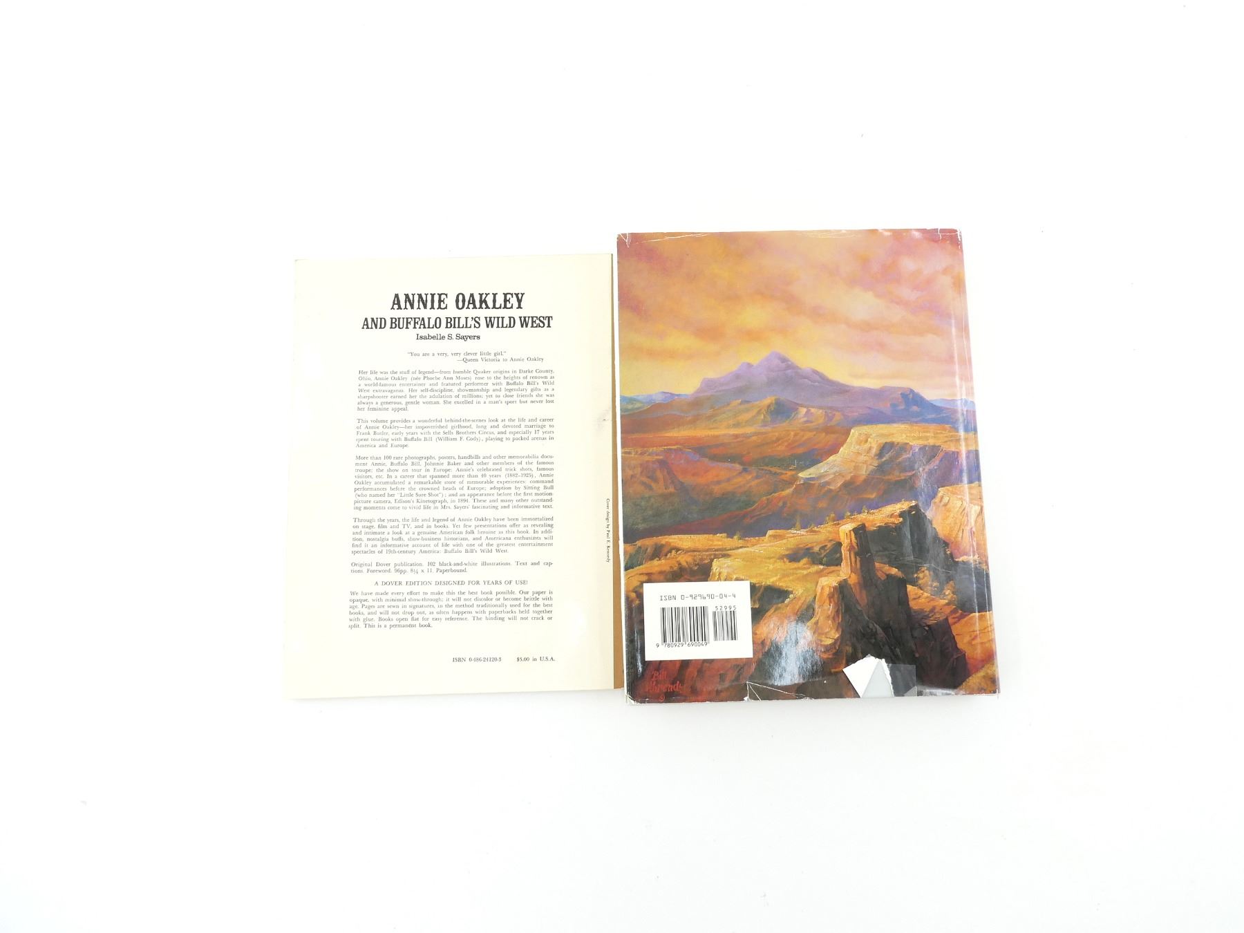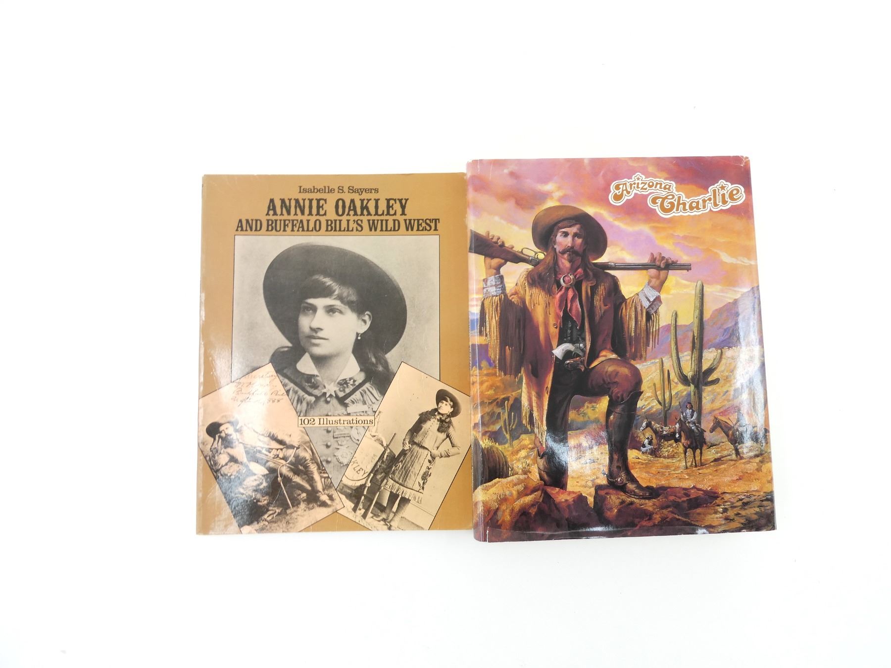 LOT INCLUDES; (1) "ANNIE OAKLEY AND BUFFALO BILL'S WILD WEST" BOOK BY ISABELLE S. SAYERS, SOFT COVER, ISBN: 0-486-24120-3 & (1) "ARIZONA CHARLIE" BOOK BY JEAN BEACH KING, HARD COVER WITH DUST COVER, ISBN: 0-929690-04-4. SEE PHOTOS.
