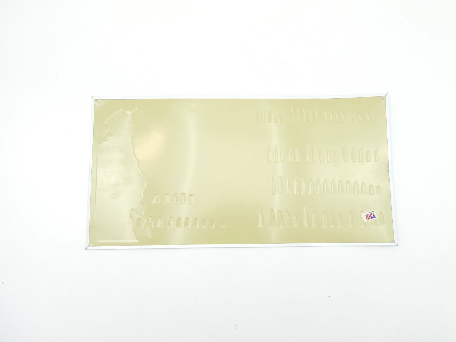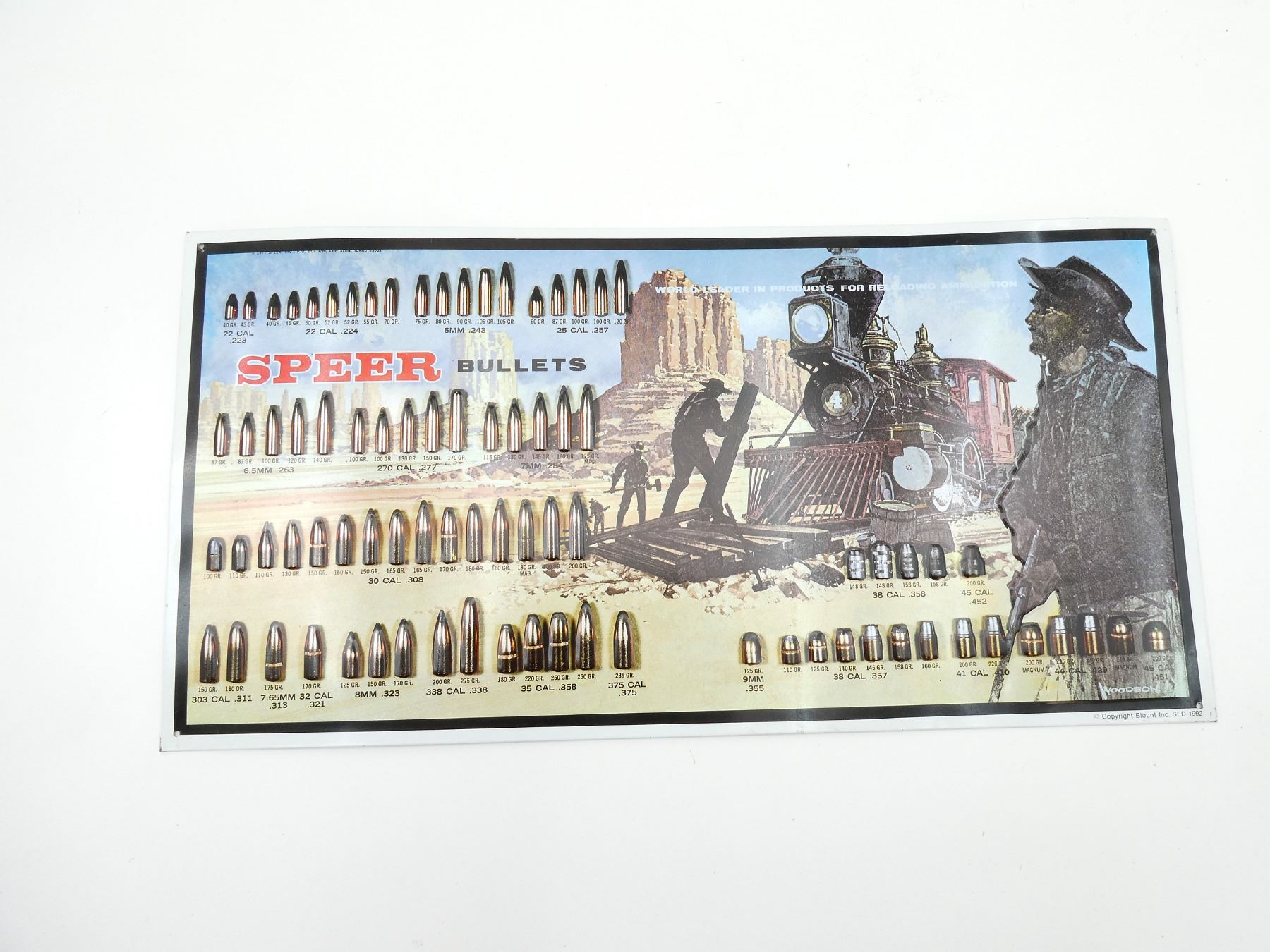 (1) COLOURED METAL SIGN, SHOWS .22 CAL. TO .45 CAL. VARIATIONS, RAILROAD SCENE BACKGROUND, MARKED: "SPEER BULLETS", "WOODSON", "BLOUNT INC. SED 1992", ETC., APPROX. 22" X 11 1/8". SEE PHOTOS.