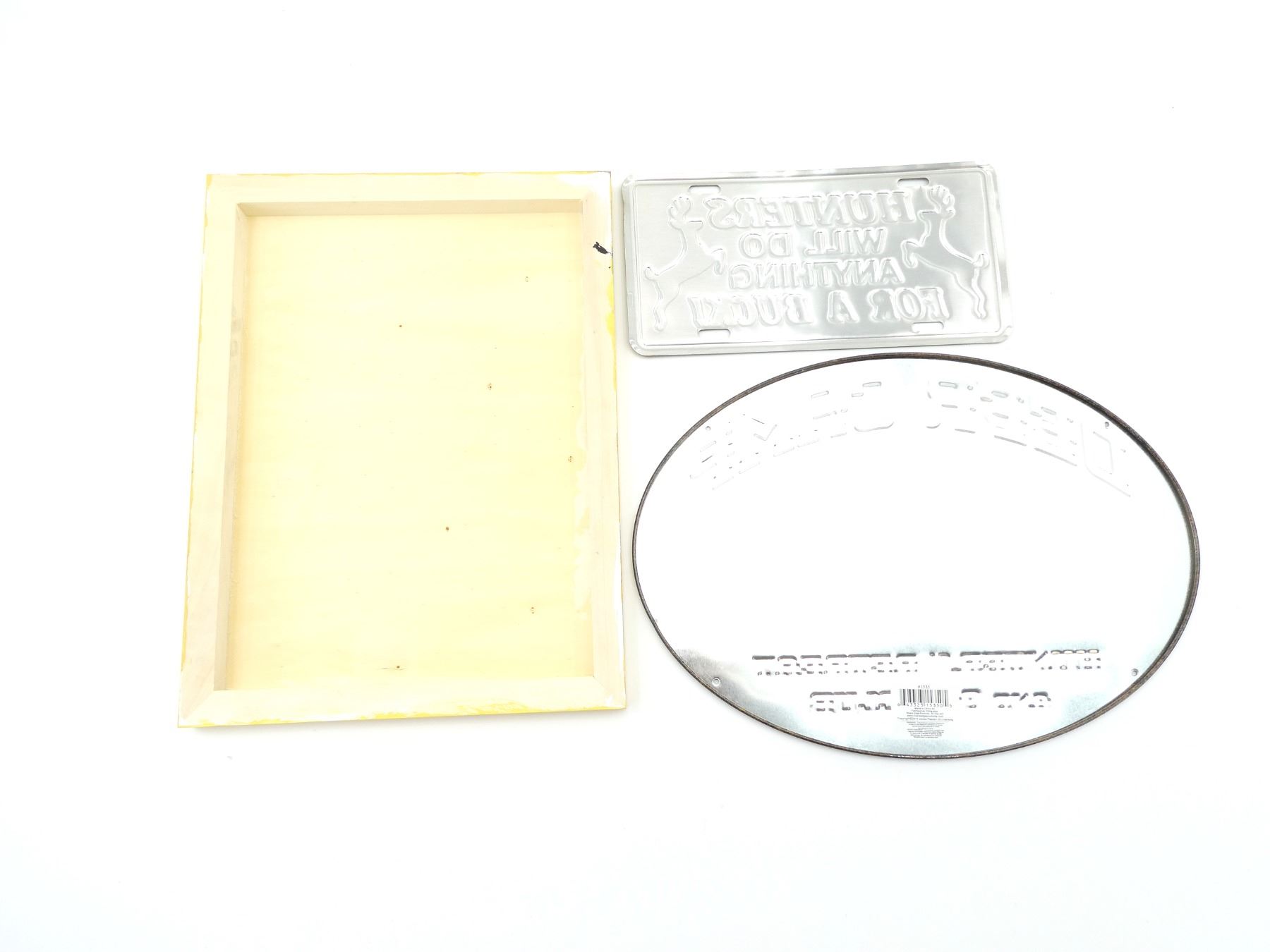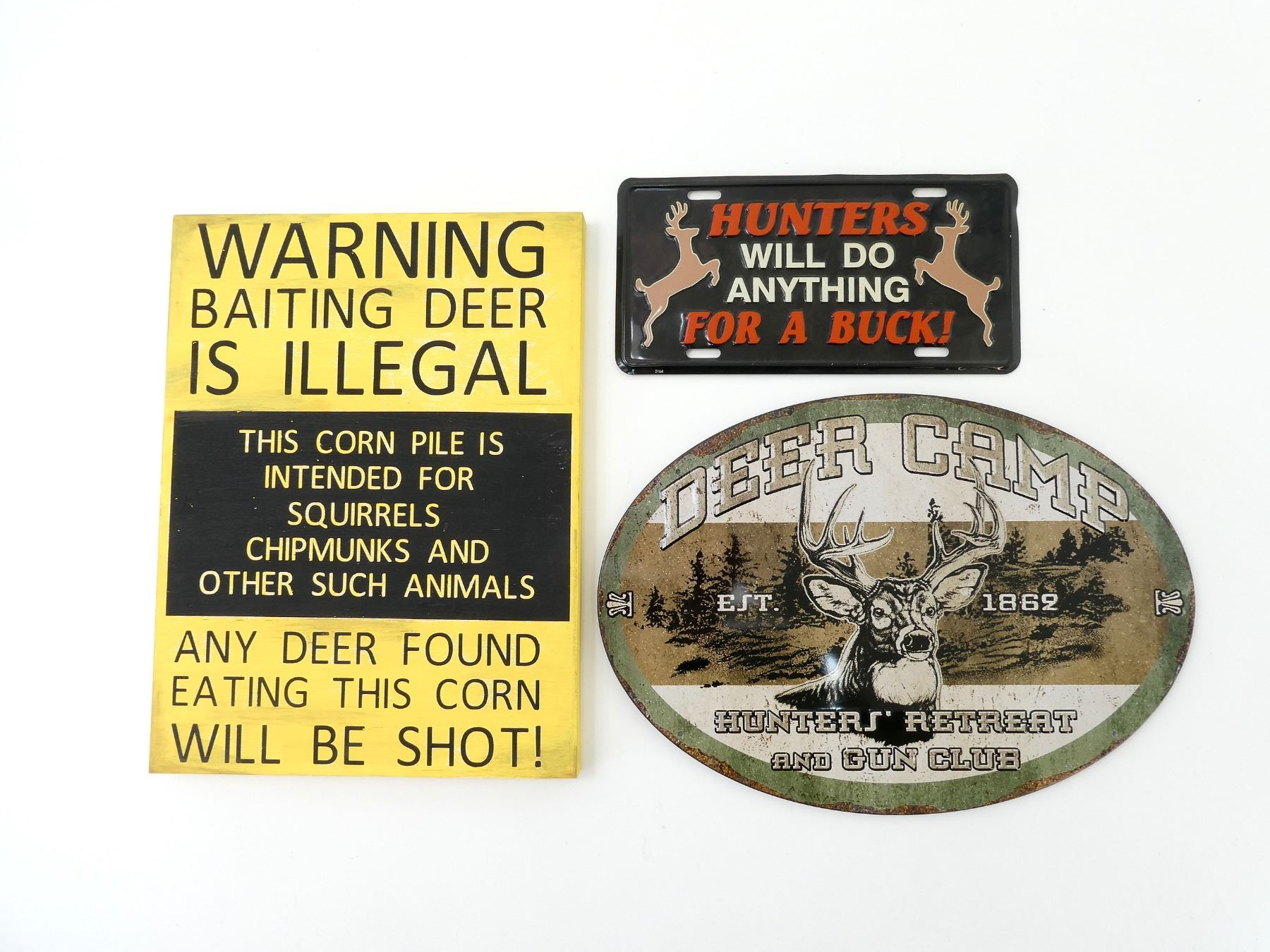 LOT INCLUDES; (1) METAL "DEER CAMP" SIGN, APPROX. 16.75" X 12", (1) WOOD "BAITING DEER IS ILLEGAL" SIGN, PAINTED YELLOW & BLACK & (1) "HUNTERS WILL DO ANYTHING FOR A BUCK" LICENSE PLATE, APPROX. 11 7/8" X 6". SEE PHOTOS.
