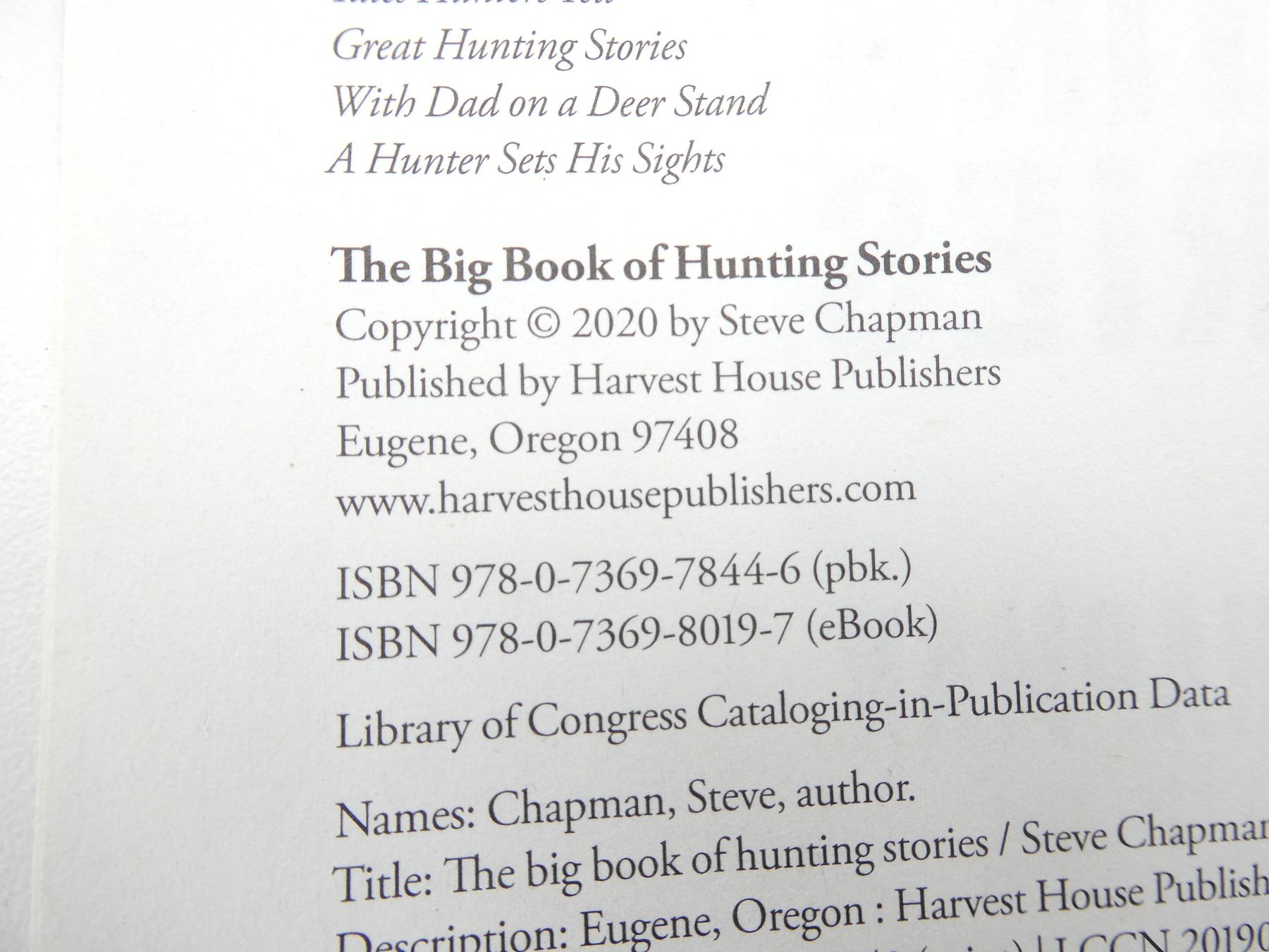 LOT INCLUDES; (1) "HUNTING NORTH AMERICA 1885-1911" BOOK EDITED BY FRANK OPPEL & TONY MEISEL, HARD COVER, ISBN: 1-55521-155-0 & (1) "THE BIG BOOK OF HUNTING STORIES, THE VERY BEST OF STEVE CHAPMAN" BOOK BY STEVE CHAPMAN, SOFT COVER, ISBN: 978-0-7369-7844-6. SEE PHOTOS.