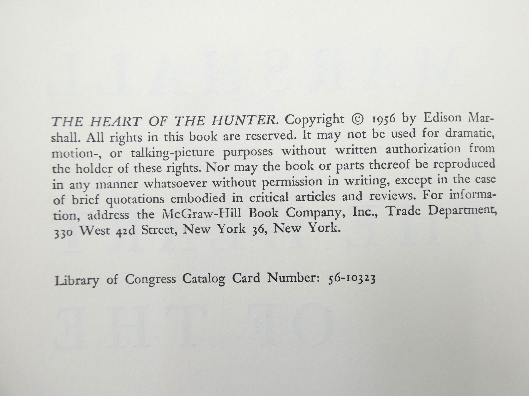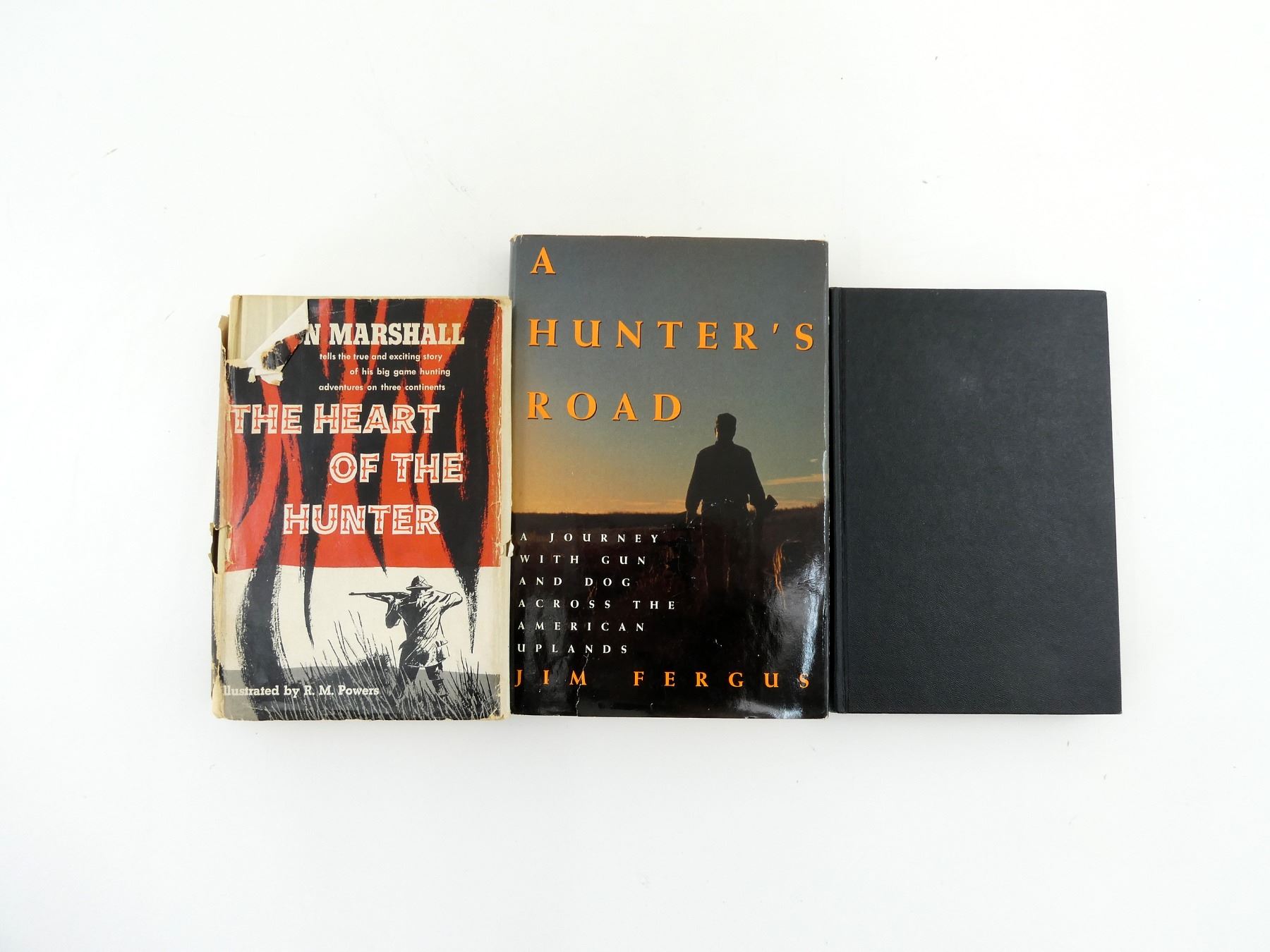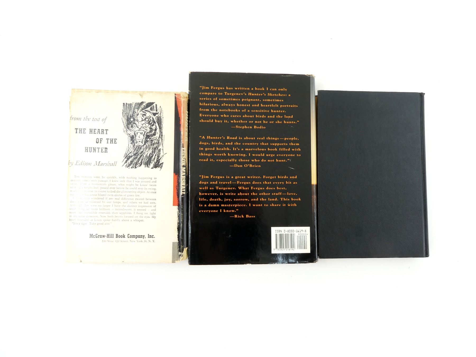 LOT INCLUDES; (1) "THE HEART OF THE HUNTER" BOOK BY EDISON MARSHALL, HARD COVER WITH DUST COVER, COPYRIGHT 1956, (1) "A HUNTER'S ROAD, A JOURNEY WITH GUN AND DOG ACROSS THE AMERICAN UPLANDS" BOOK BY JIM FERGUS, HARD COVER WITH DUST COVER, ISBN: 0-8050-1619-8 & (1) "THE FIERCEST HEART" BOOK BY STUART CLOETE, HARD COVER, COPYRIGHT 1960. SEE PHOTOS.