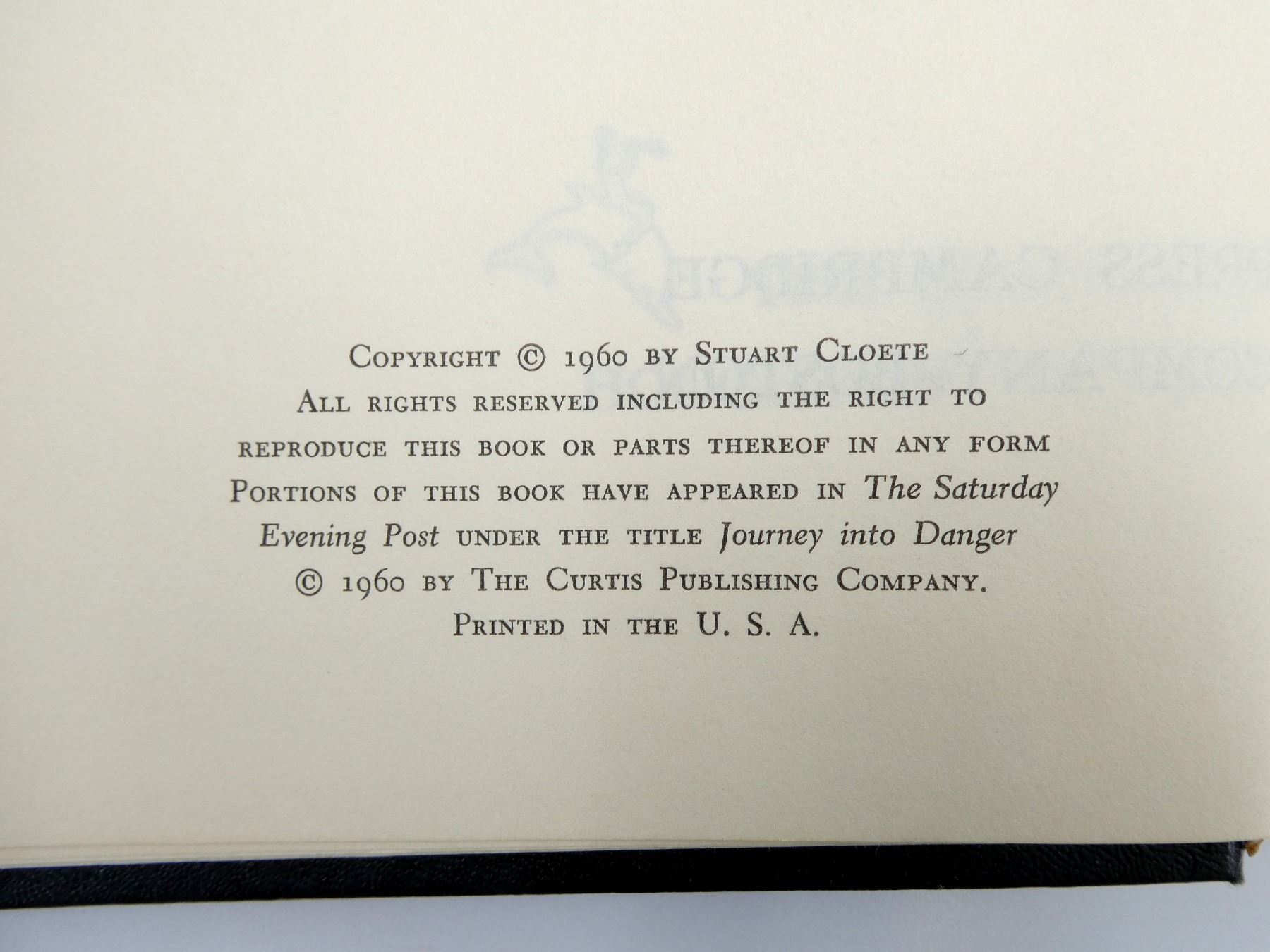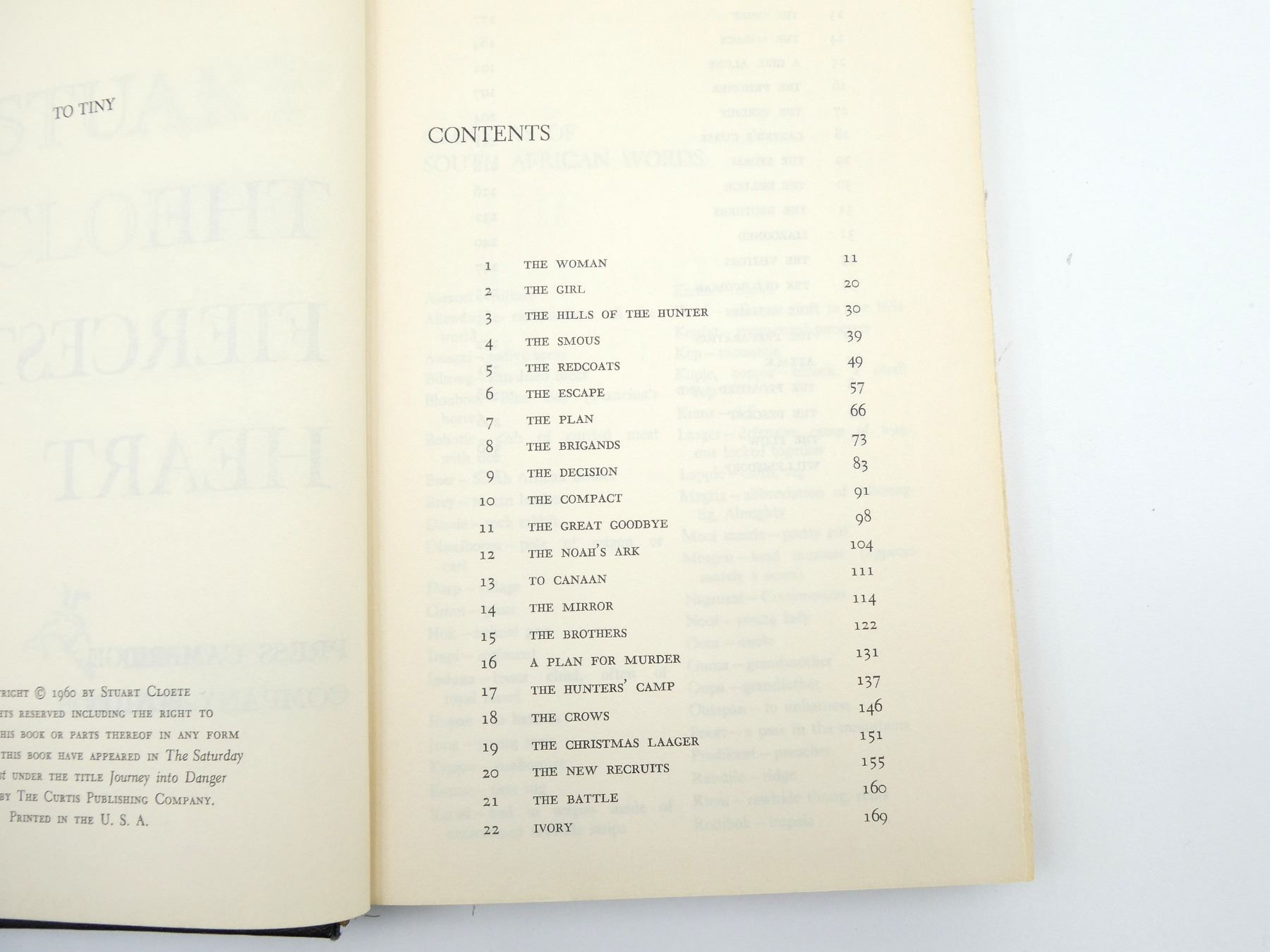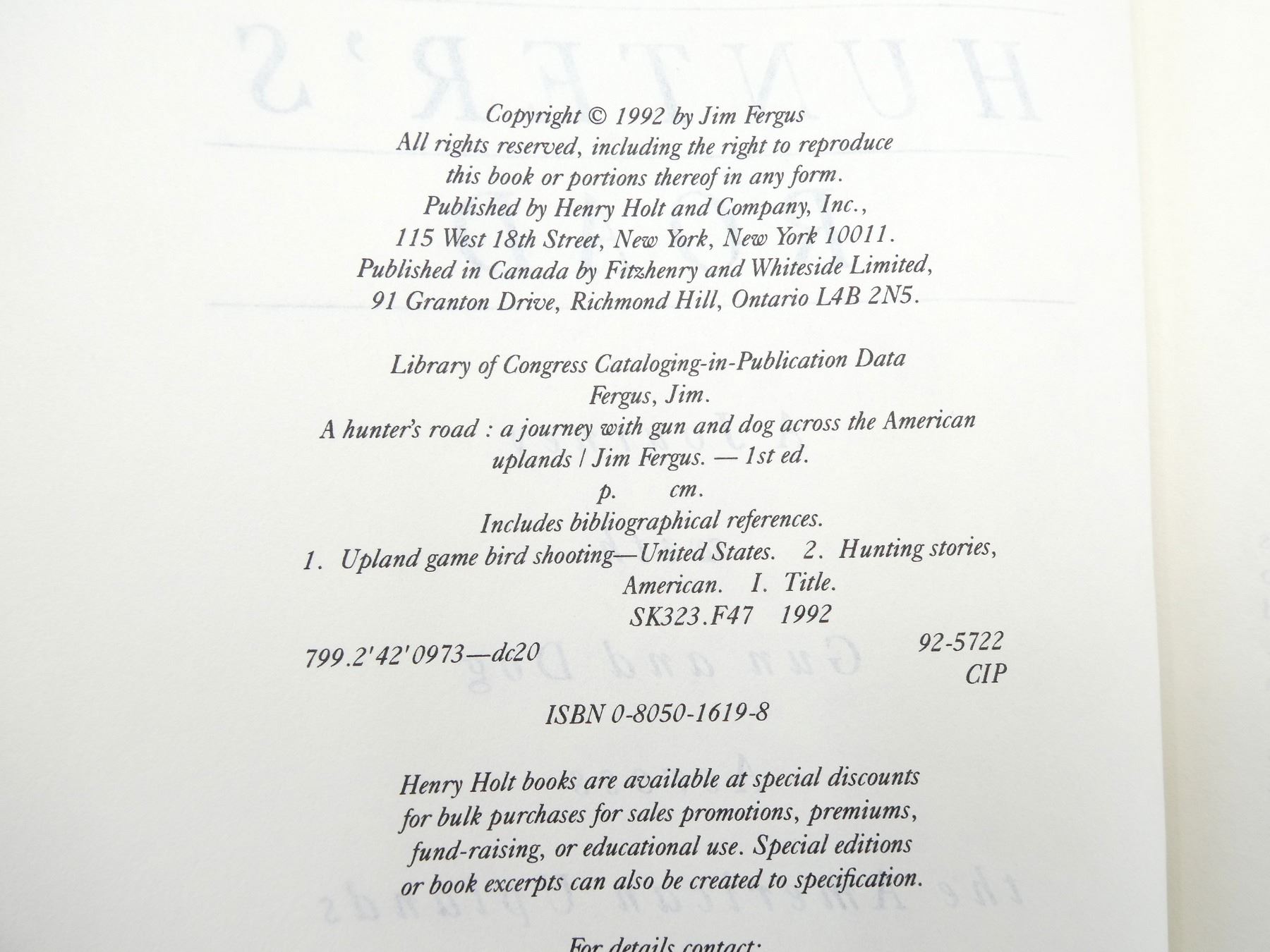LOT INCLUDES; (1) "THE HEART OF THE HUNTER" BOOK BY EDISON MARSHALL, HARD COVER WITH DUST COVER, COPYRIGHT 1956, (1) "A HUNTER'S ROAD, A JOURNEY WITH GUN AND DOG ACROSS THE AMERICAN UPLANDS" BOOK BY JIM FERGUS, HARD COVER WITH DUST COVER, ISBN: 0-8050-1619-8 & (1) "THE FIERCEST HEART" BOOK BY STUART CLOETE, HARD COVER, COPYRIGHT 1960. SEE PHOTOS.