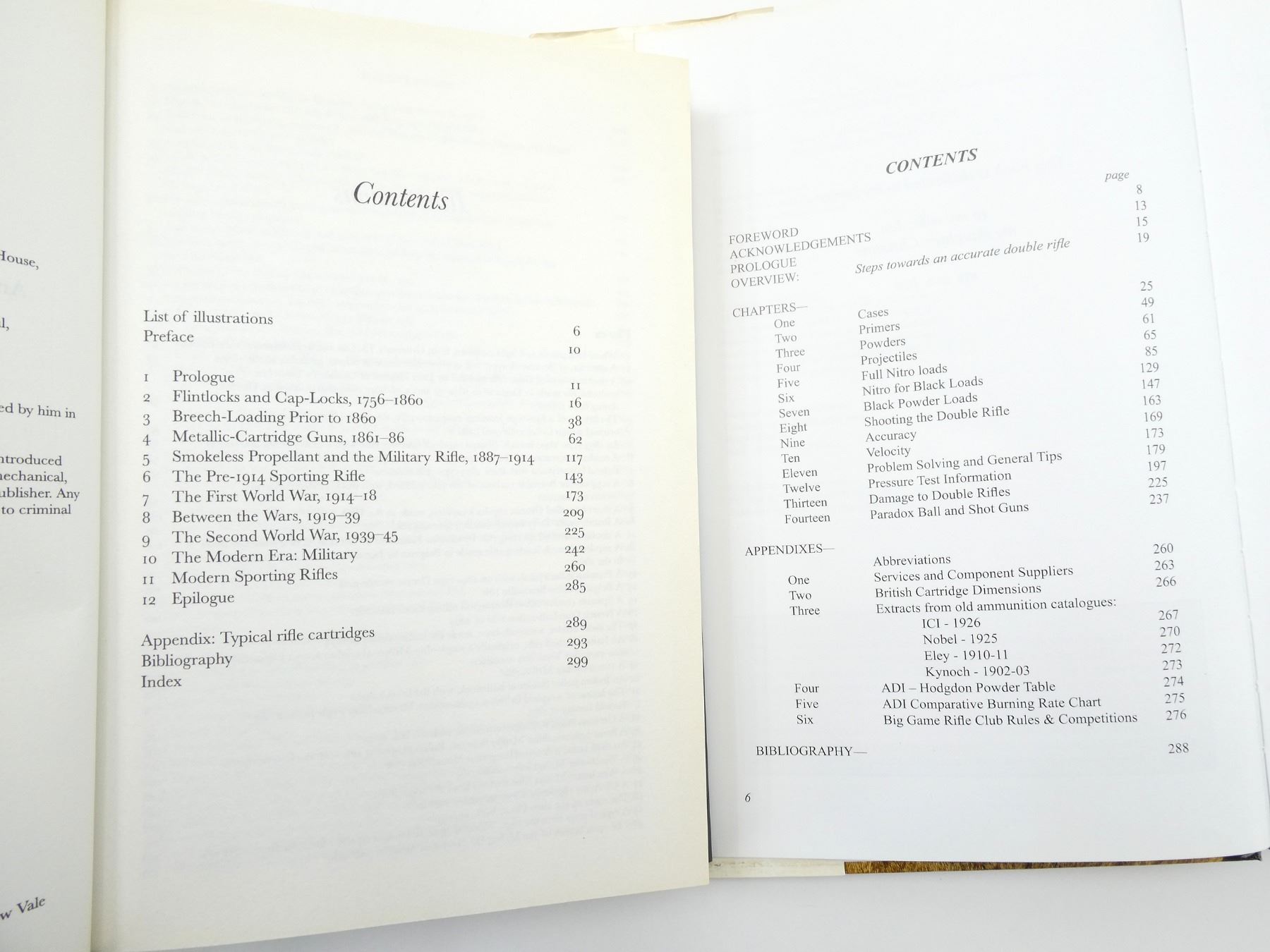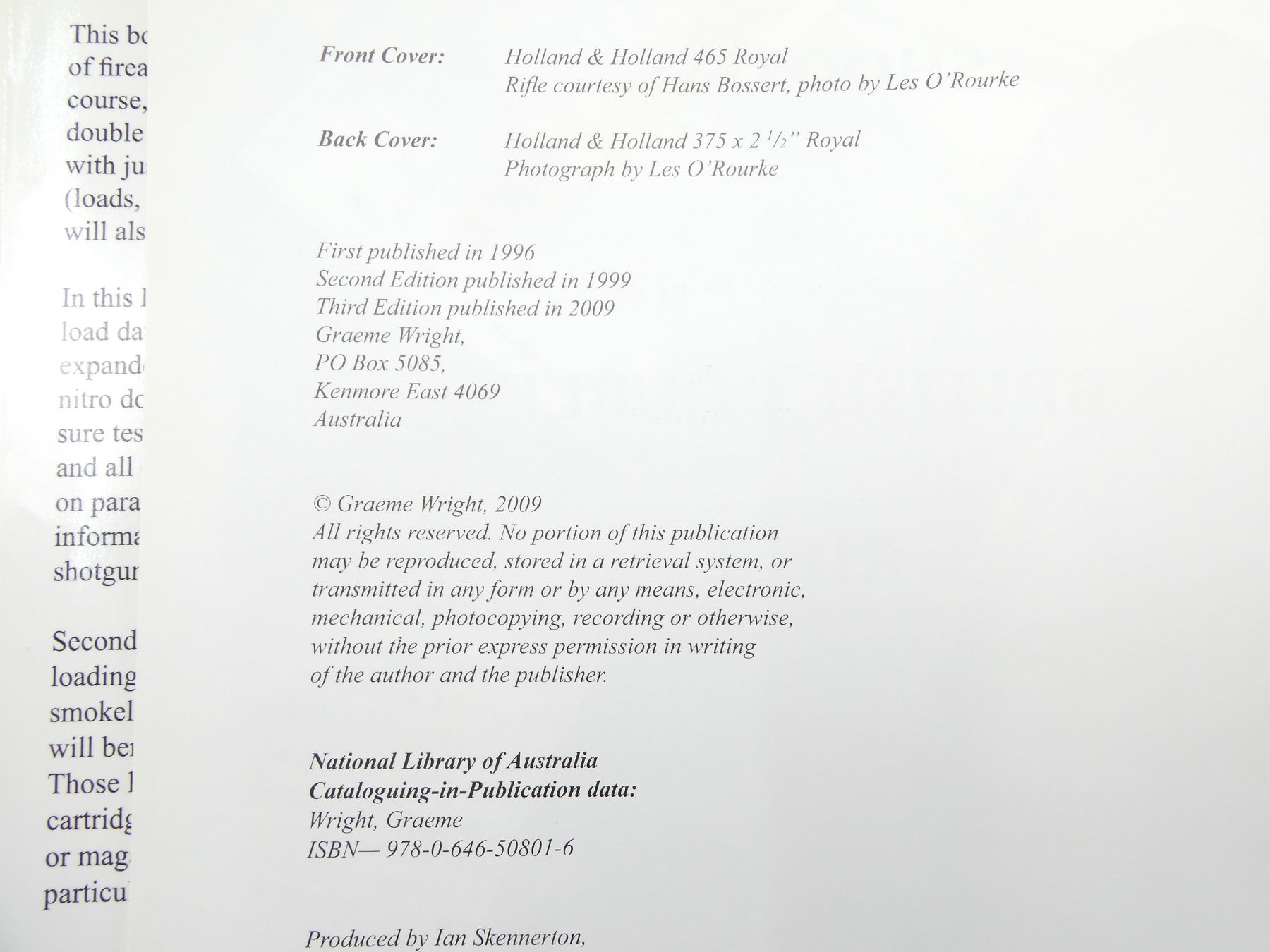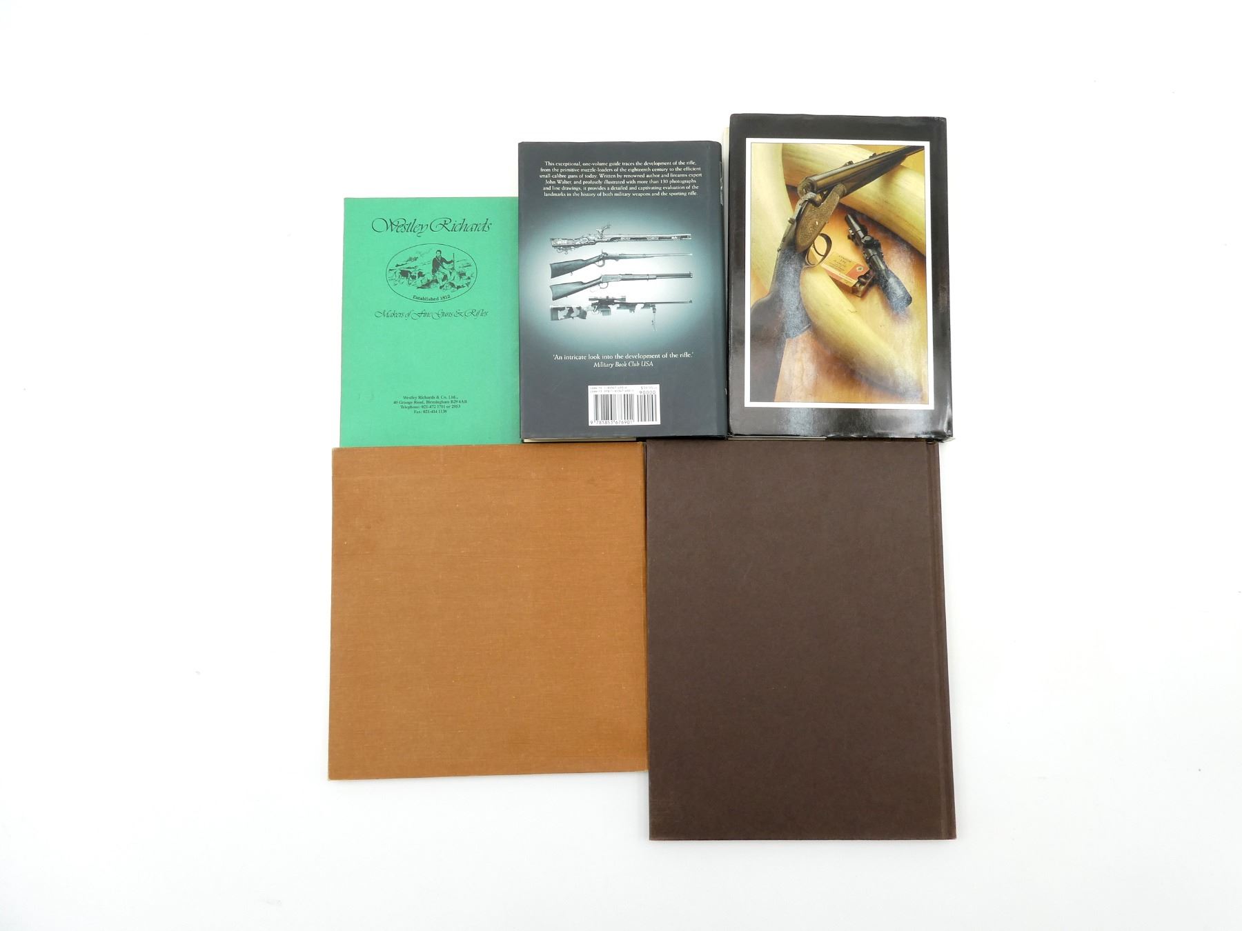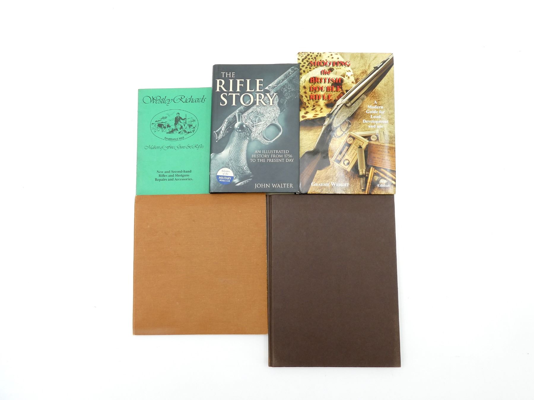 LOT INCLUDES; (1) "SHOOTING THE BRITISH DOUBLE RIFLE, A MODERN GUIDE FOR LOAD DEVELOPMENT AND USE" BOOK BY GRAEME WRIGHT, HARD COVER WITH DUST COVER, THIRD EDITION, ISBN: 978-0-646-50801-6, (1) "THE RIFLE STORY, AN ILLUSTRATED HISTORY FROM 1756 TO THE PRESENT DAY" BOOK BY JOHN WALTER, HARD COVER WITH DUST COVER, ISBN: 978-1-85367-960-1, (1) "AMERICA'S PREMIER GUNMAKERS, BROWNING" BOOK BY K.D. KIRKLAND, HARD COVER, ISBN: 8-86124-515-6, (1) "WESTLEY RICHARDS" CATALOGUE, SOFT COVER, 1991, ETC. SEE PHOTOS.