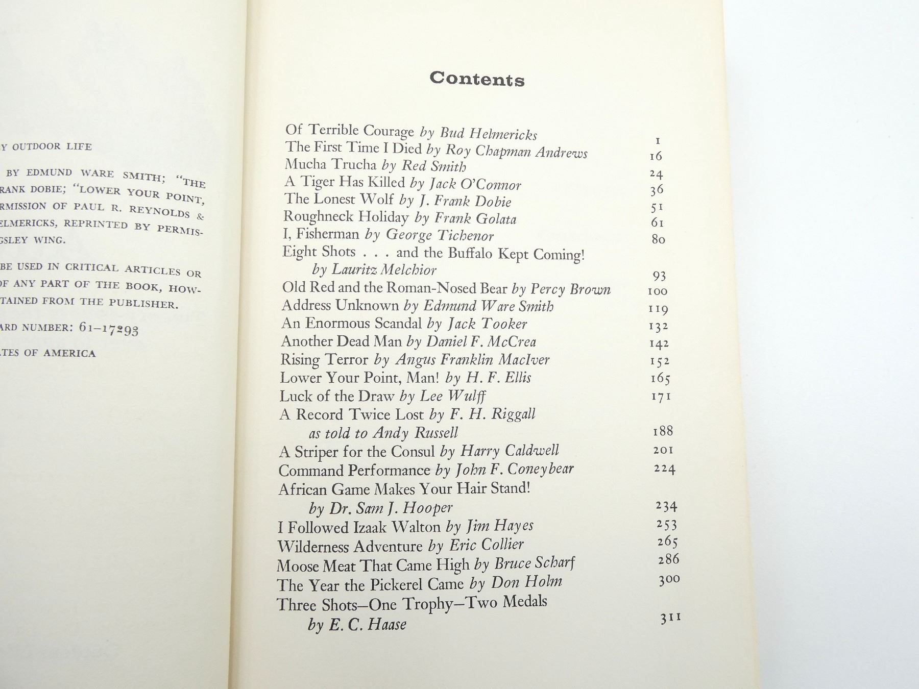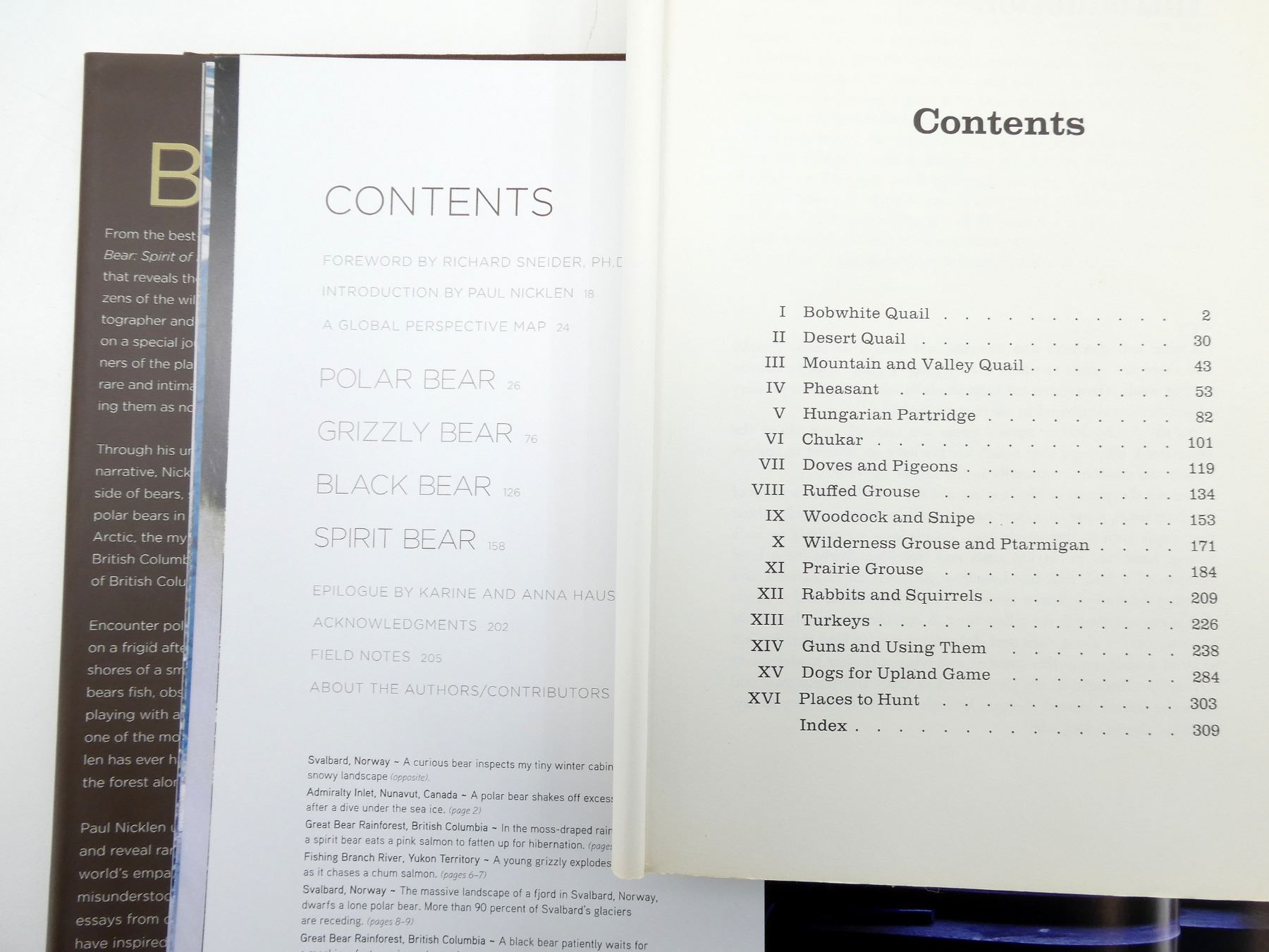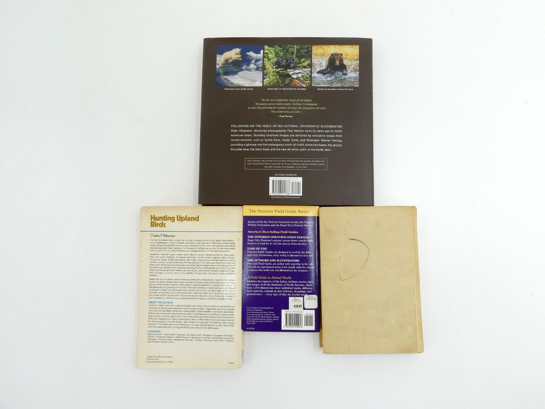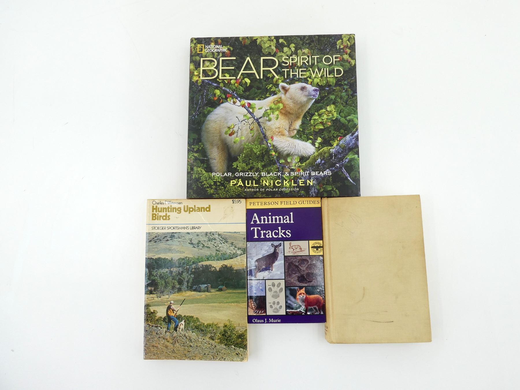 LOT INCLUDES; (1) "PETERSON FIELD GUIDES, ANIMAL TRACKS" BOOK BY OLAUS J. MURIE, SOFT COVER, ISBN: 0-395-91094-3, (1) "HUNTING UPLAND BIRDS" BOOK BY CHARLES F. WATERMAN, SOFT COVER, ISBN: 0-88317-051-5, (1) "BEAR, SPIRIT OF THE WILD" BOOK BY PAUL NICKLEN, HARD COVER WITH DUST COVER, ISBN: 978-1-4262-1176-8 & (1) "GREAT OUTDOOR ADVENTURES" BOOK BY OUTDOOR LIFE, HARD COVER, COPYRIGHT 1961. SEE PHOTOS.